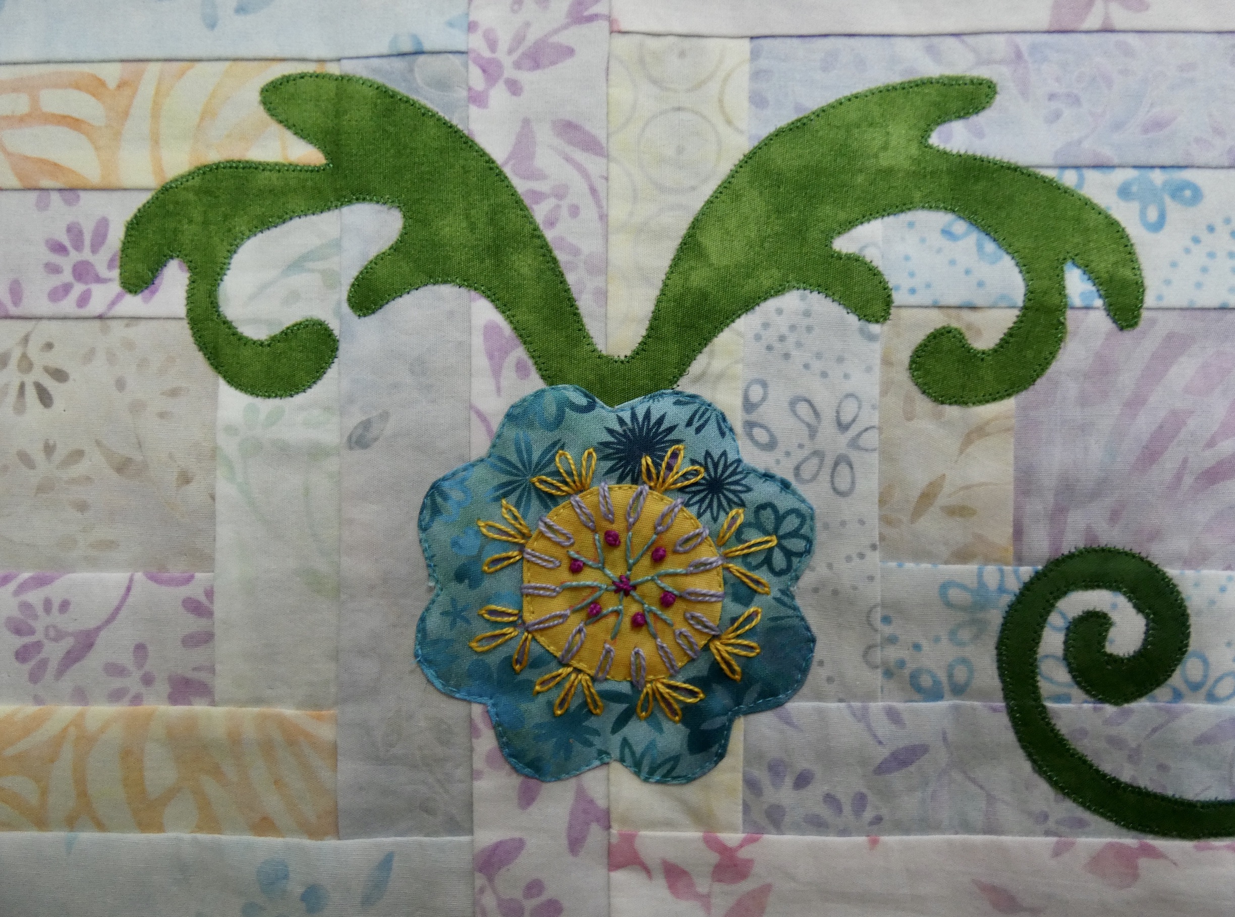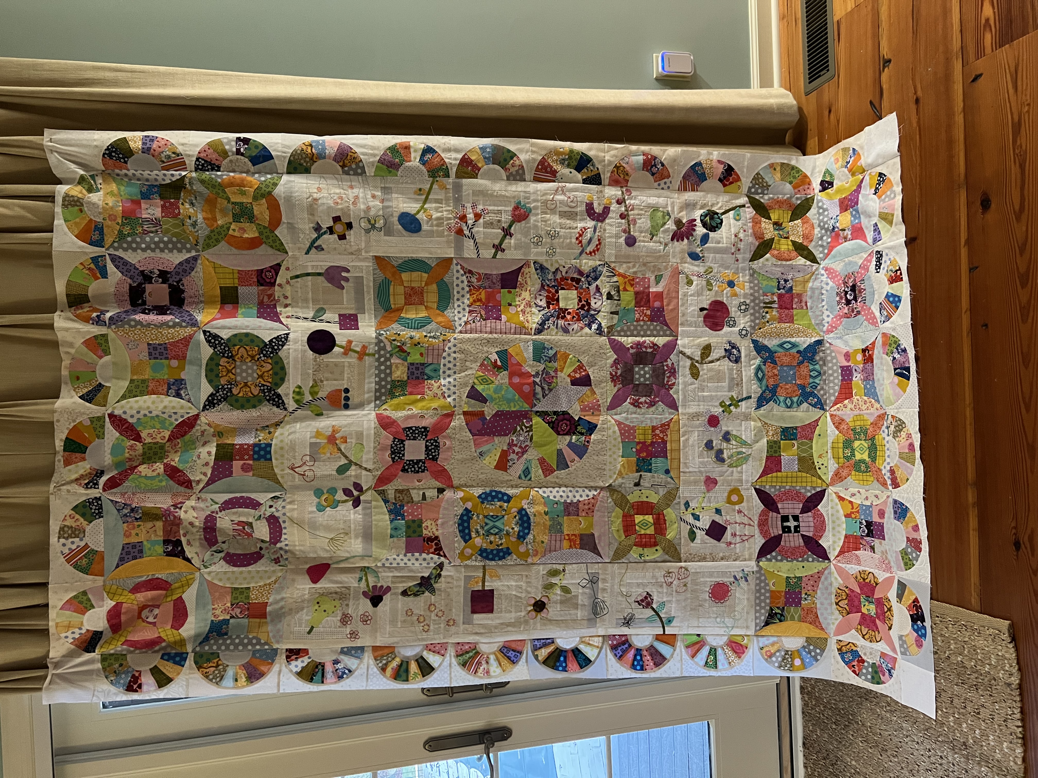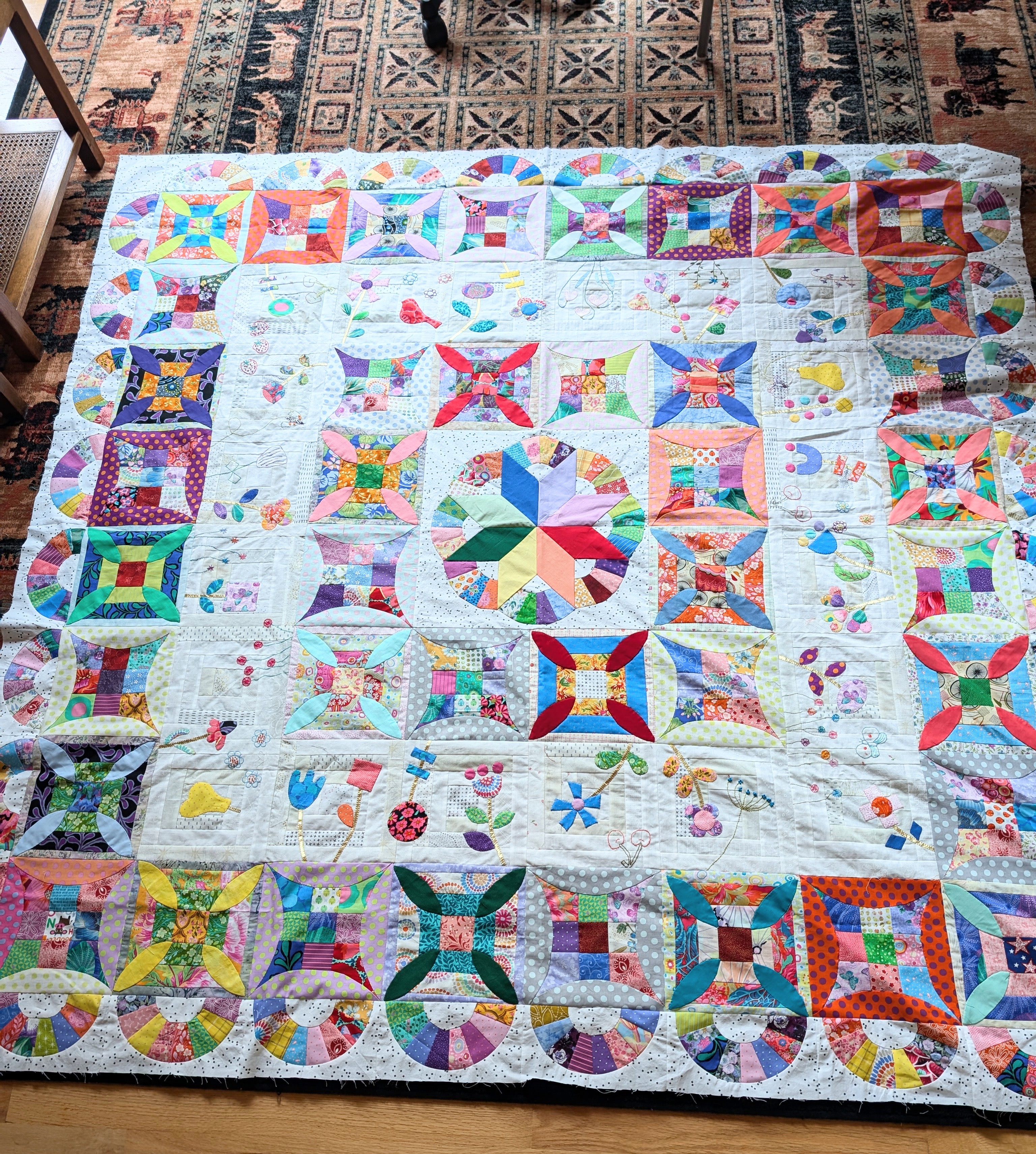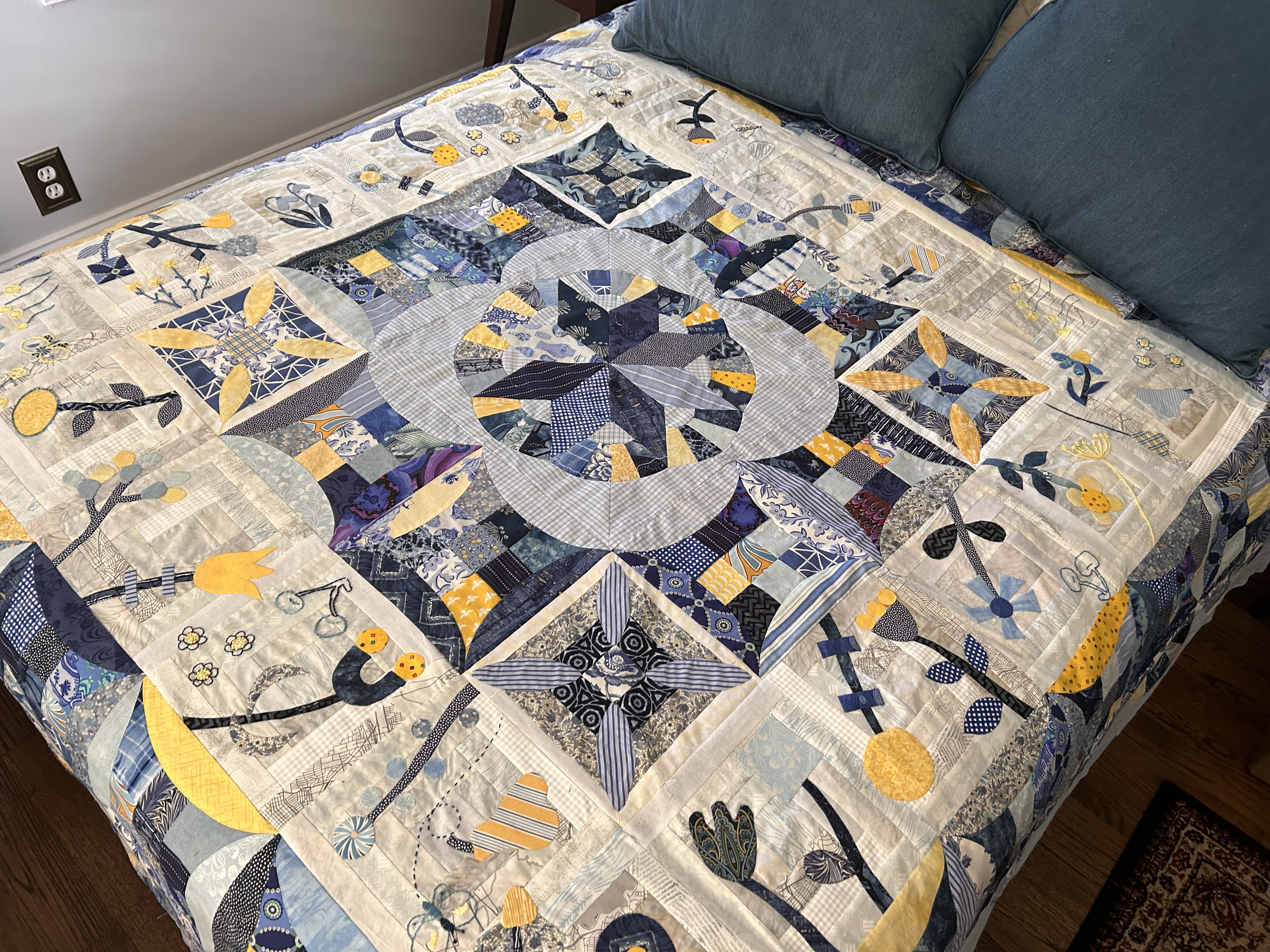 My Pick A Petal top is done! Not quilted yet… still deciding whether to do it myself or have a friend long arm it. Frankly, after working on this for a year, I’m ready for it to be out of my studio! Right now it’s on its final destination - our guest room bed. To do that I had to add another border for the right size. I enjoyed most of the process - the applique and embroidery. Endless pieced blocks not so much!