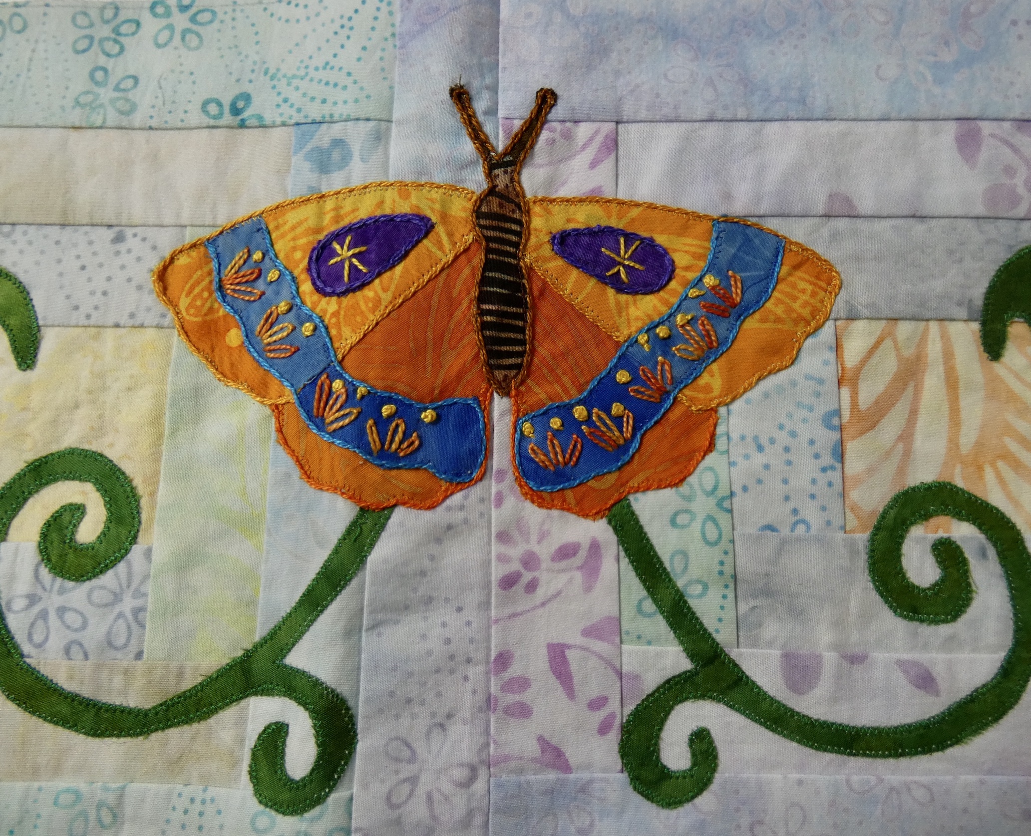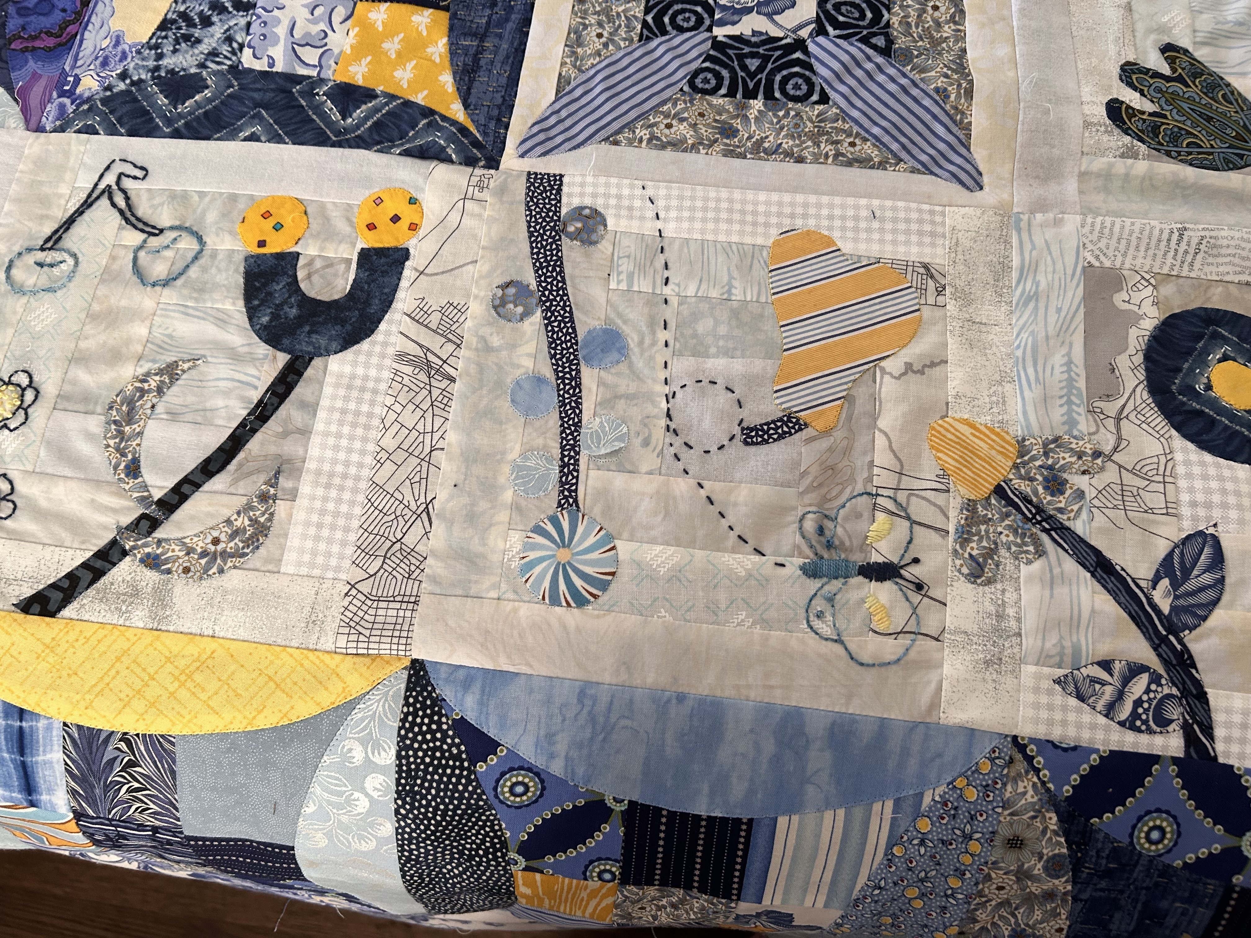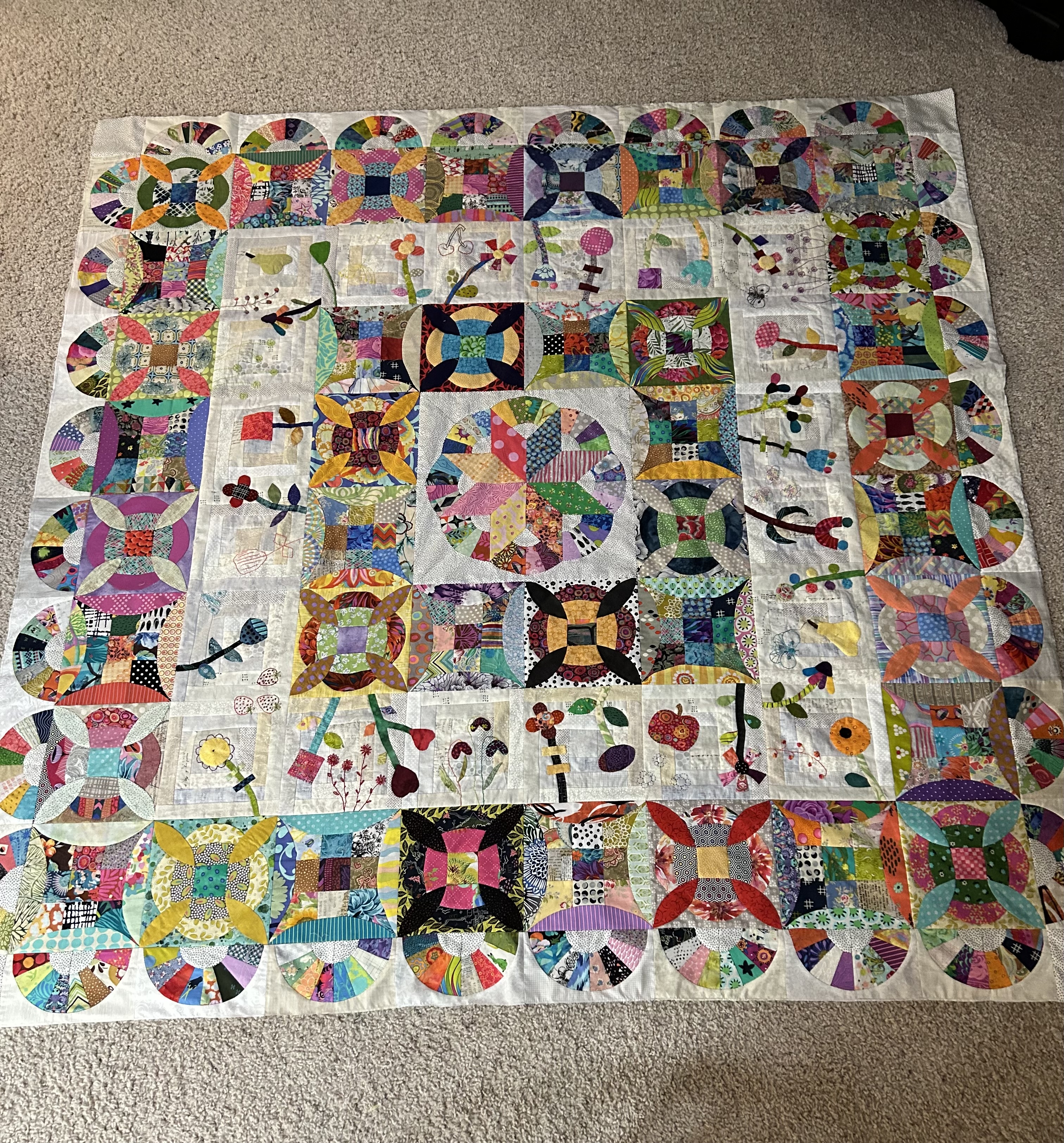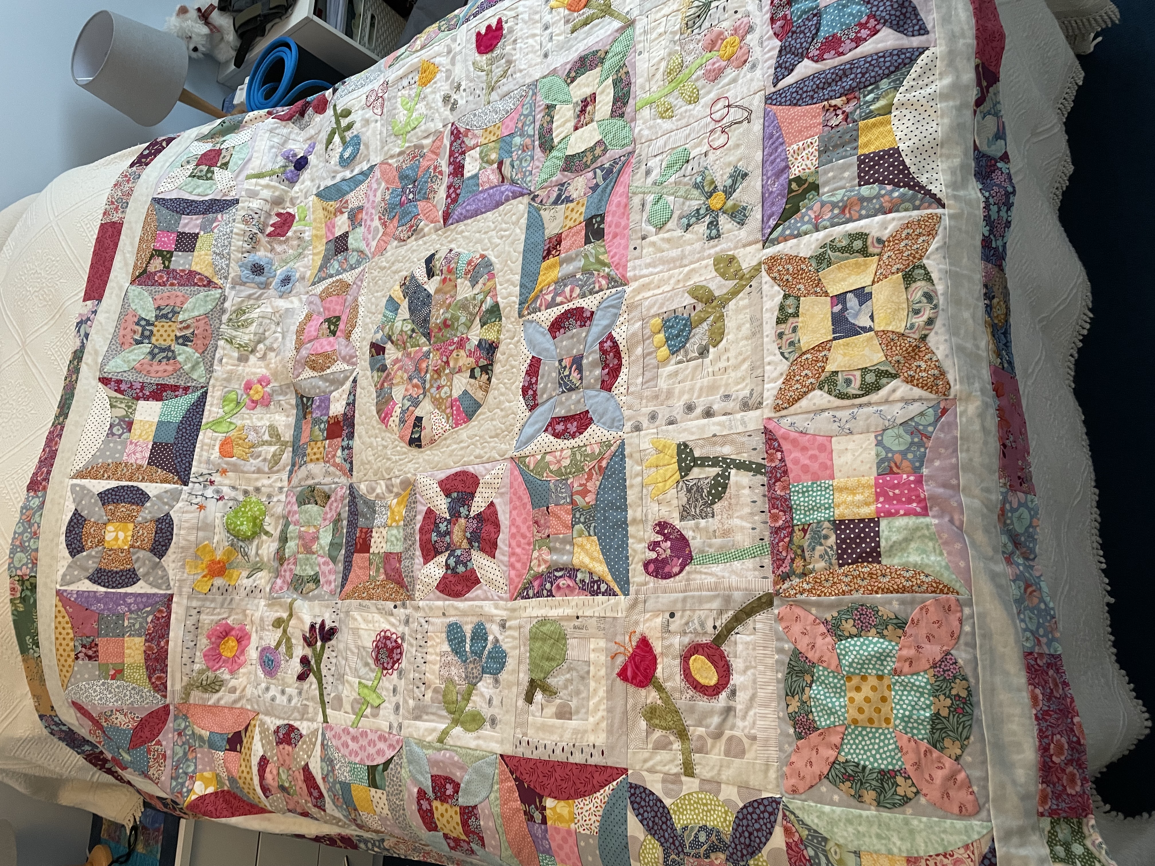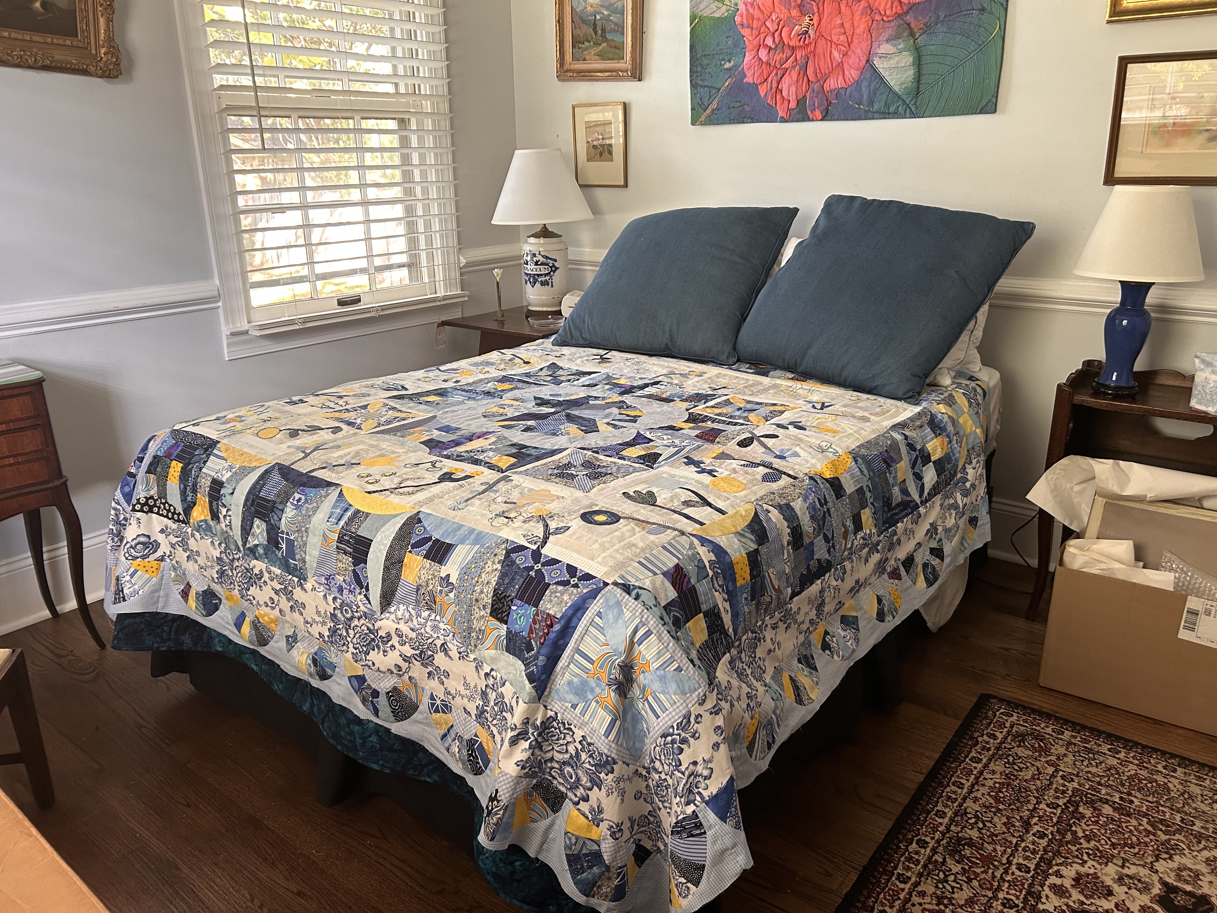 My Pick A Petal top is done! Not quilted yet… still deciding whether to do it myself or have a friend long arm it. Frankly, after working on this for a year, I’m ready for it to be out of my studio! Right now it’s on its final destination - our guest room bed. To do that I had to add another border for the right size. I enjoyed most of the process - the applique and embroidery. Endless pieced blocks not so much!