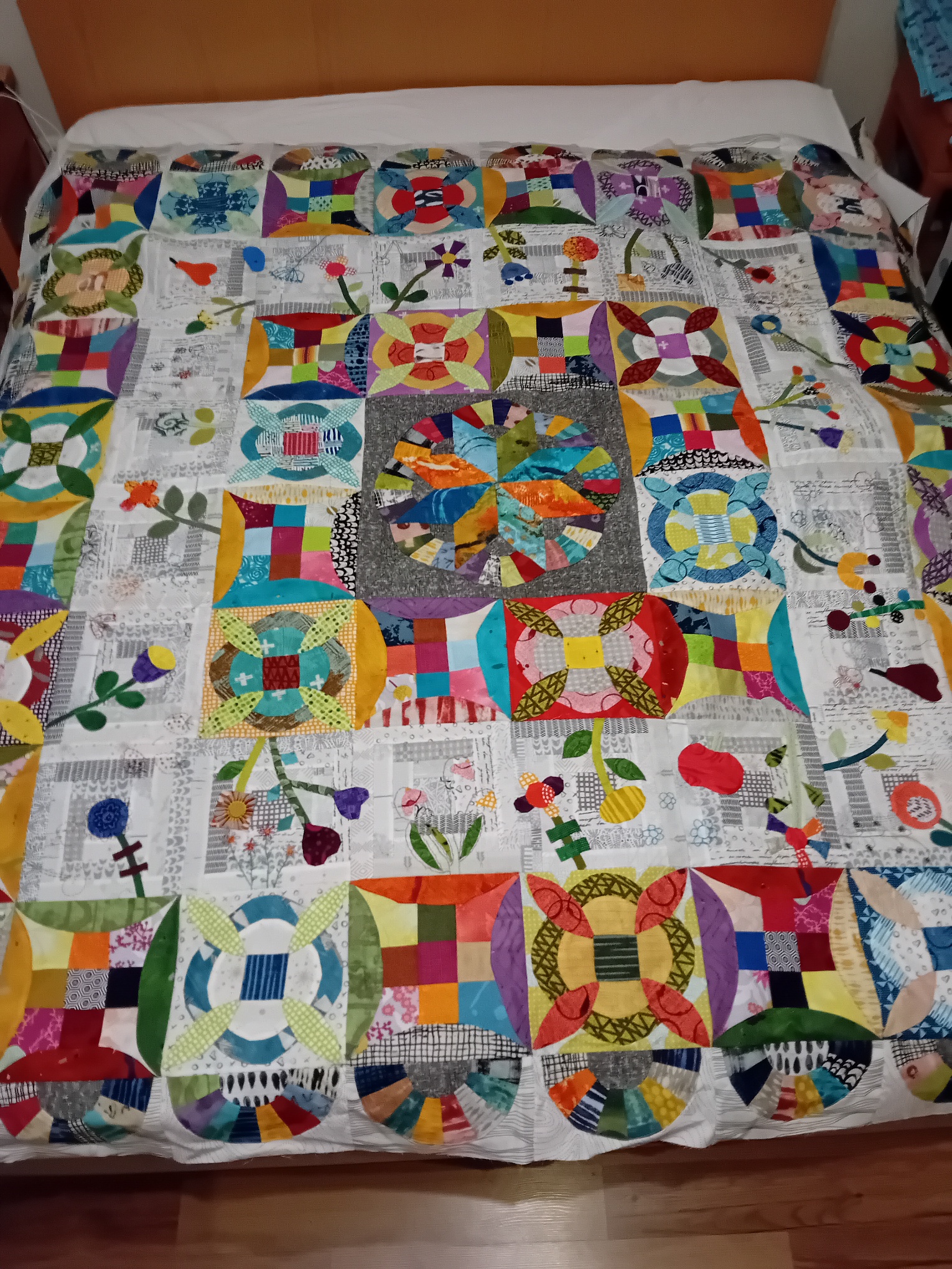 I really love the colour theme in your quilt. It's so organised and well planned. Mine is still underway after many hold-ups throughout the year. It is very scrappy and I really don't like the overall effect as much as a planned combination of colours as in your quilt. Congratulations!