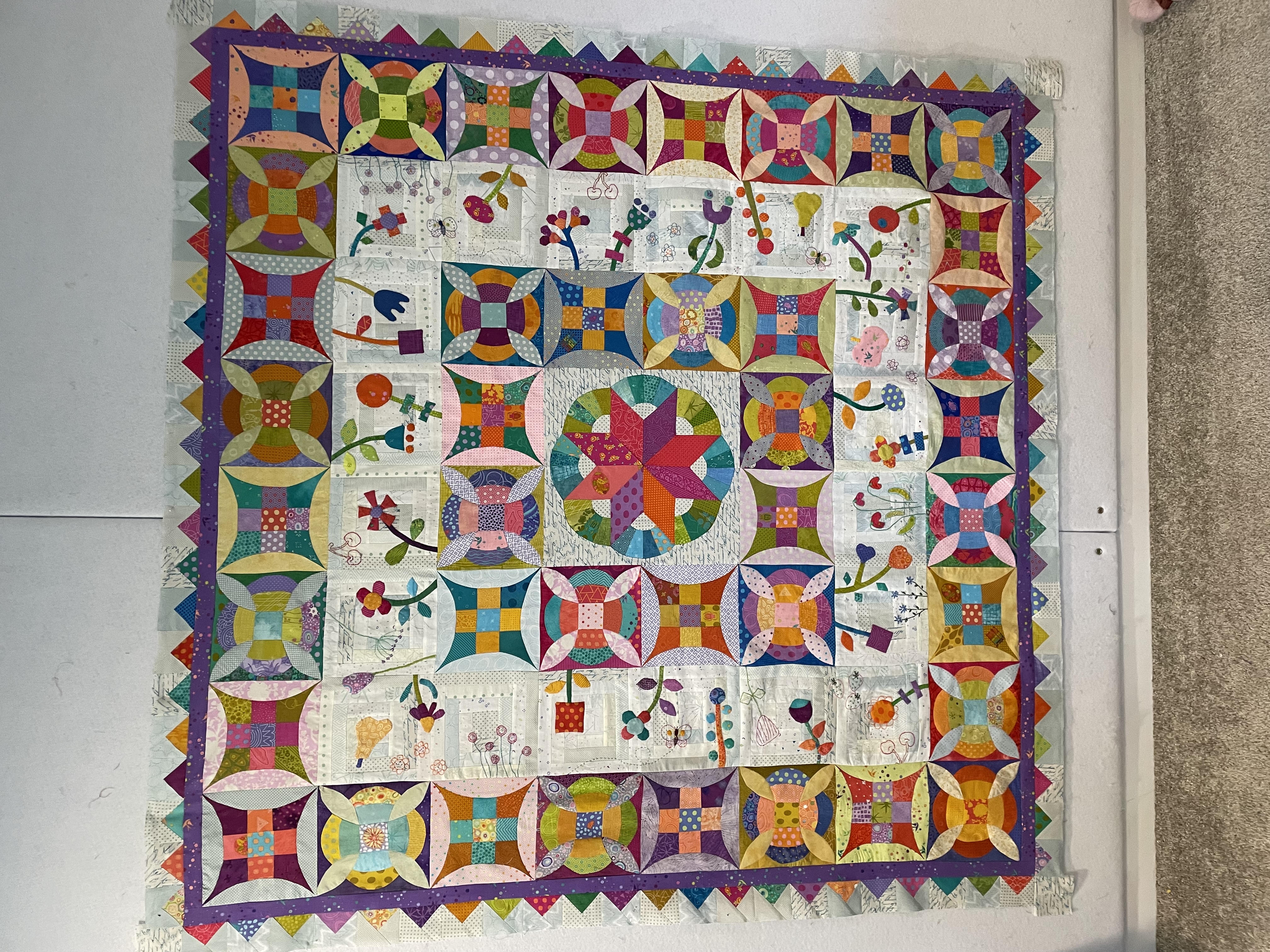 Finally got the top finished. It’s in need for a good pressing but that can wait until I’m ready to baste it together. Posting pics now as it could be a while before completely finished. I have never hand quilted and decided that that’s how I want to finish it. Now to learn how to hand quilting, another of many firsts for me in this quilt. Thanks Jen for the pattern and Barbara for your tutorials.
