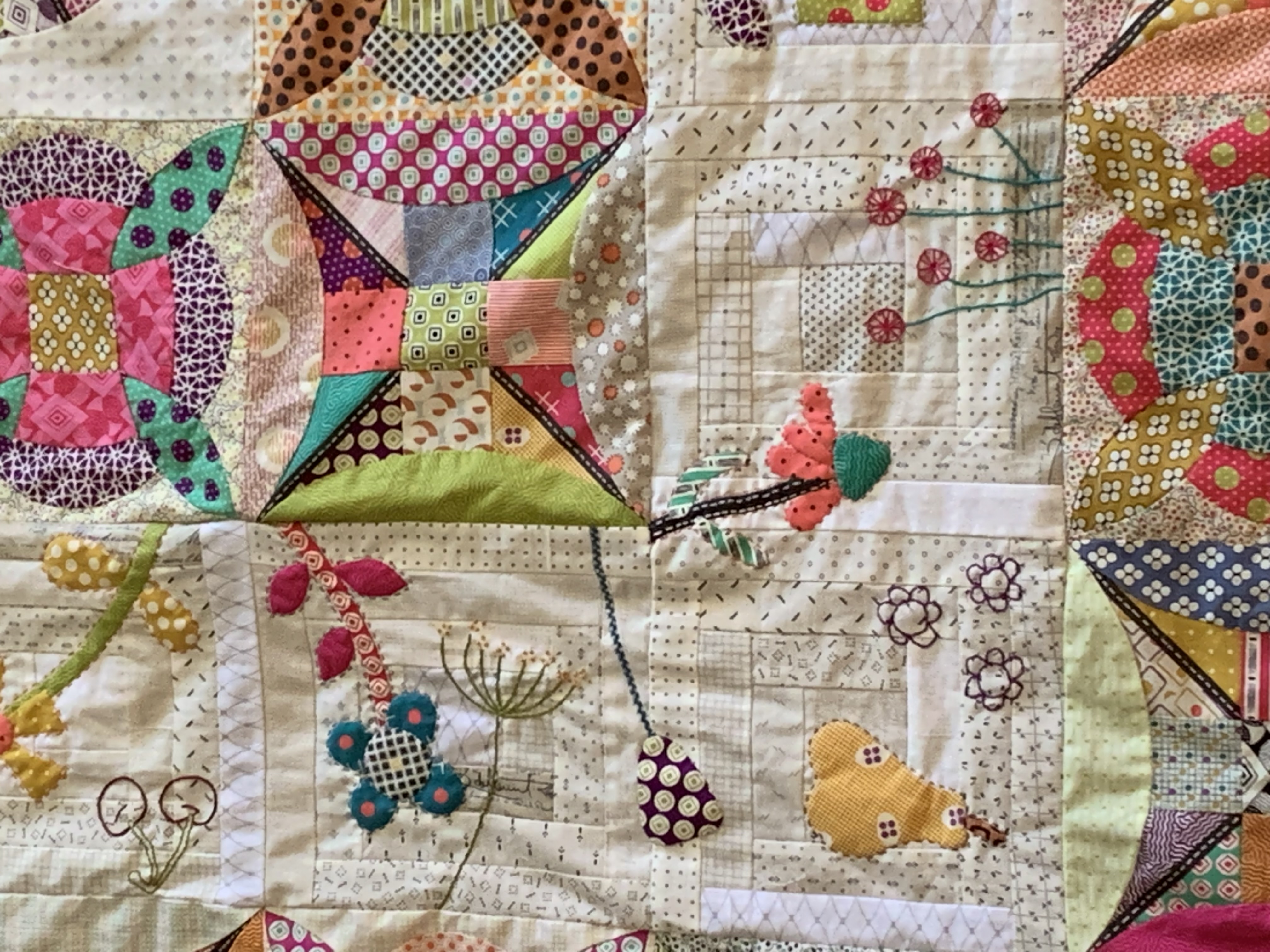 I arranged the blocks differently to create a secondary pattern. My mom's favorite hymn was "In The Garden". The fussy cut fabrics are garden related, and include my grandma's hand-embroidered handkerchiefs and crocheted doilies. I machine embroidered "flowers" of the words of the hymn