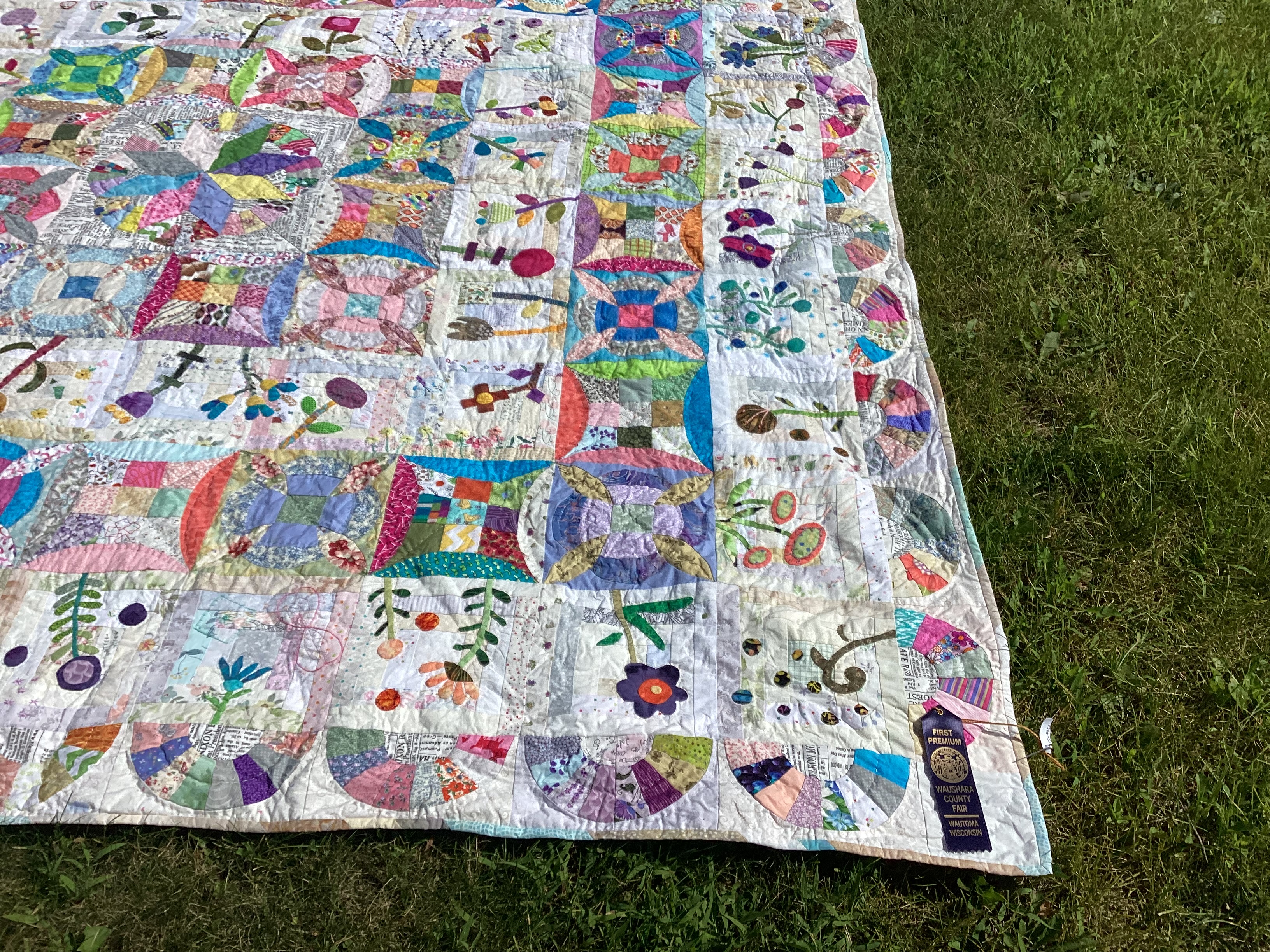 Grand Champion at Local Fair. 3rd time in a row, all Quilt show BOM’s. The Judge and viewers were just in awe about the quilt. They even read my label that described the BOM. Impressed as it is hand pieced, quilted and embroidered all within a year.