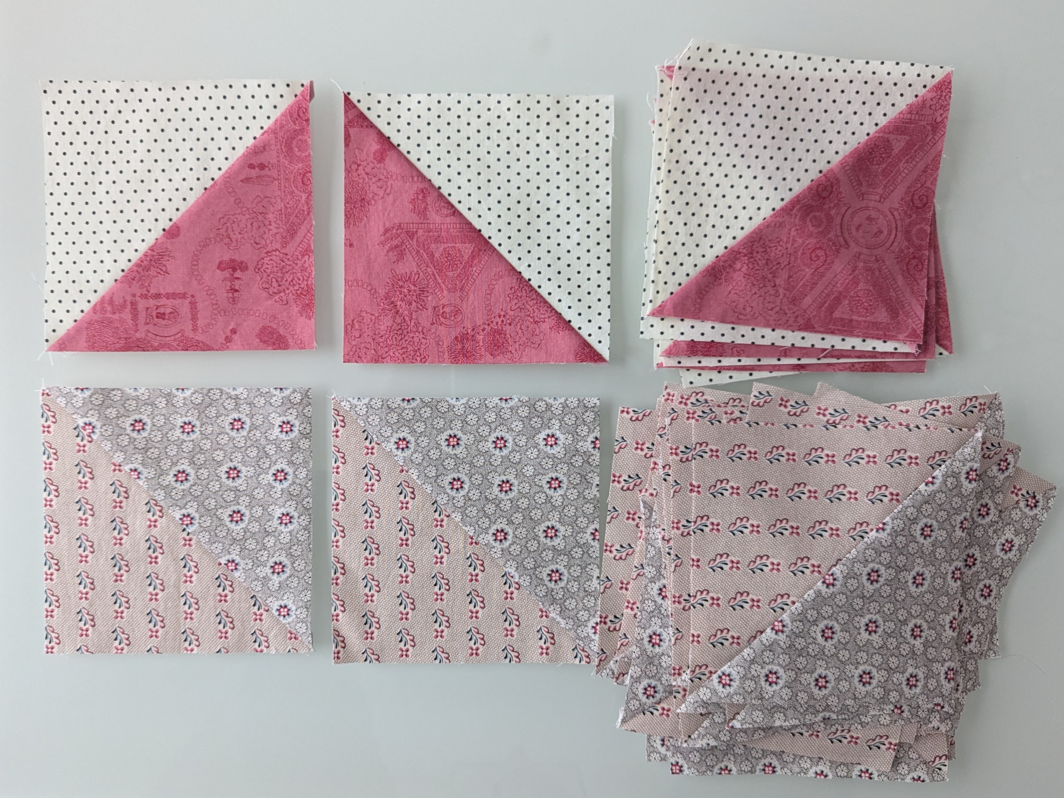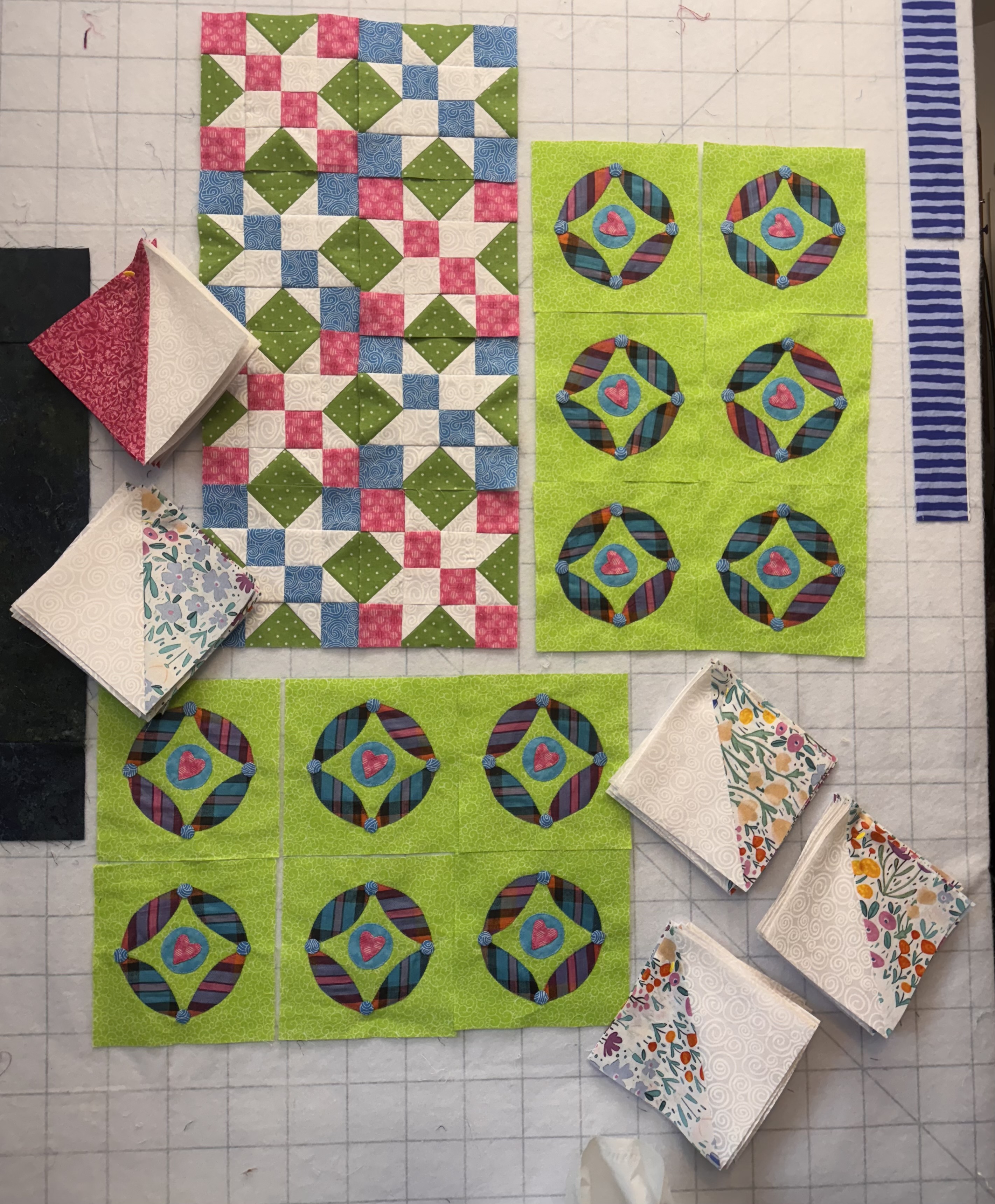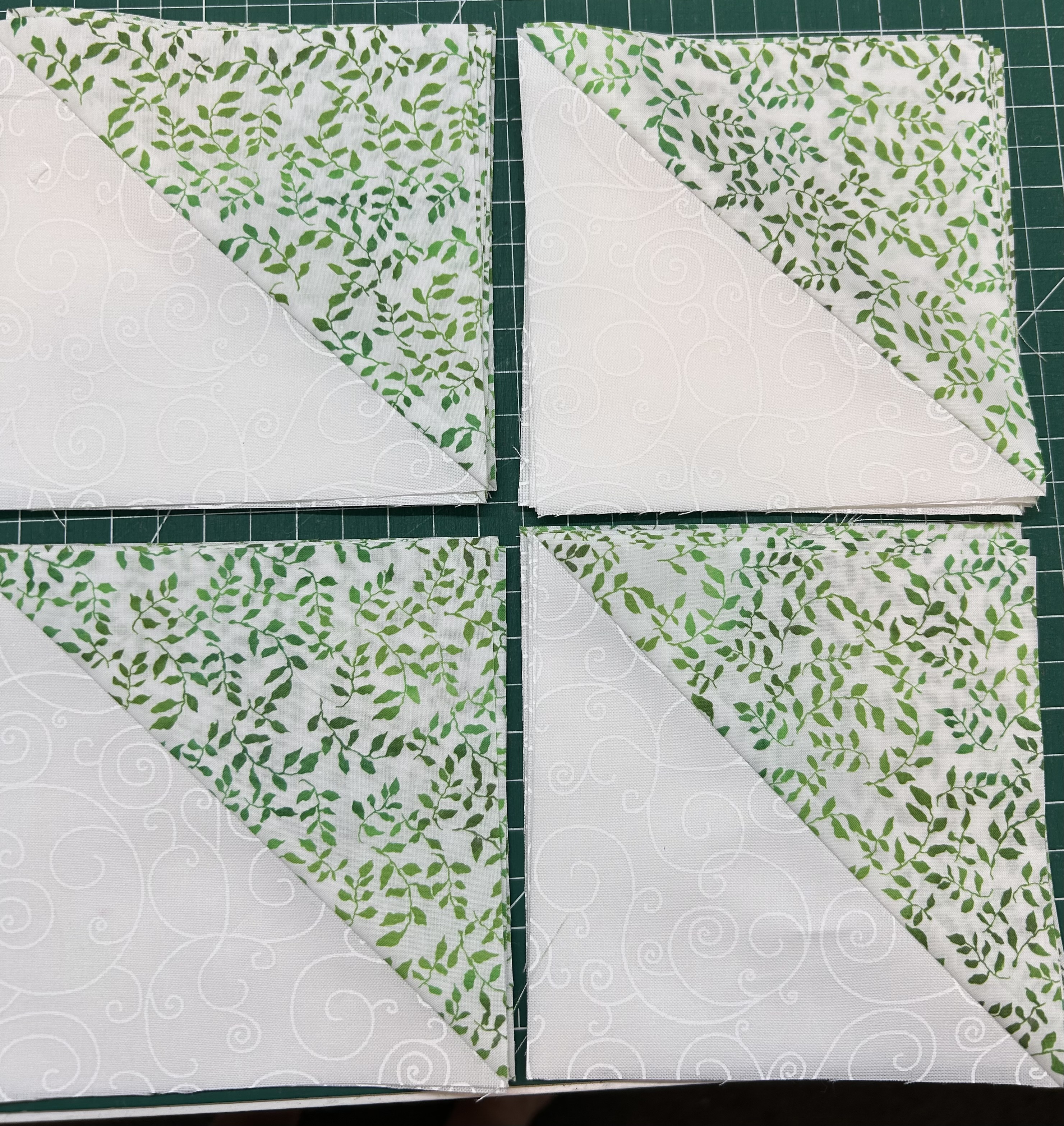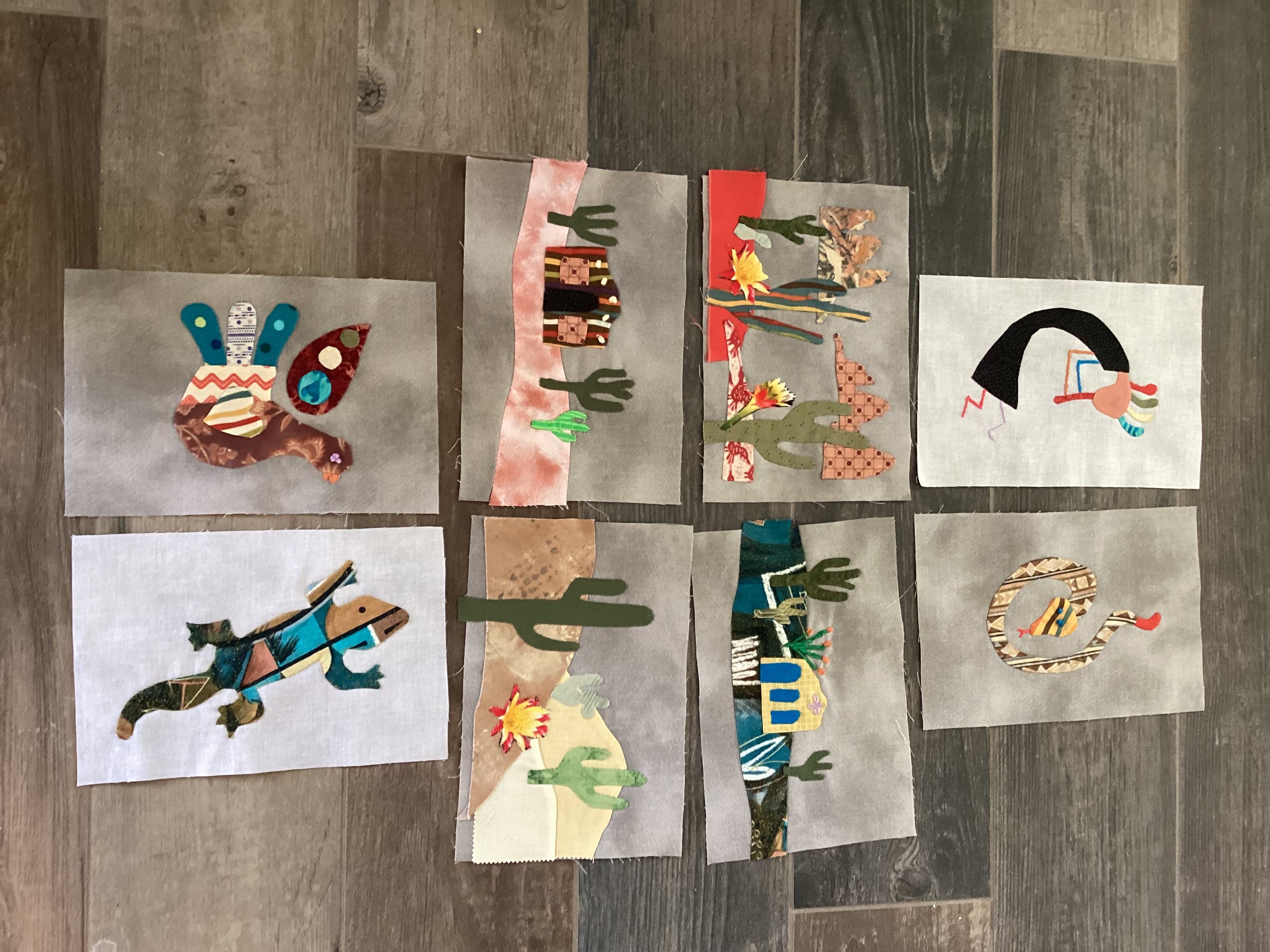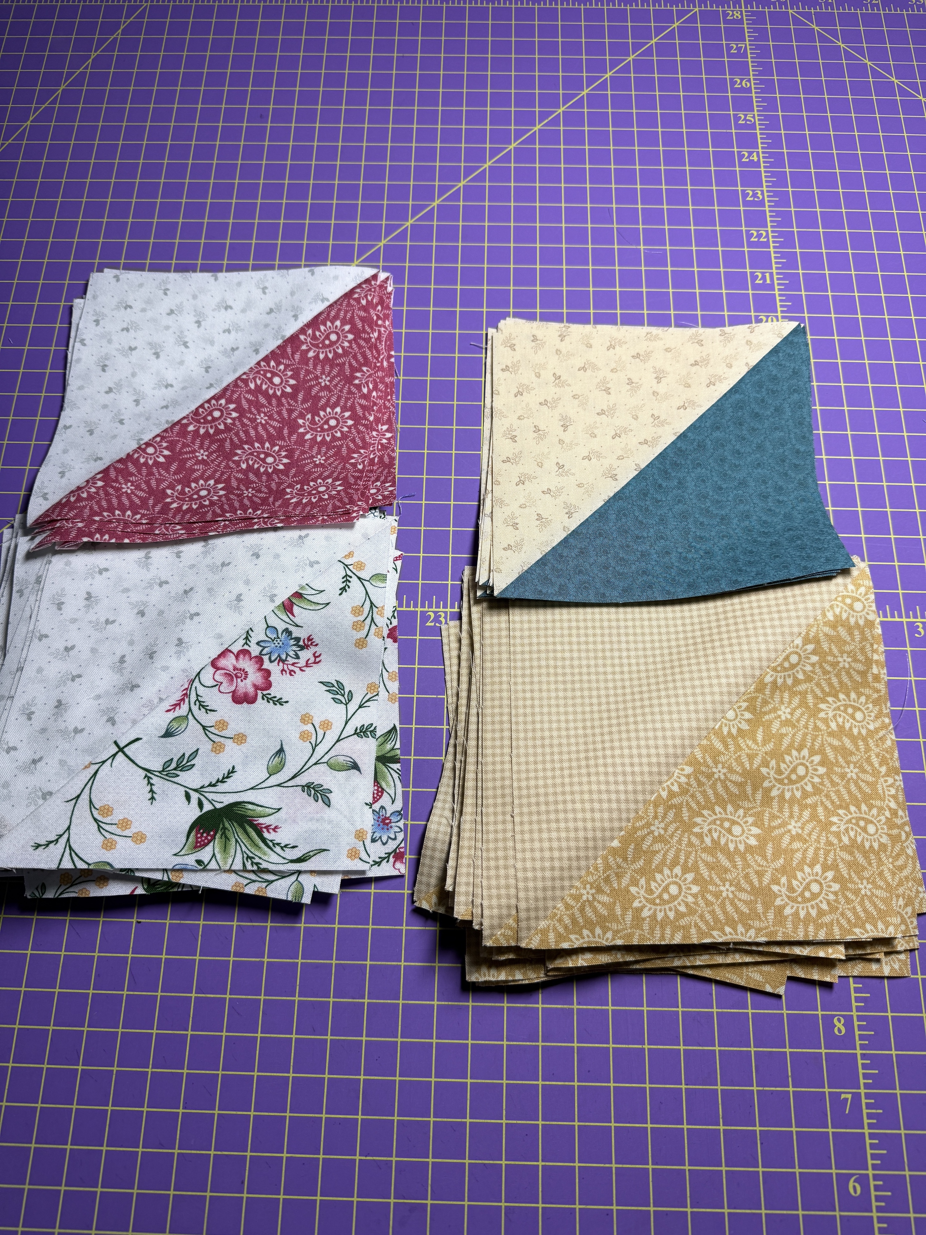 Here are my HST’s. I am going with Southwest theme. I also worked on the other appliqué blocks in the quilt rather than flower theme, They are over sized and will be cut down to correct size when those blocks are released. I am enjoying the story as well. Piecing is done on my treadle machine.Linda H