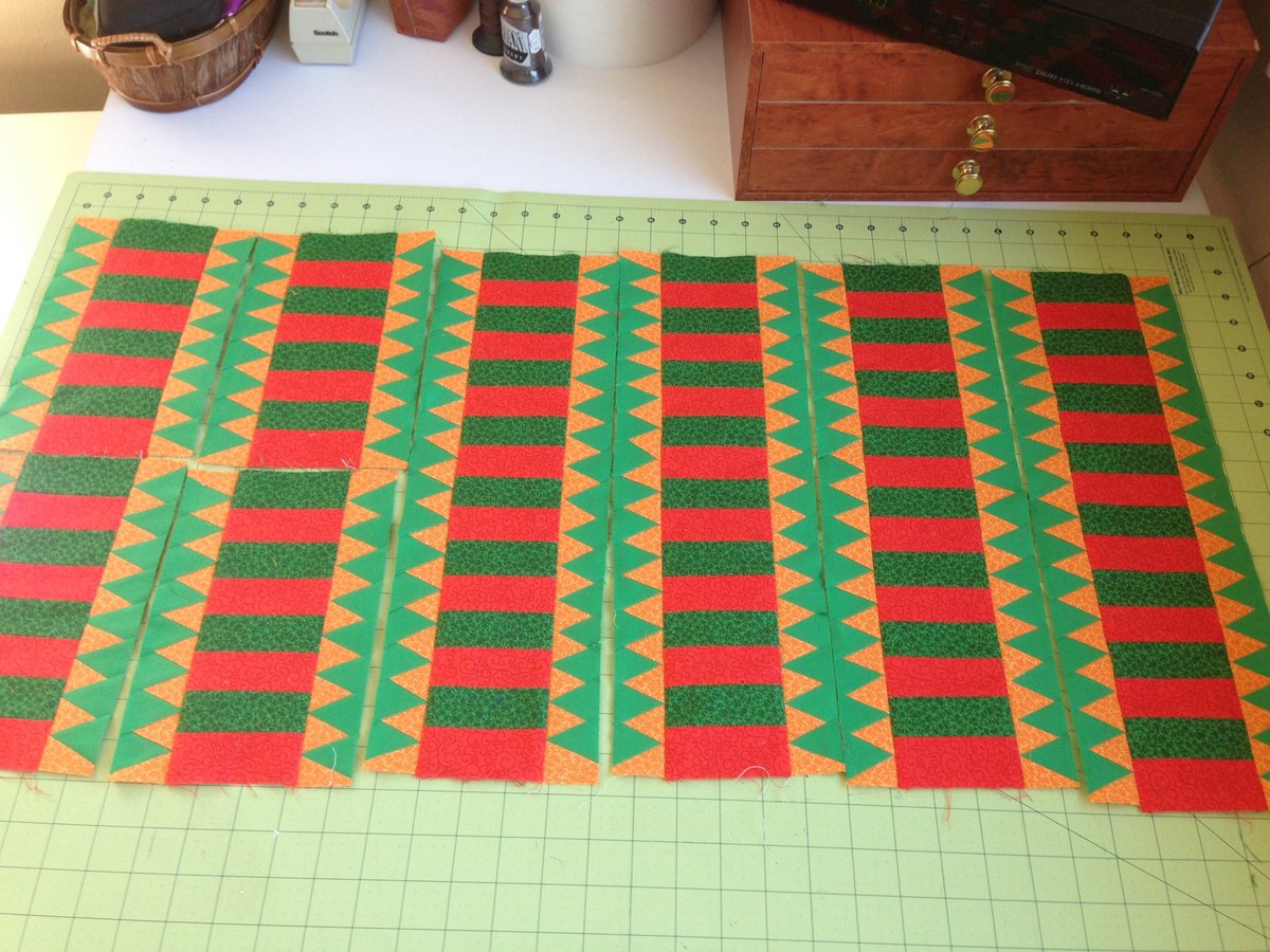 Started part 2 of this last night. Used the 1 3/4 measure to cut my strips as suggested. Gave me enough wiggle room to not struggle when I piecing. Here's how I cut them. Used the template glued to plastic. Marked with a frixon pen then used the ruler and rotary cutter to cut. Each strip gives me 32 pieces and a one big enough for the 1/2 at the end. The frixon pen will disappear when pressed with a hot iron. Generally this is in the seam allowance anyway so it's not a big deal.