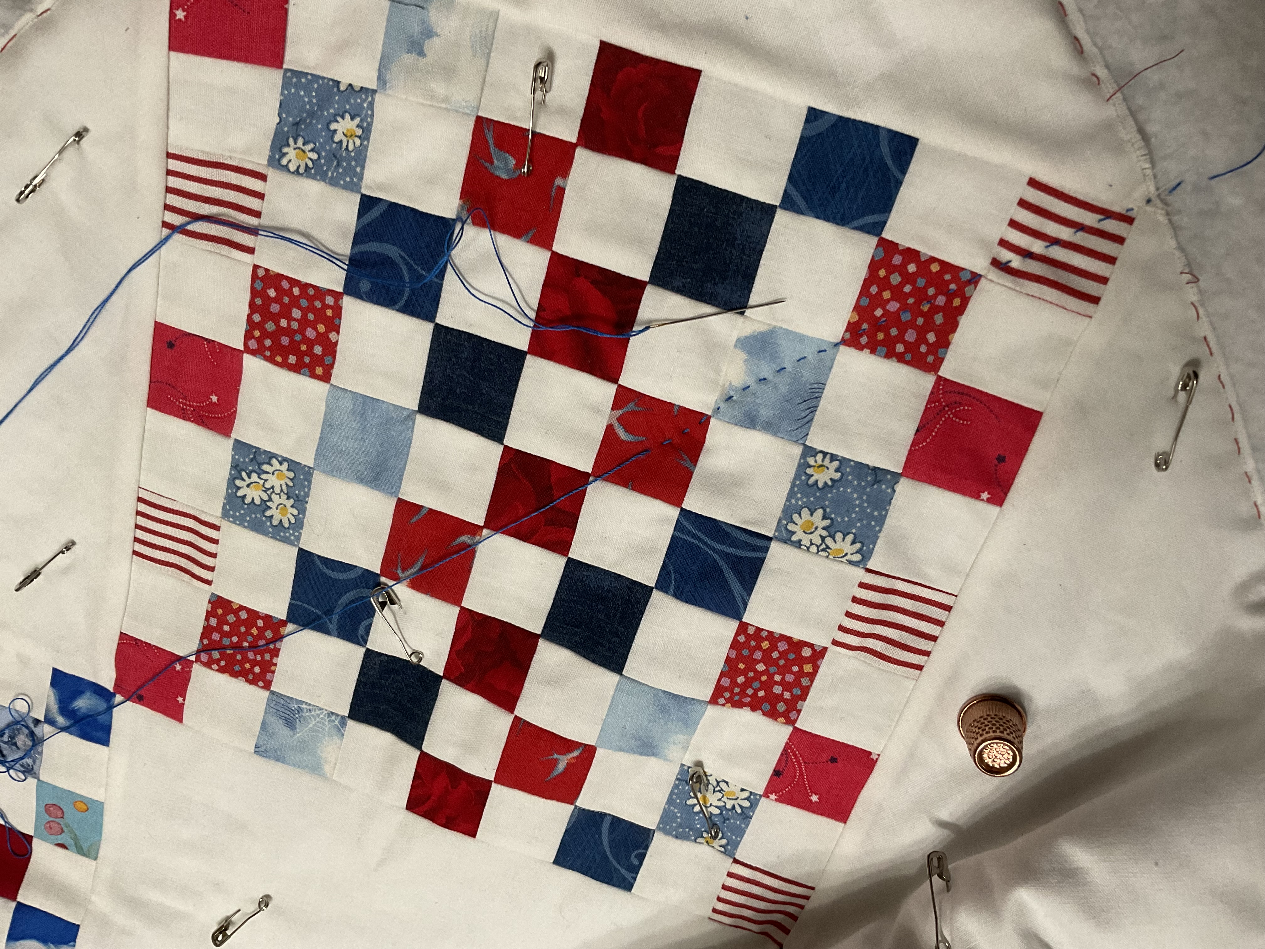 It should measure 76.5 inch square. After watching the Wonderfil video I will stitch in the ditch around the squares with either Invisafil or a white cotton, though some of my seams are pressed open. The quilting will be a serie of vertical and horizontal lines, from edge to edge using different shades of red and blue threads. I decided to use bright threads to create interest in the white alternate squares.