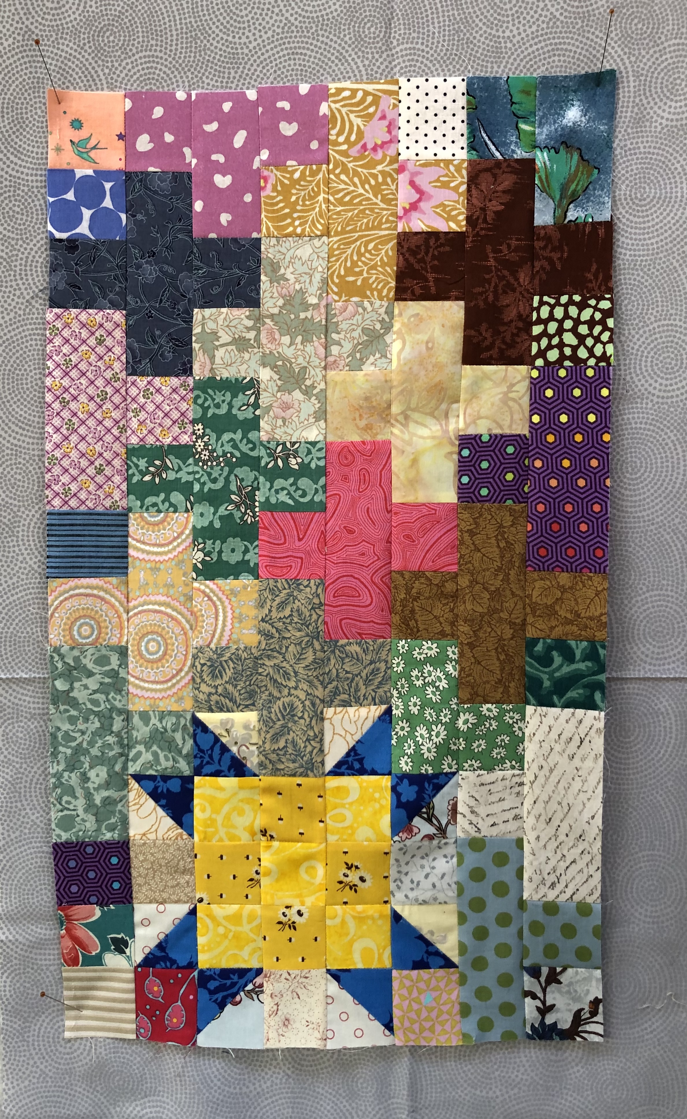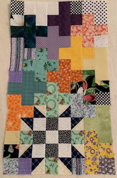 I enjoyed working on the Plus a Star. It was like a puzzle laying it out and piecing it together. Also attaching my other blocks. On Trip Around the World, I strip pieced. No way was I gong to cut 1-1/2 inch little squares and sew them all together. Also, I find the bowtie layout just jumps out at you too much, so I made mine a bit smaller and did a different layout. That's what it's all about, adding your own style.
