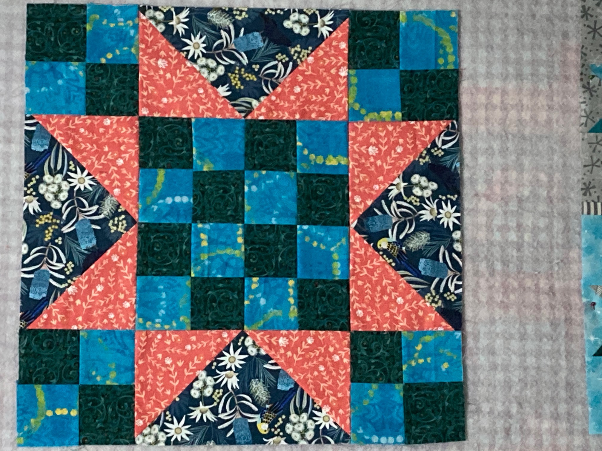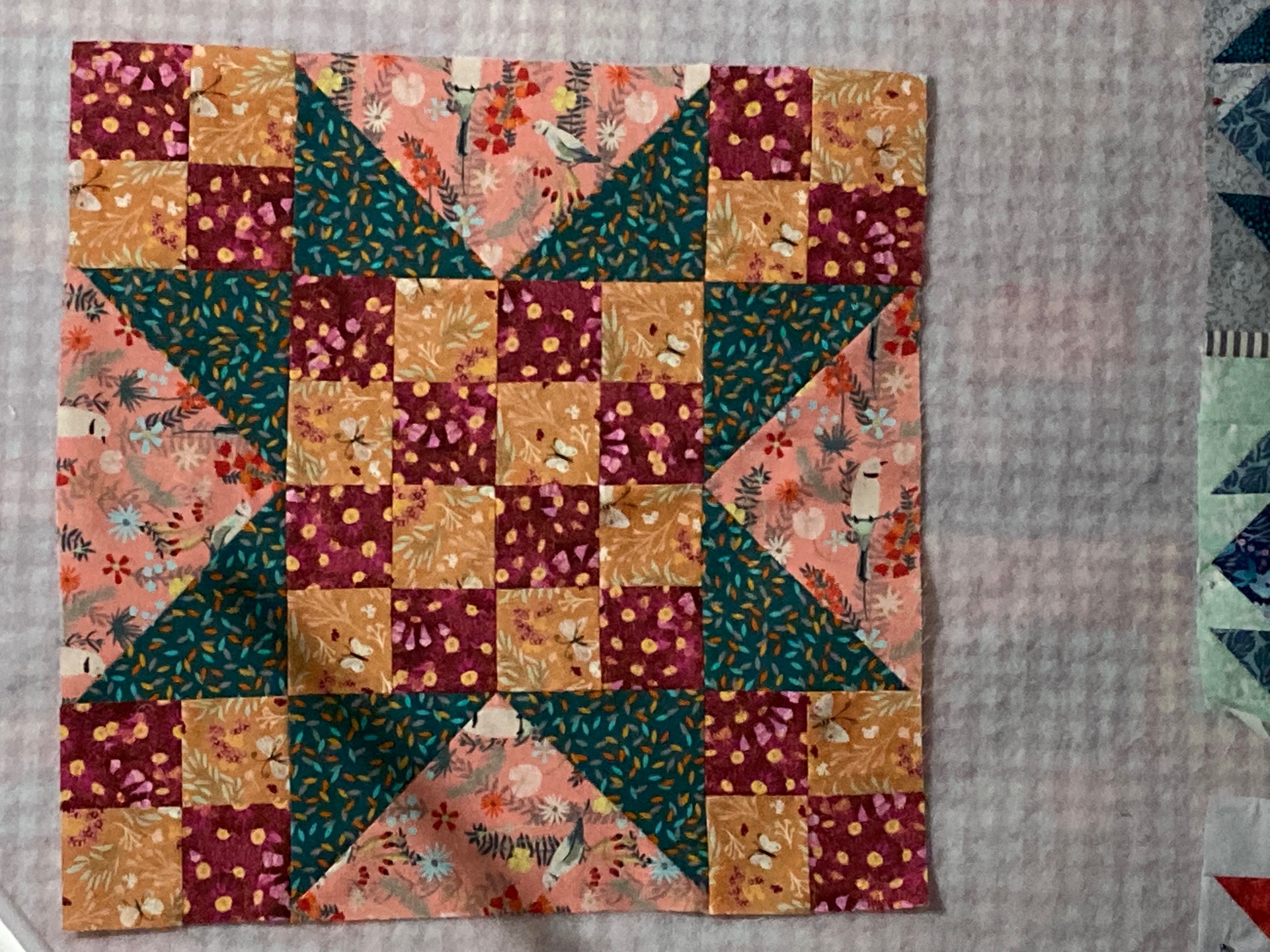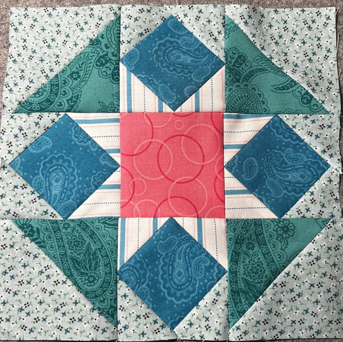 Your choices are wonderful. The only possibility to help you love it more might be that your small background print has a lot of gray in it and your other choices not that much. A brighter aqua green print in the background might give the block a spark but it is a beautiful