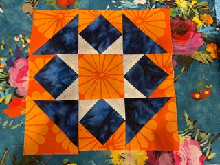 These are my split complementary blocks. I decide to make 18" blocks for the quilt layout I am thinking about and I didn't use the recommended block because the shapes would have been too big. I realised after I finished them that have made the mistake in both blocks of including the complementary colour as well as the colours on either side of the complementary that it should have been. Not to worry I'm not making them again. I'm not sure what fabric I would put in instead anyway. The first is split complementary of orange red, and the second is split complementary of aqua blue.