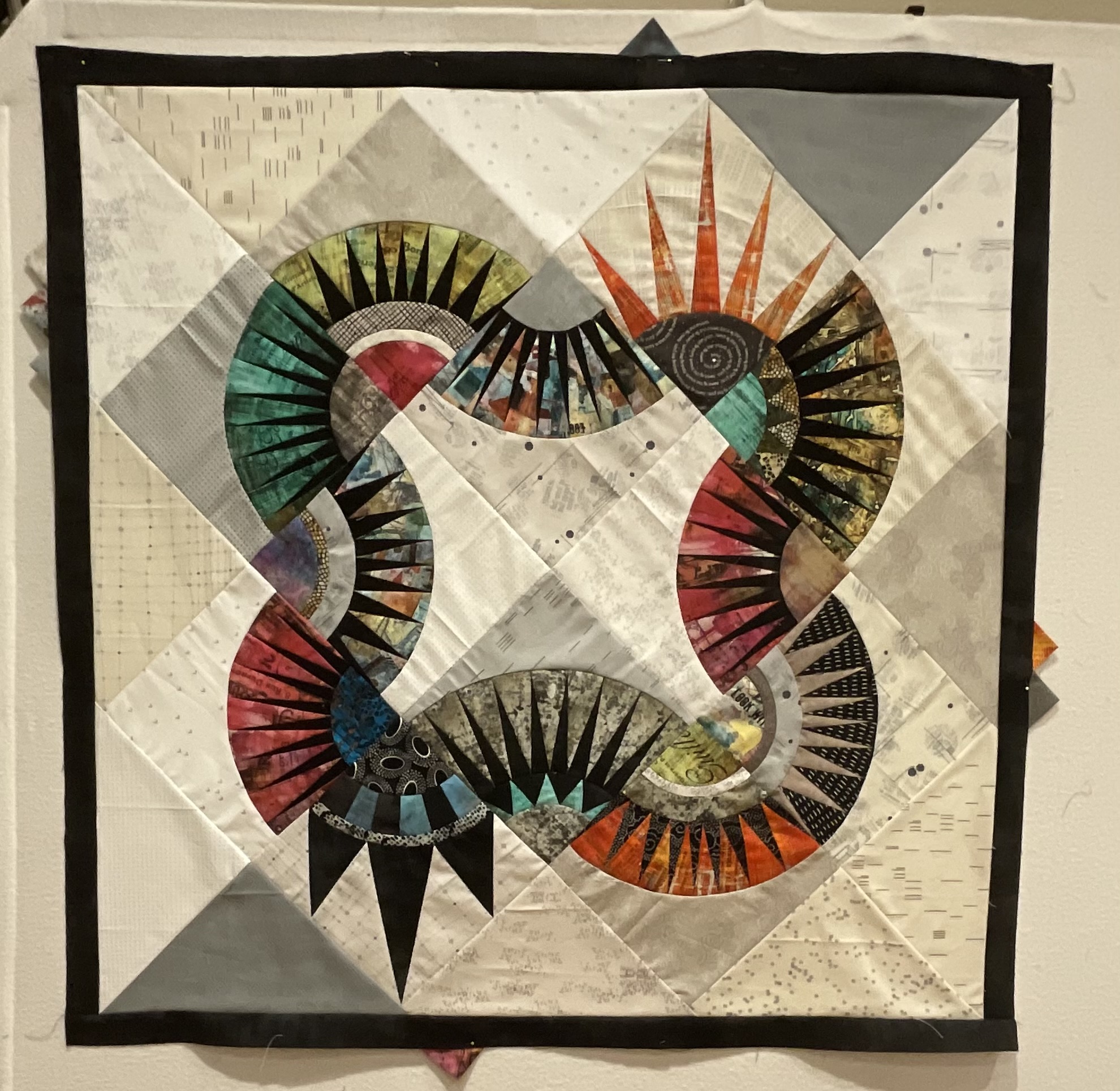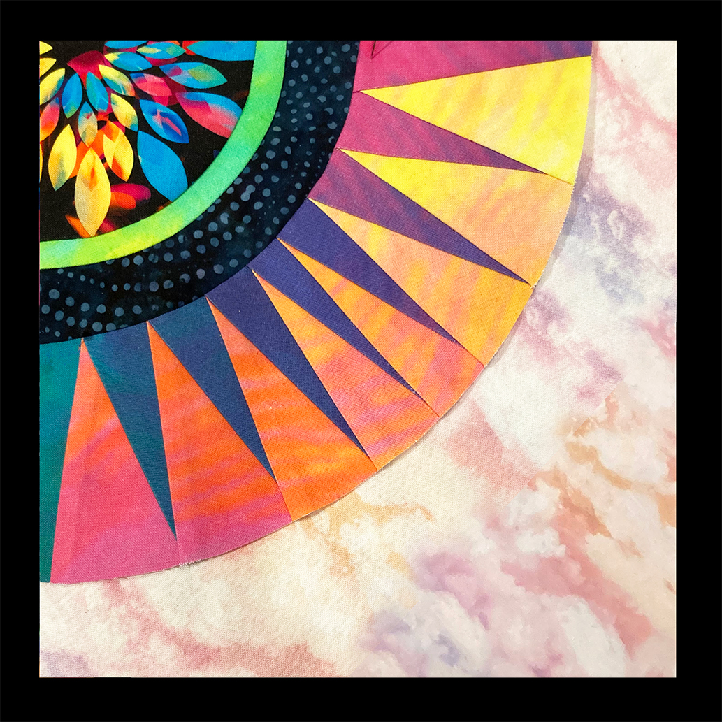 My colors and layout remind me of Jacqueline de Jonge's "Becolorful" quilts. So I watched Show 911. In the show she demonstrates an interesting method for making more perfect arcs. When cutting out the arc piece, she cuts a larger 1/2" wide seam allowance on the side that won't be stitched first, then after stitching the 1st side of the arc, she lays the pattern piece over the result and then trim the 2nd side 1/4" to stitch it.
