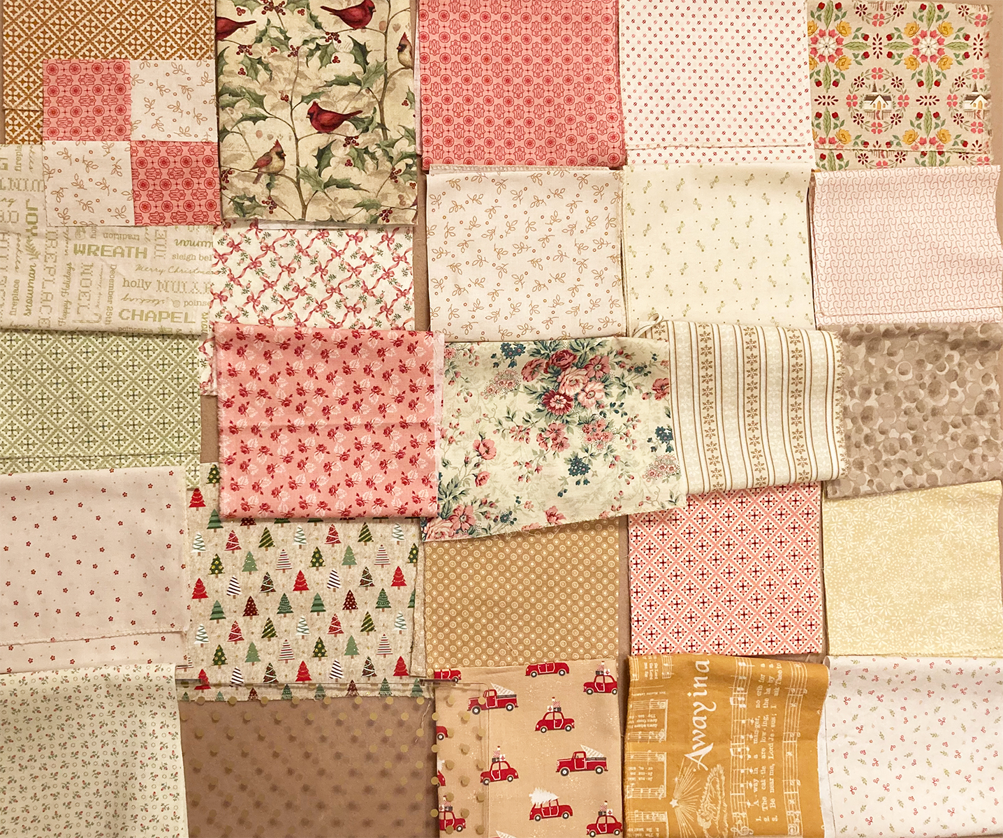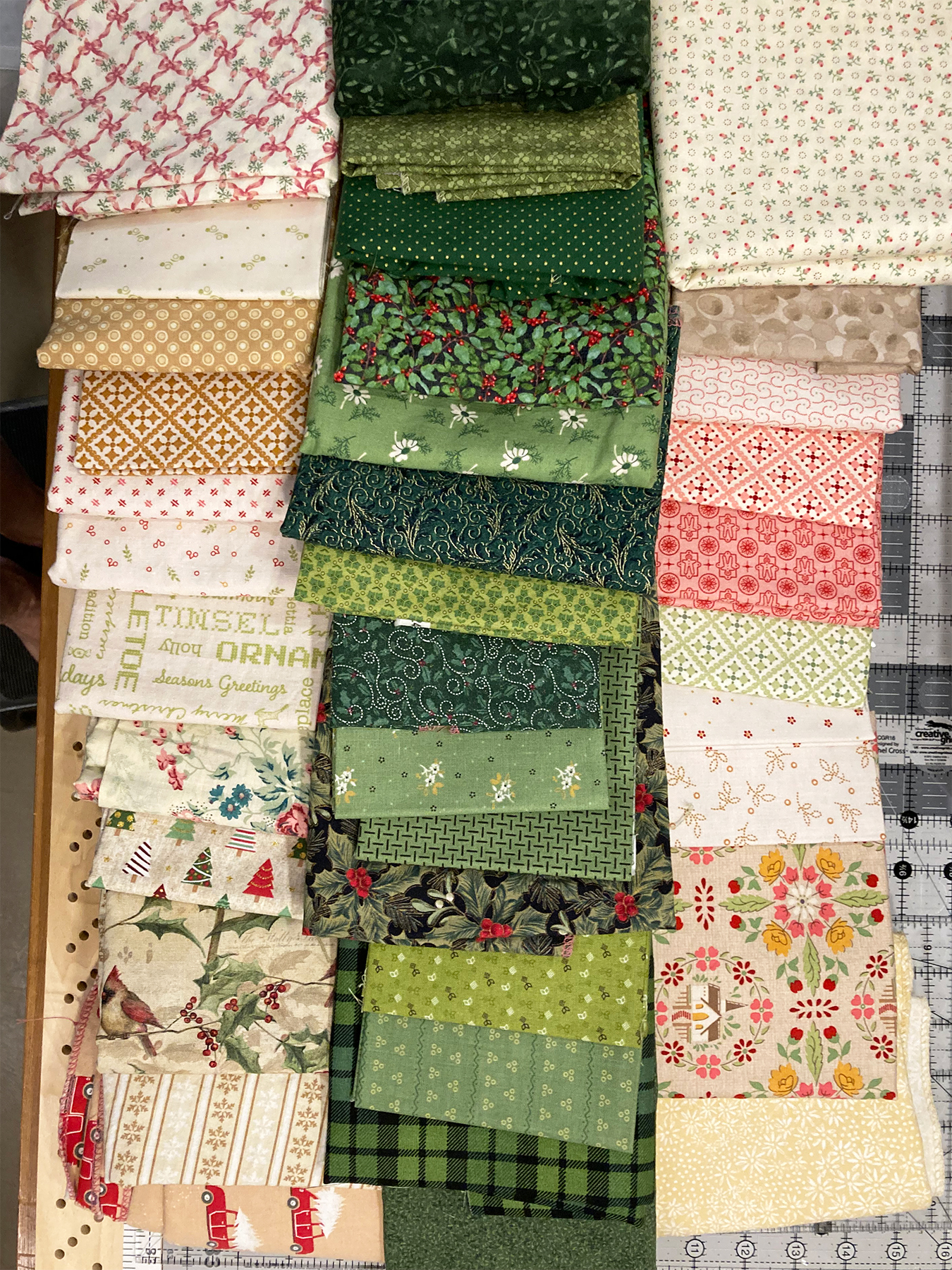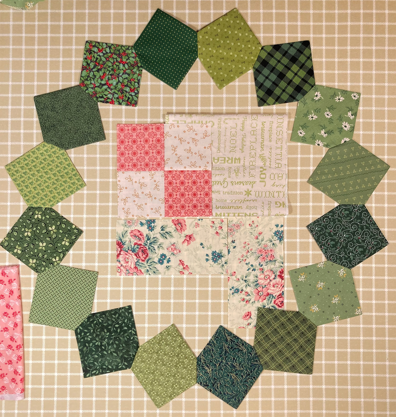 I found that the Lori Holt Gentler Times fabrics from the bundle combine nicely with her Hometown Holiday fabrics and some other Christmas theme fabrics I have. So I'm making a single "Aromatic Ring" of greens to be a holiday wall hanging suggesting a wreath.