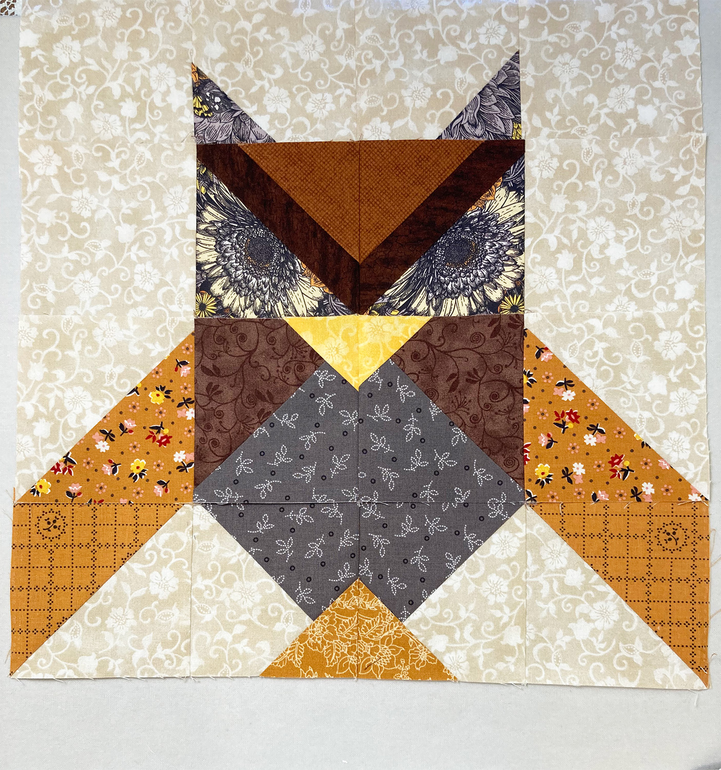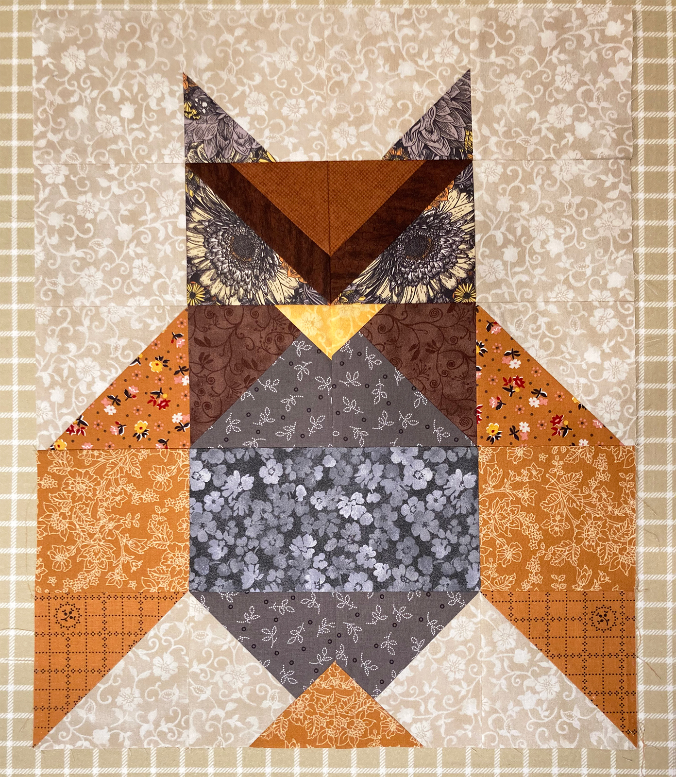 Here's the Owl I'm working on. I wanted the owl to be smaller than the pattern specified, so I reduced the size to 75%. That meant that the 5" finished size squares are reduced to 3.75" and the finished block will be 15" wide.