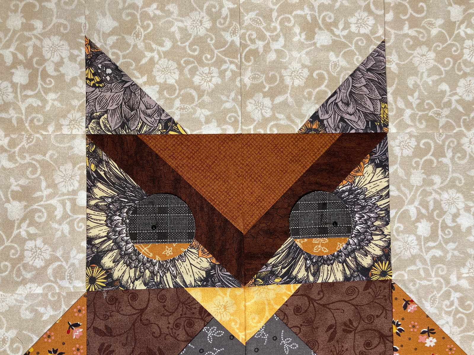 I've pinned applique shapes over the "flower center" eyes to try them out. I wanted the owl's expression to be perceived as more relaxed, sleepy, or looking down rather than straight at us. I think I like the addition of the applique eyes better than without them.