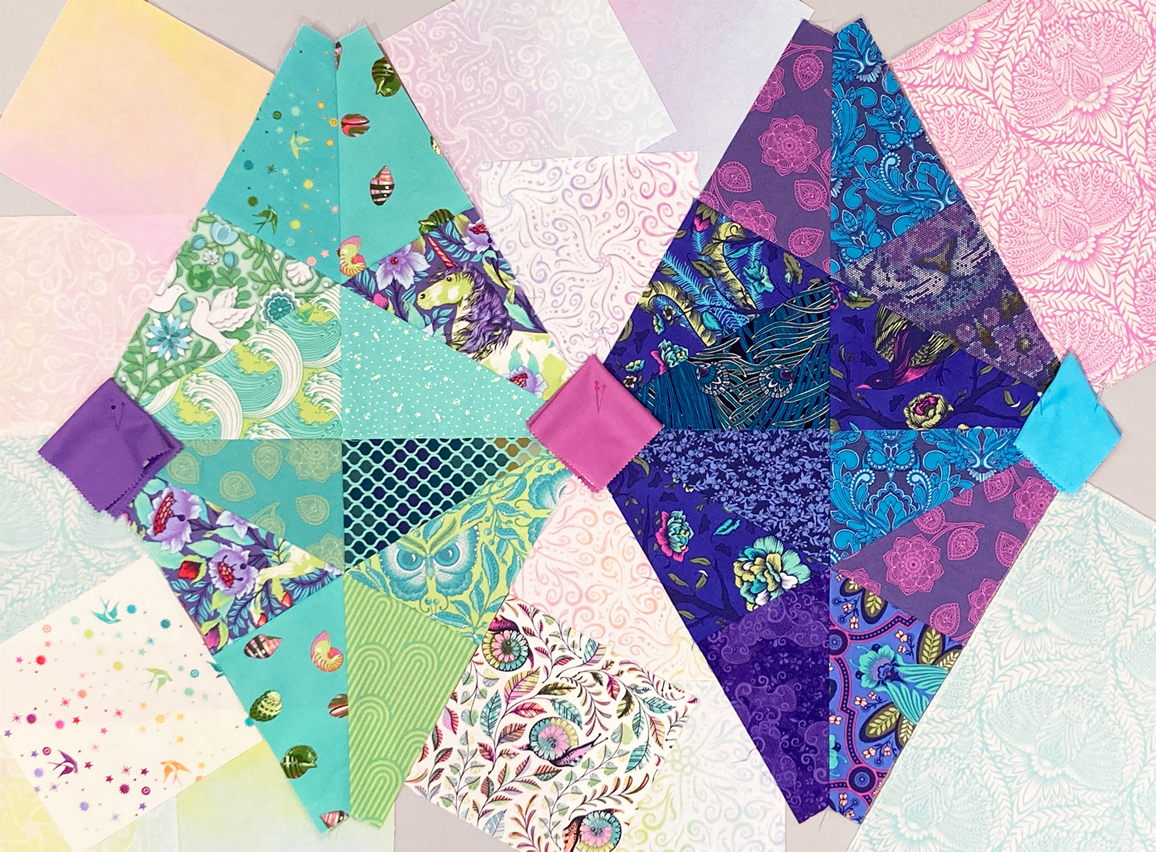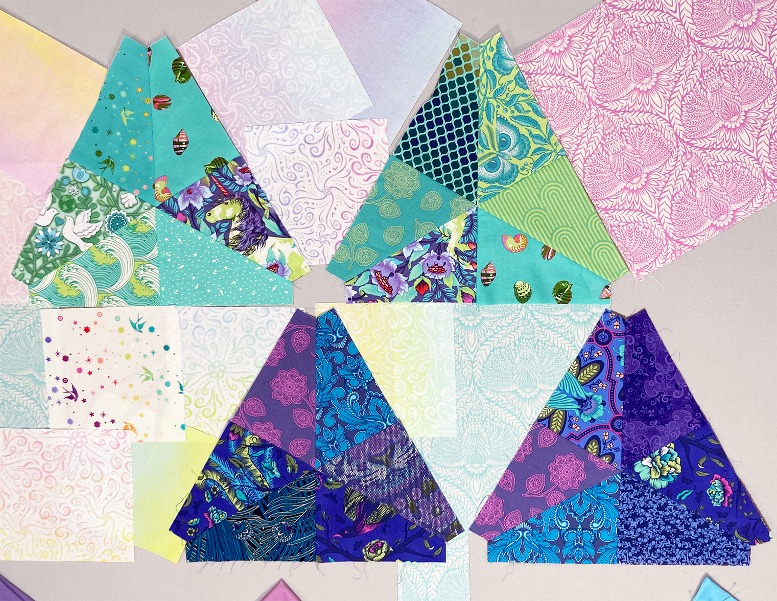 I've stitched 4 of the colored equilateral triangle blocks so far for "The Circus Comes To Town" - 2 in teal colors and 2 in purple colors. I'm really enjoying making them!
