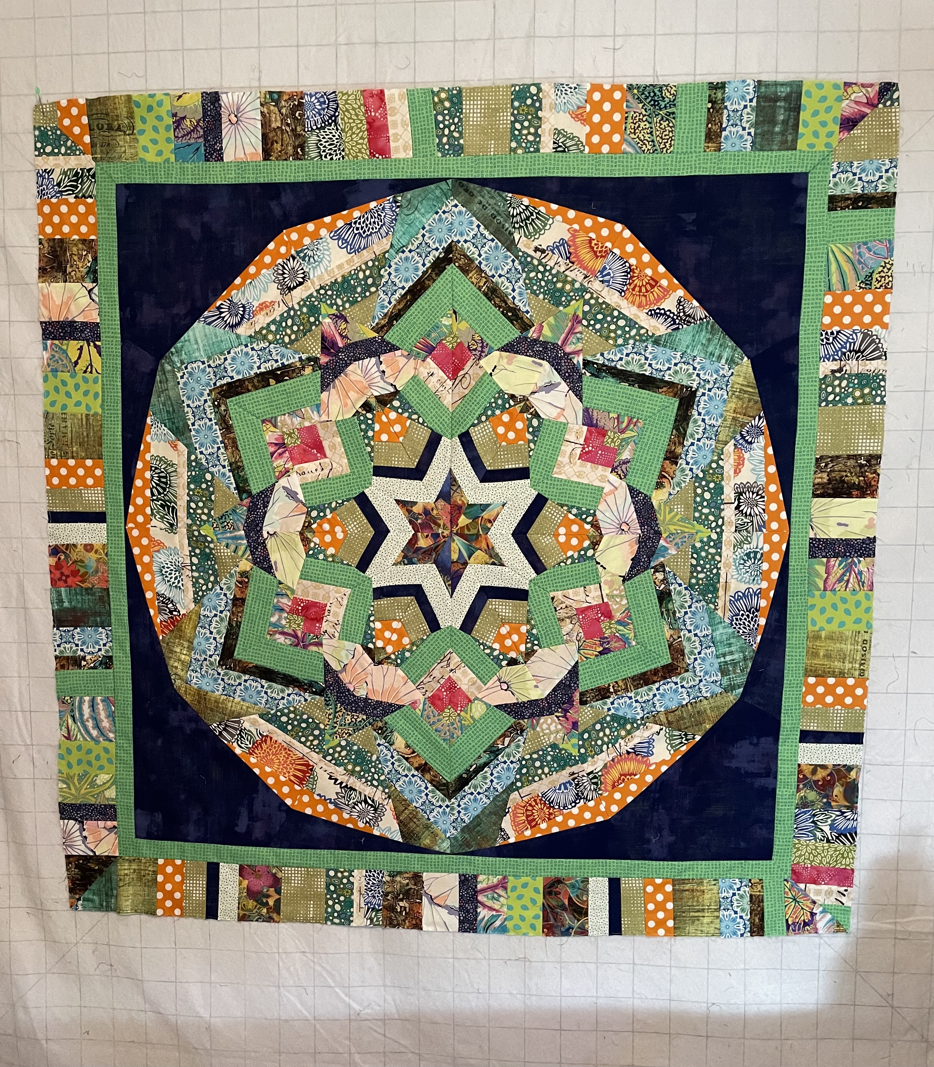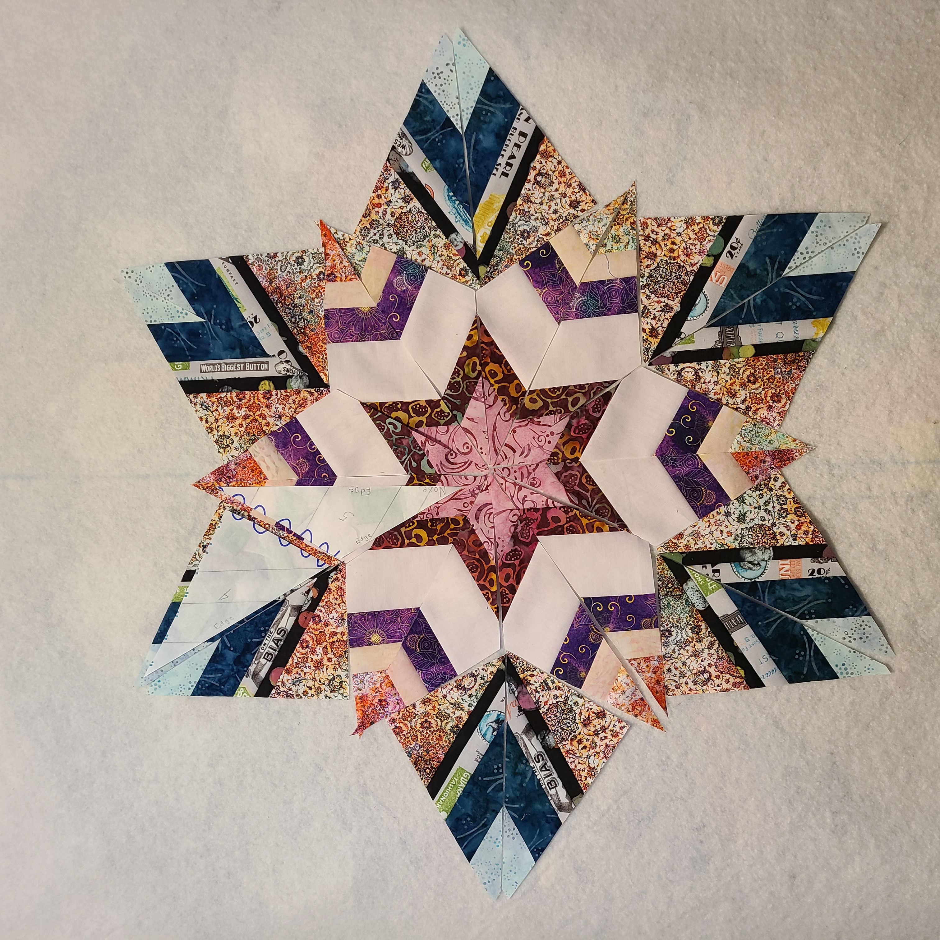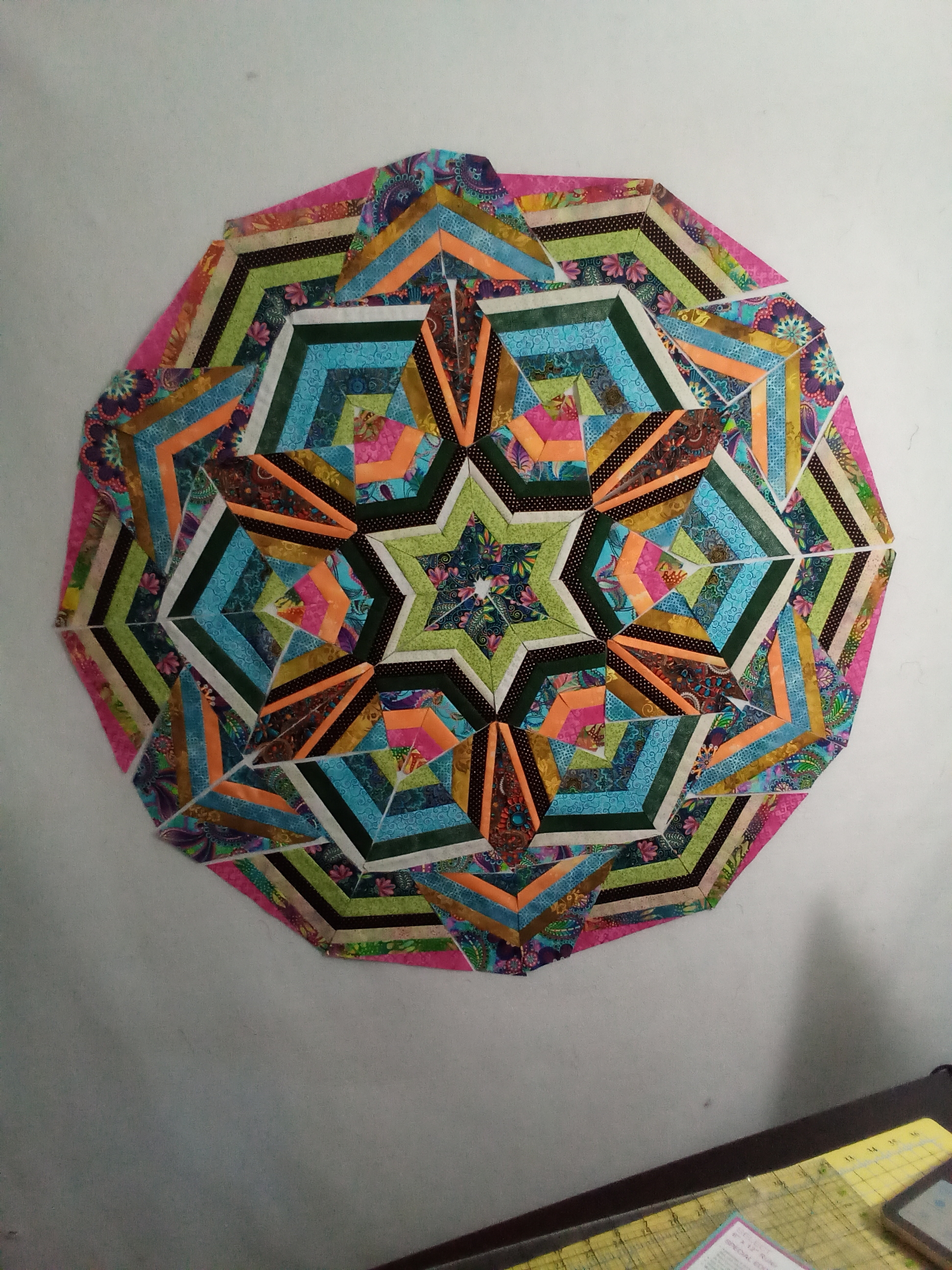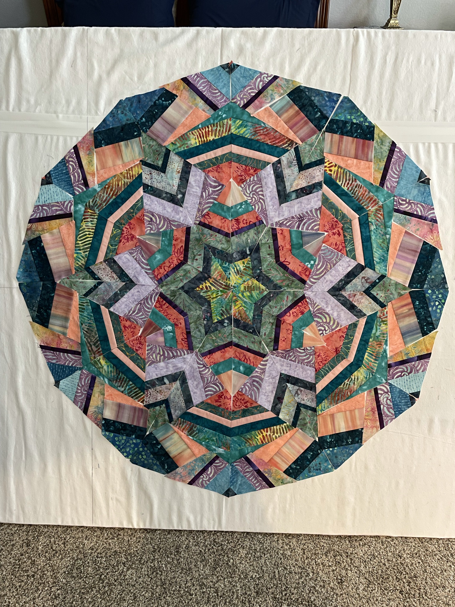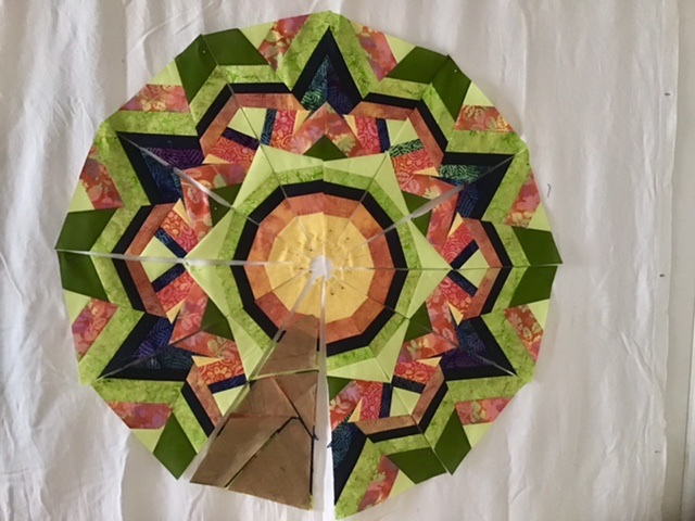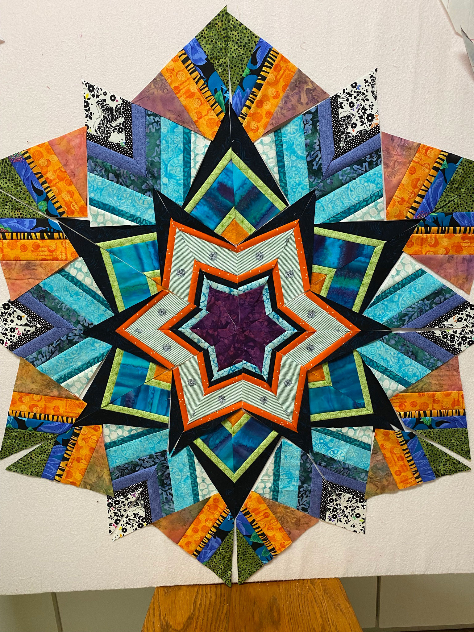 I’ve been watching Ricky demonstrate Kool Kaleidoscopes since I joined TQS in February 2007, but when he said he used his HOSPITAL GOWN, I knew it was finally time for me to jump on the bandwagon because my son was in the hospital then with Covid! He is home now, and I asked his wife to send me his hospital gown because the dots reminded me of the Corona Virus images. He was in the hospital for 12 days and there are 12 dots in the central star.