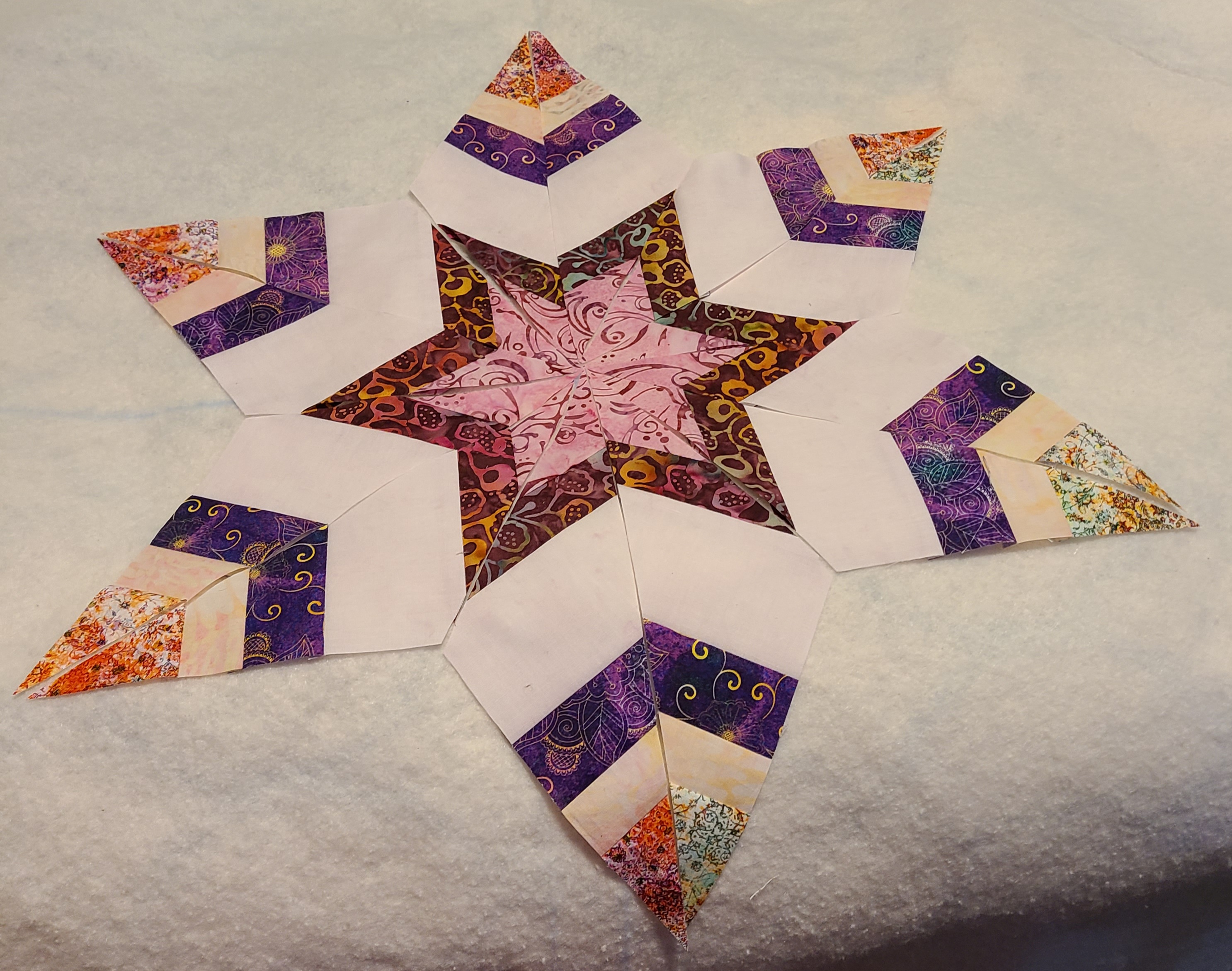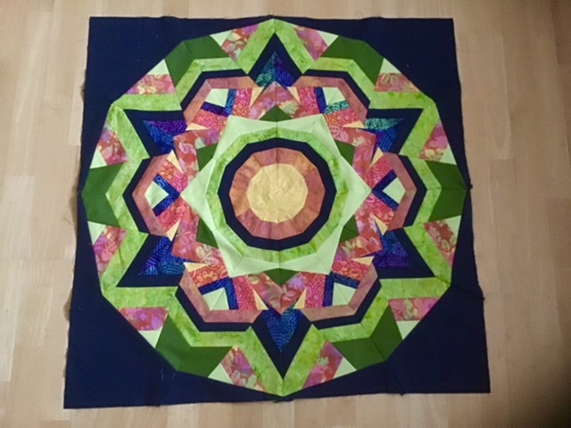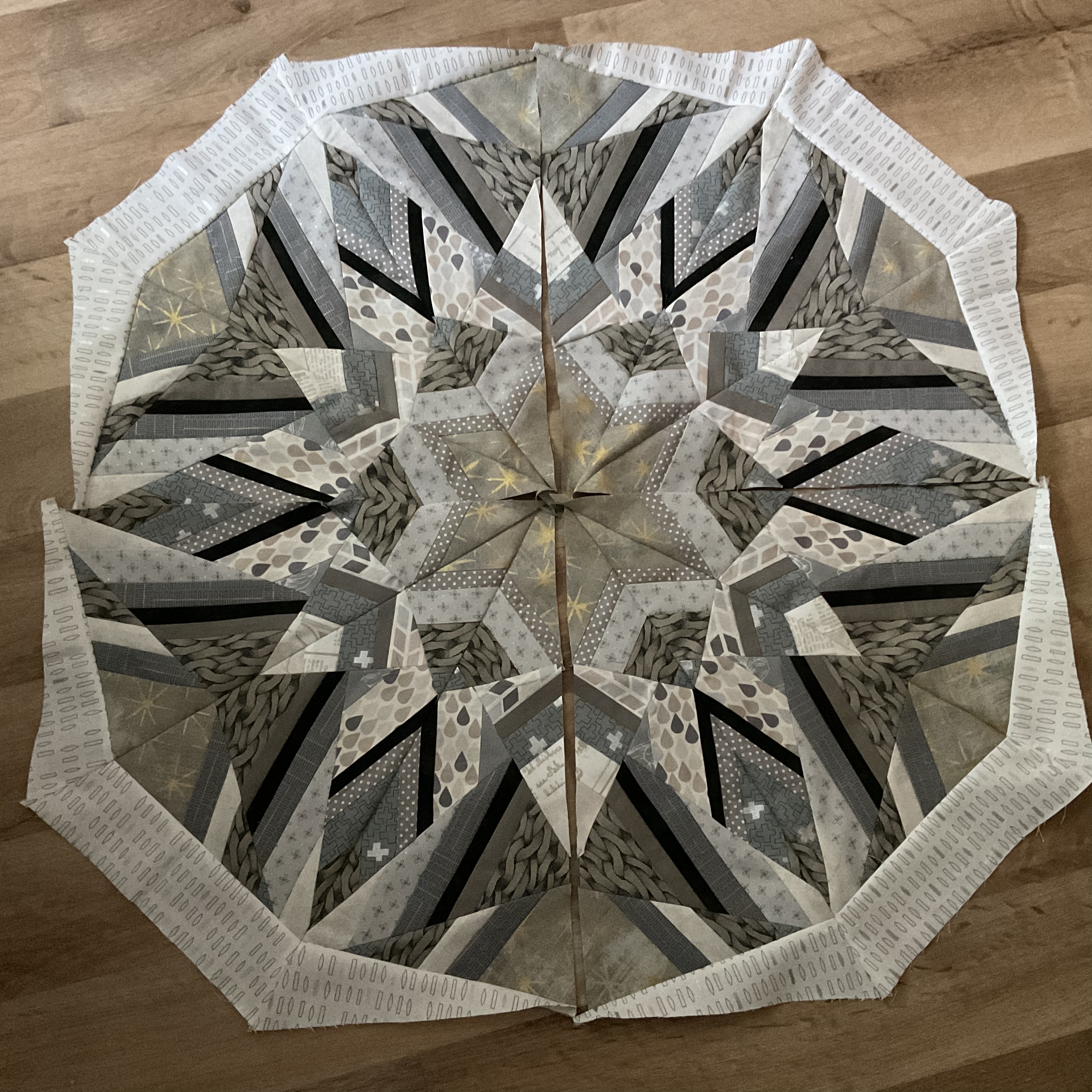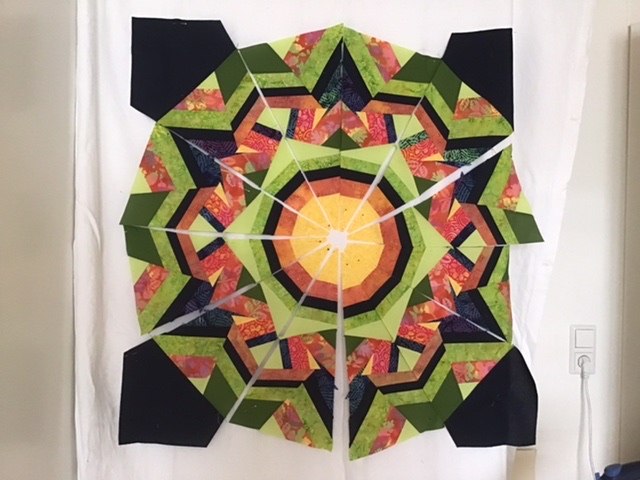 I pulled some fabrics from my stash, that are not quite my traditional colourway and just started sewing. Now the for sections are sewn together and it looks like a christmas ornament or snowflake. I like it! Now I have to decide on a border. I have a lot of small pieces left from my strata and thinking about adding additonal „spikes“ to the star.