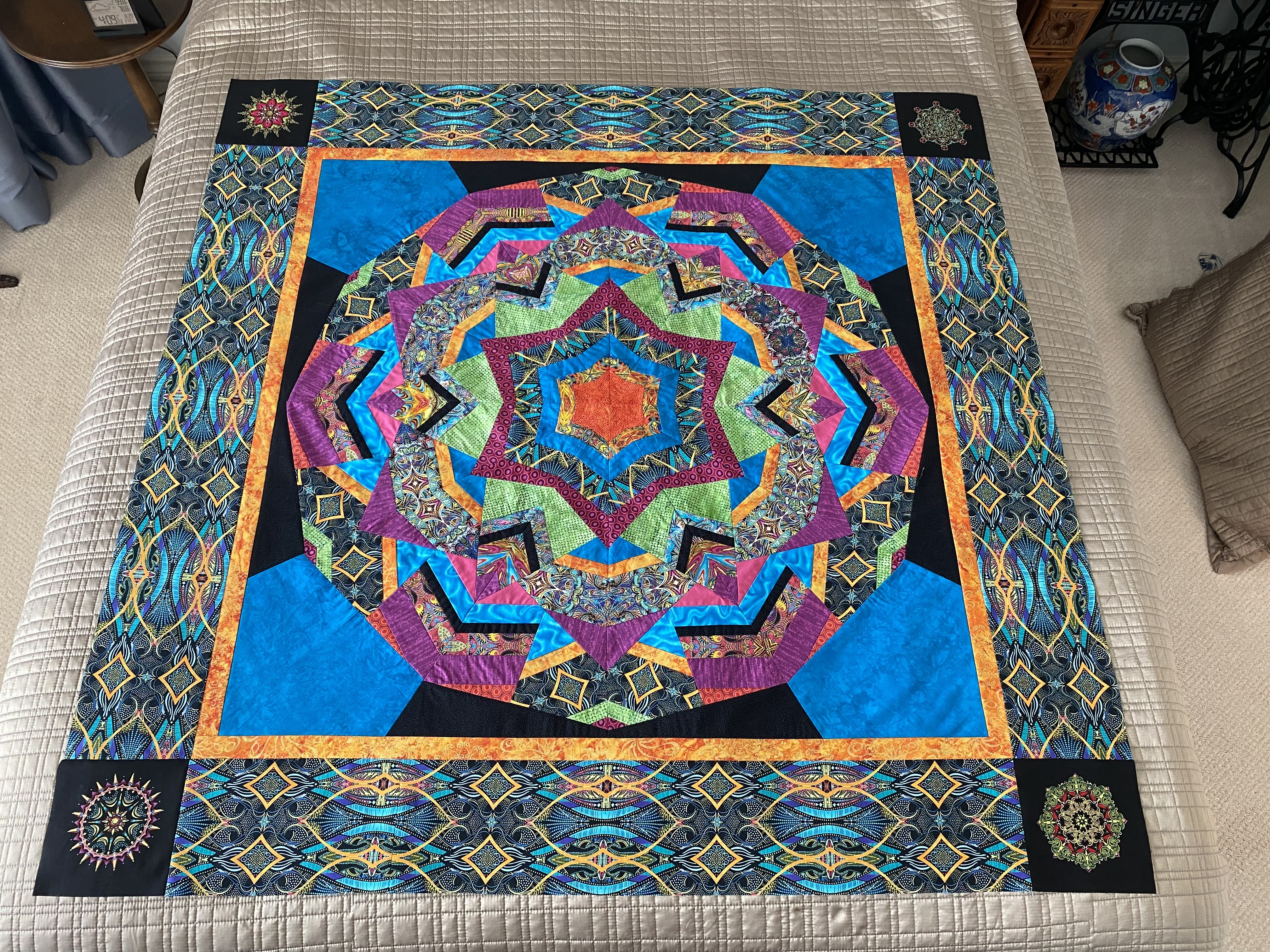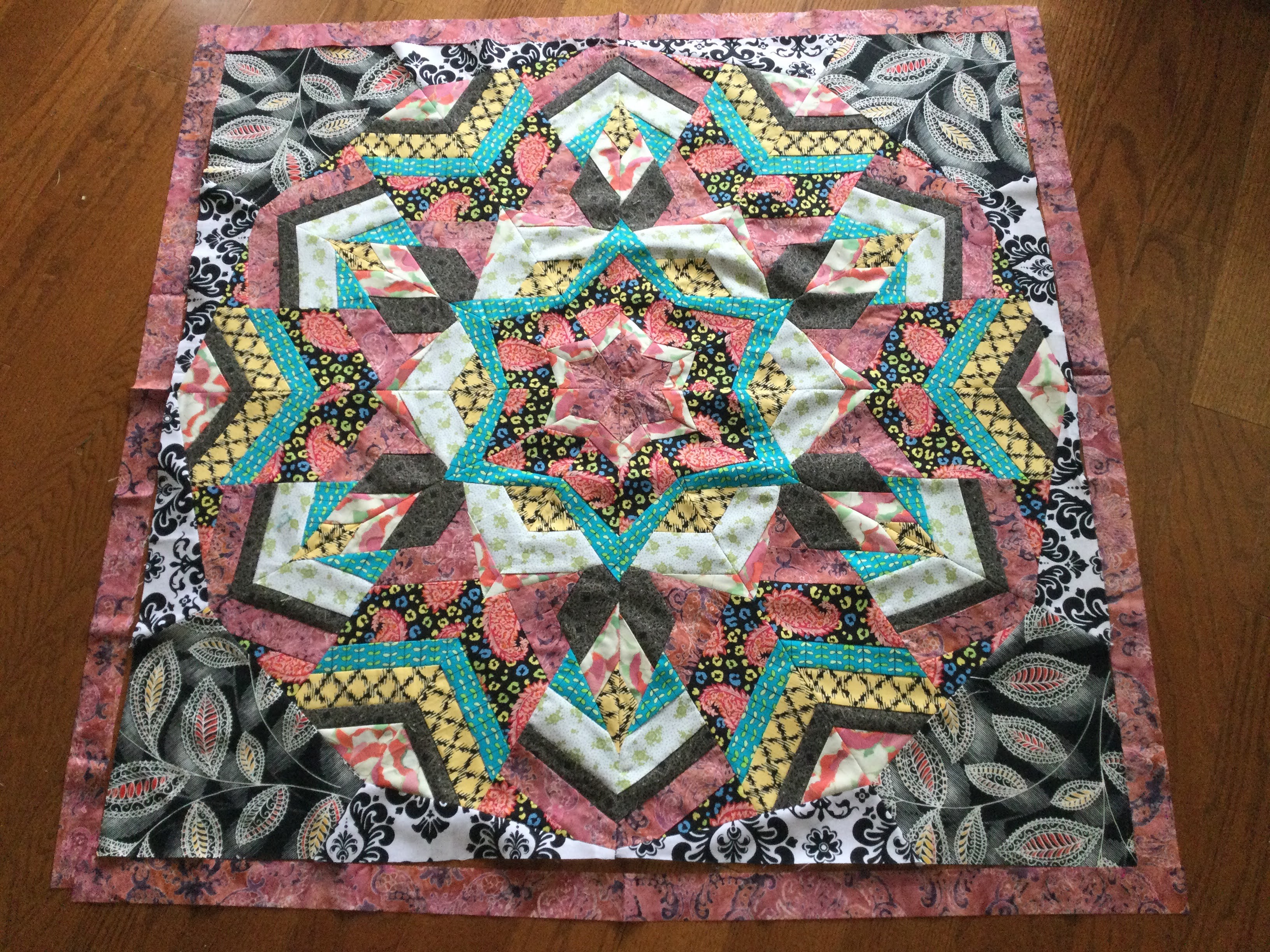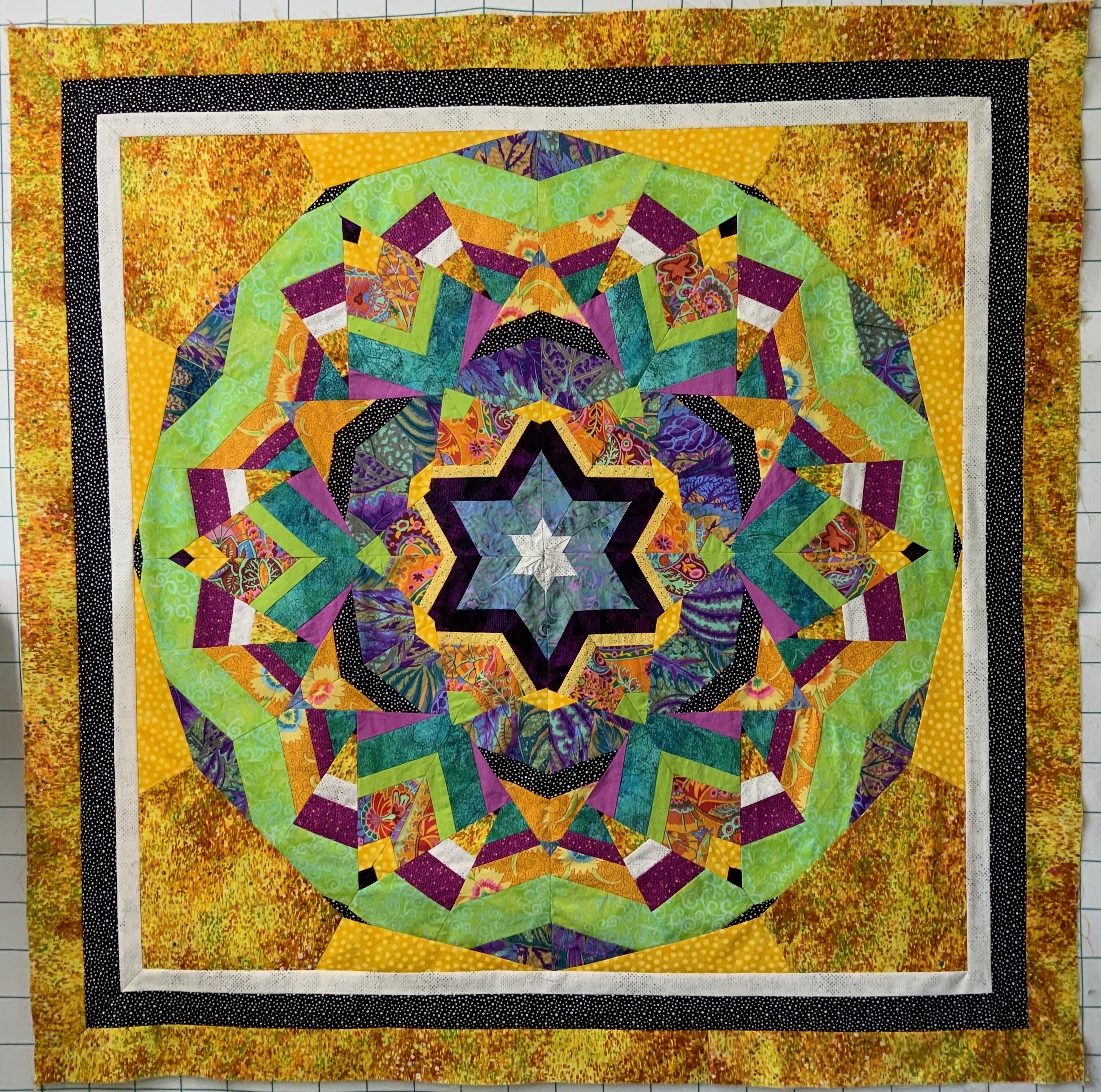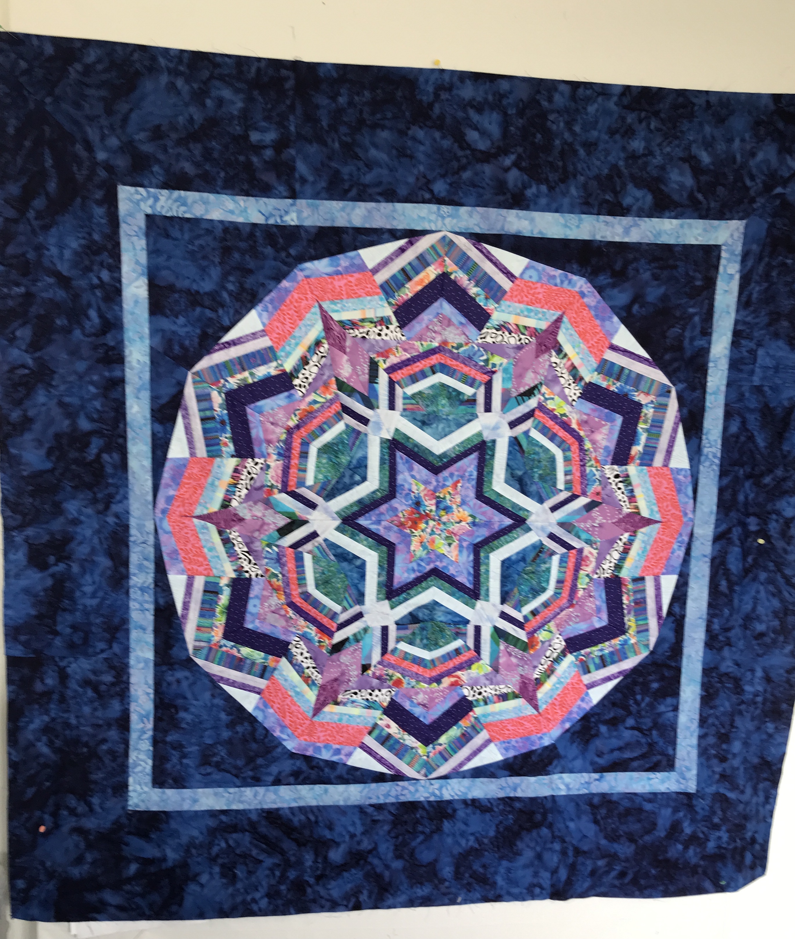 Here is my Kaleidoscope completed top. It was fun to do. It is a mix of batiks and some cotton prints. This was made using the Ricky's kaleidoscope book as well as watching the class videos. Although I like the look, there were times when I thought that I may have missed the mark. I can hardly wait to have it quilted. It will be a wall hanging and I may put it in our local show.