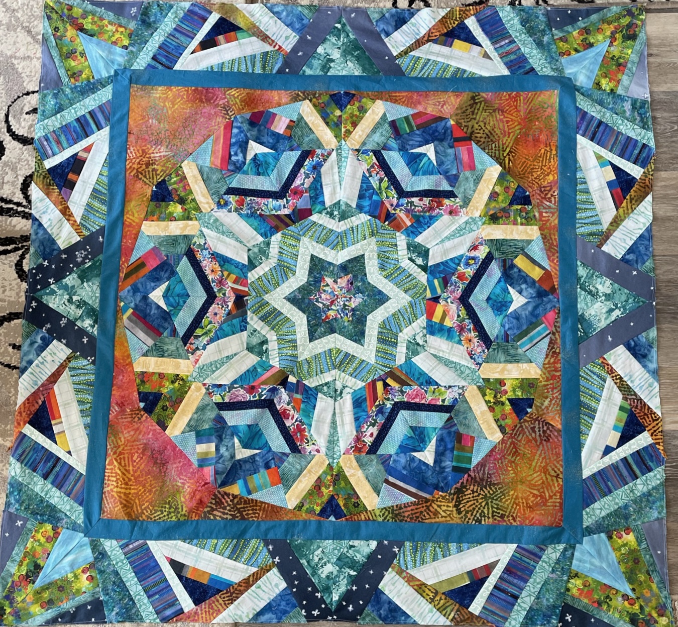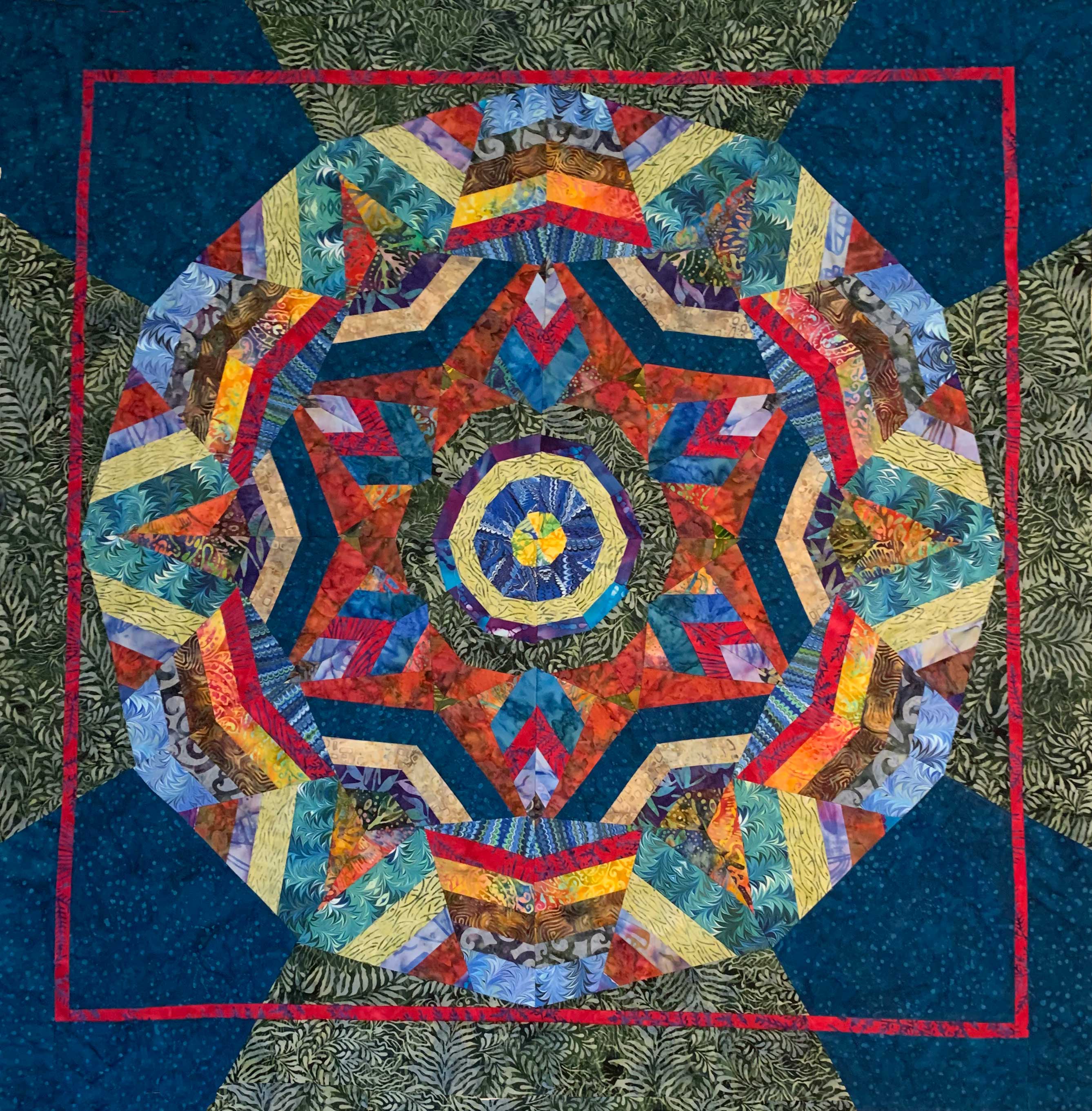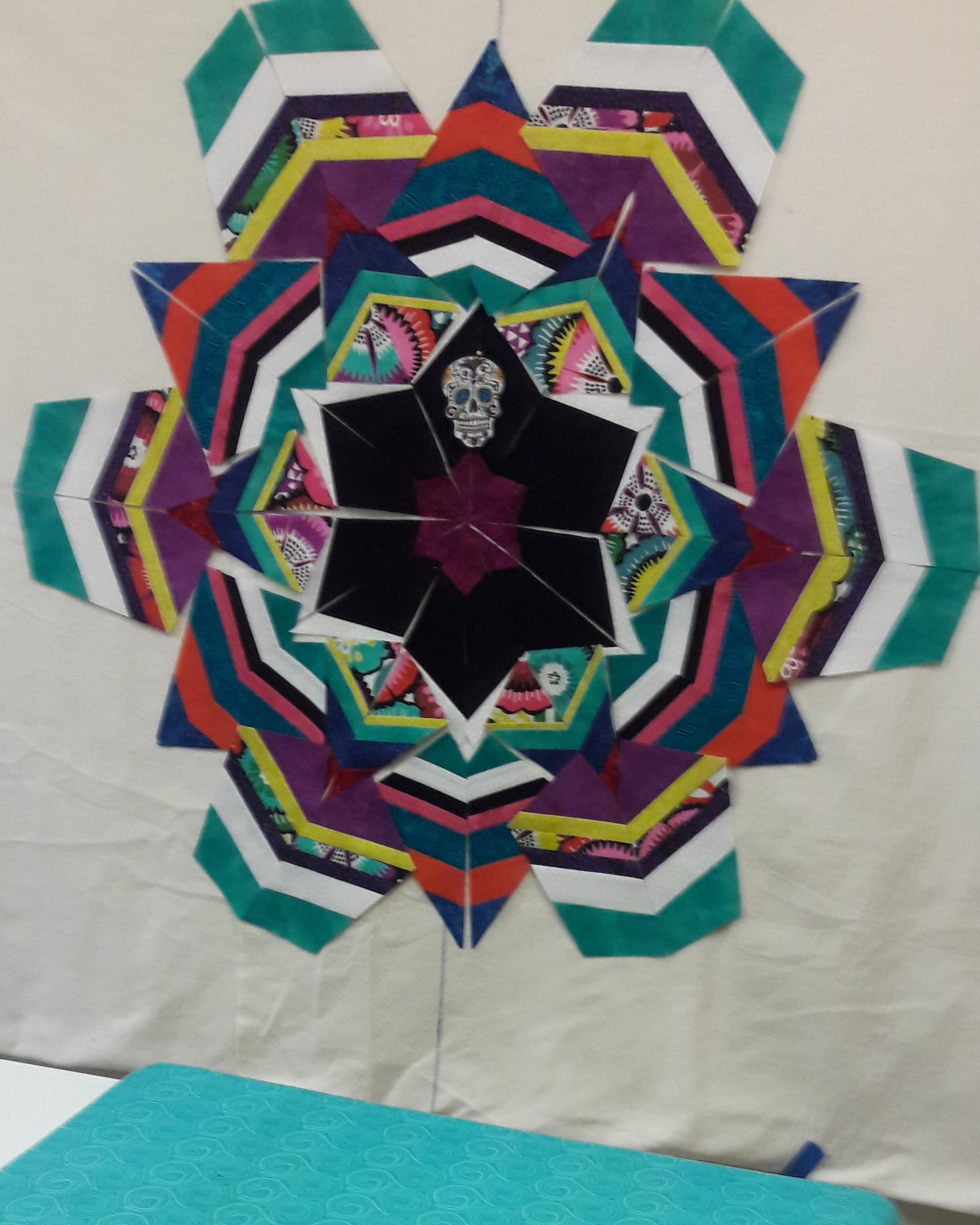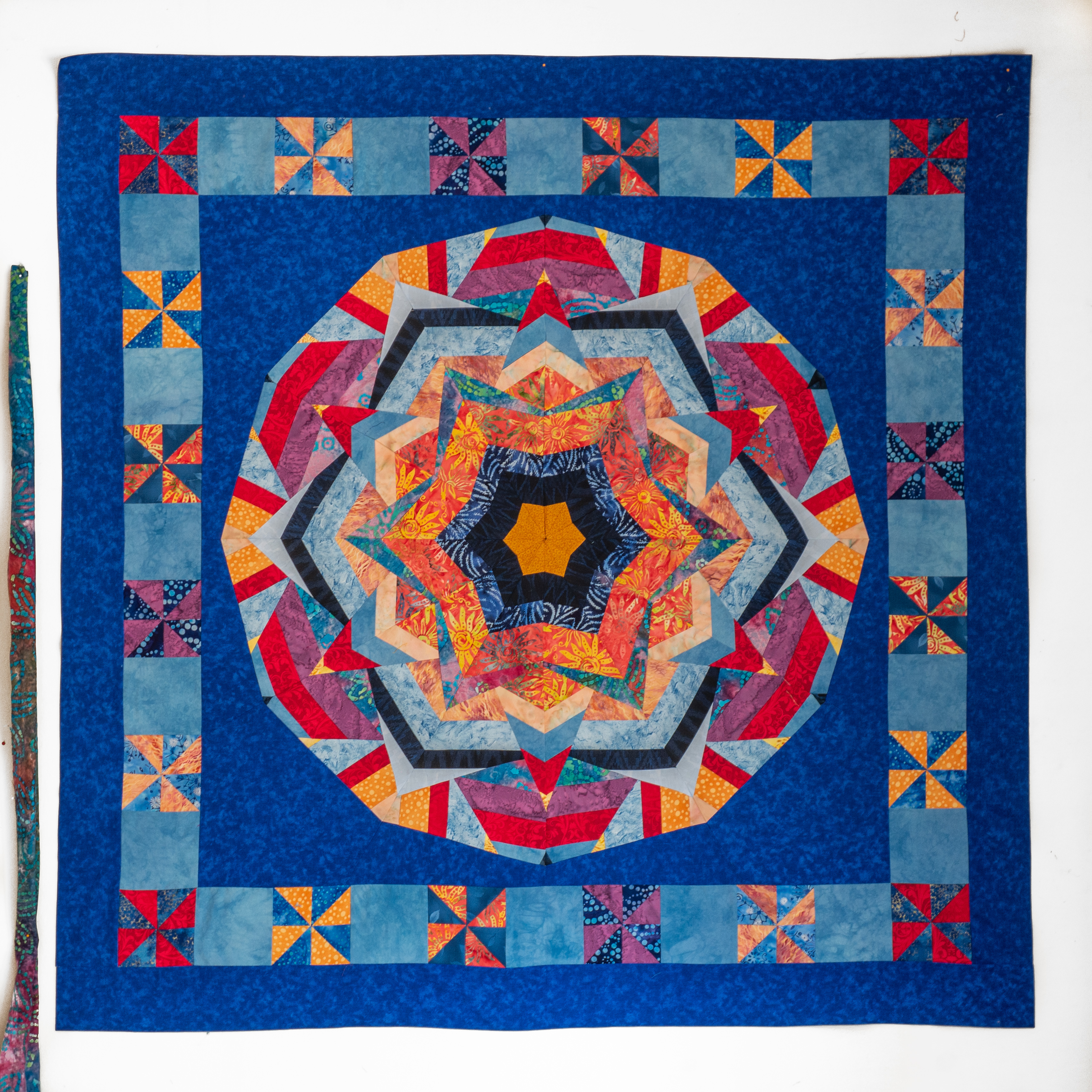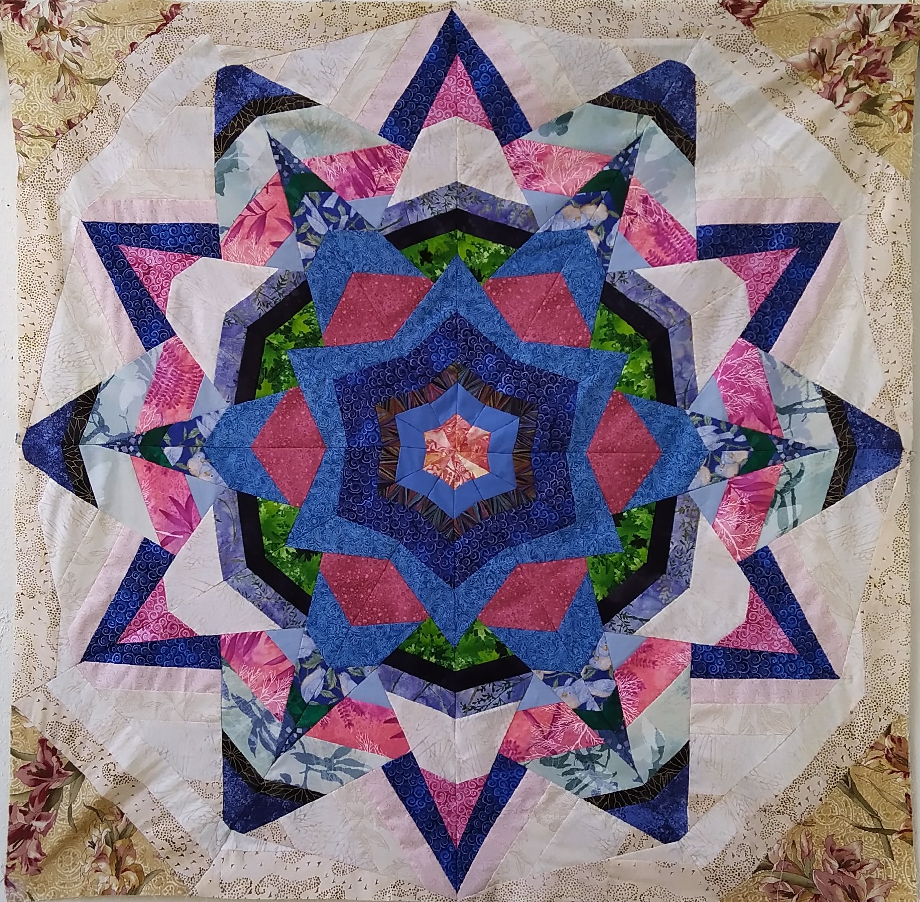 Here is my Kaleidoscope completed top. It was fun to do. It is a mix of batiks and some cotton prints. This was made using the Ricky's kaleidoscope book as well as watching the class videos. Although I like the look, there were times when I thought that I may have missed the mark. I can hardly wait to have it quilted. It will be a wall hanging and I may put it in our local show.