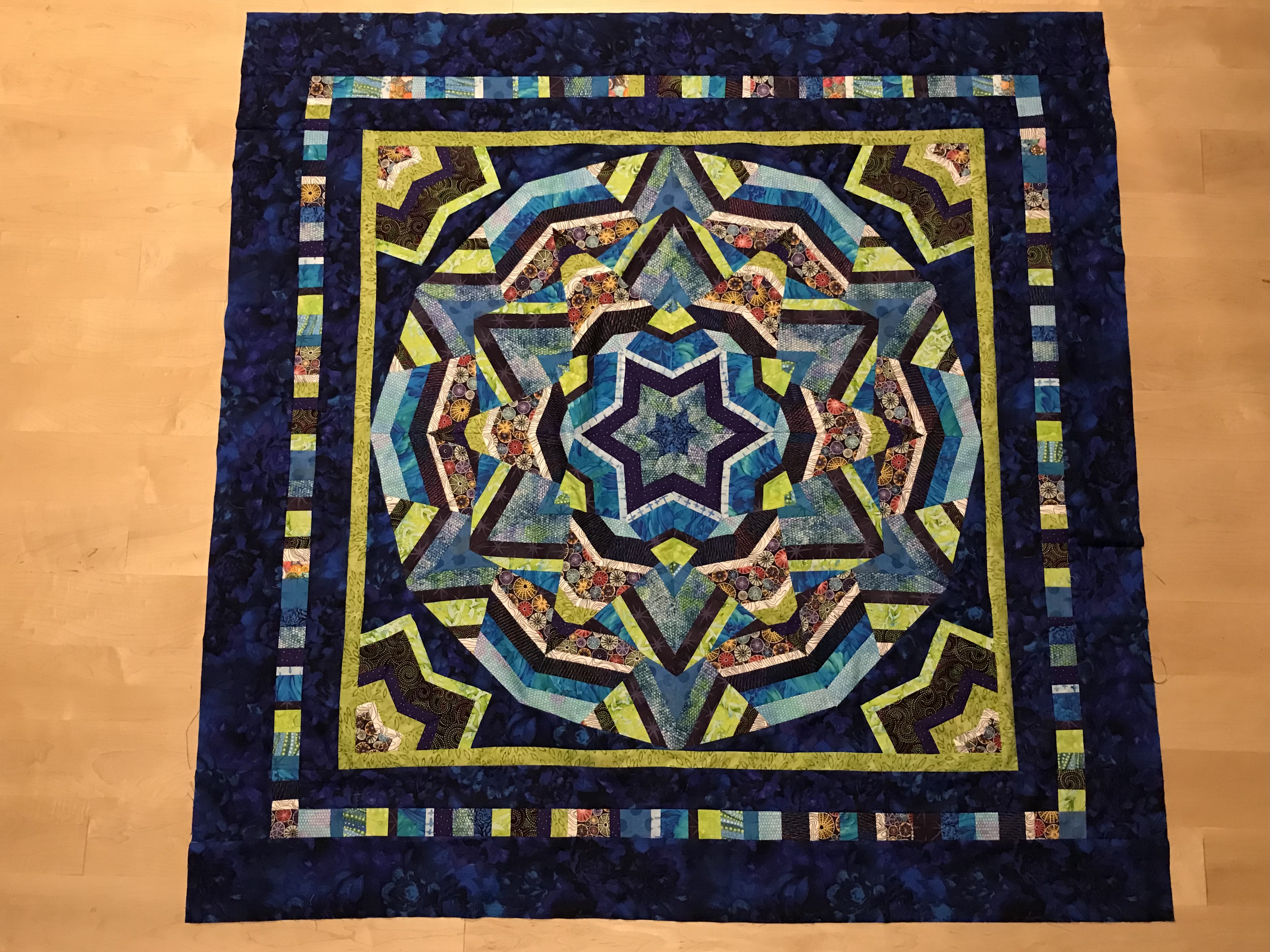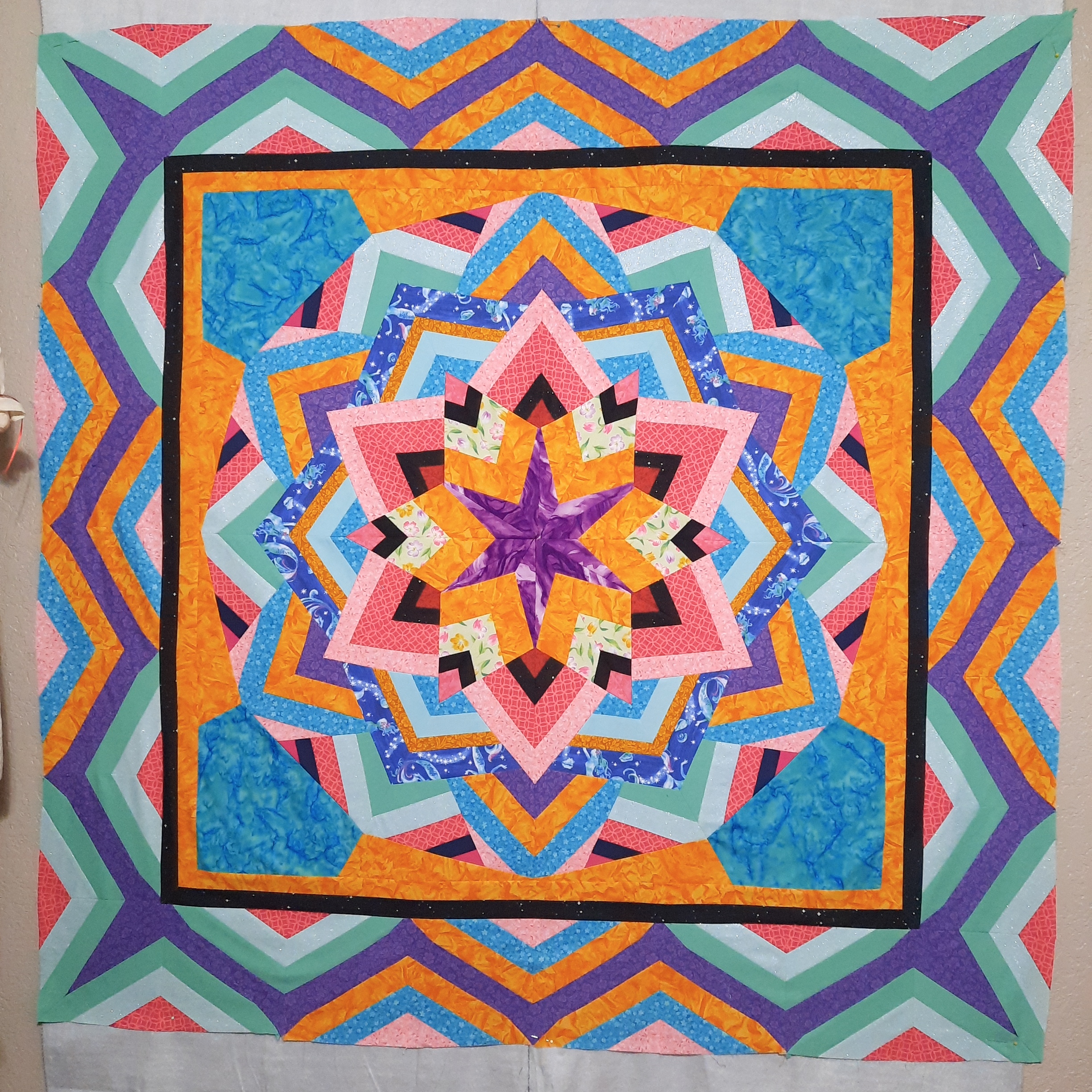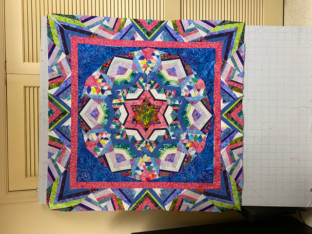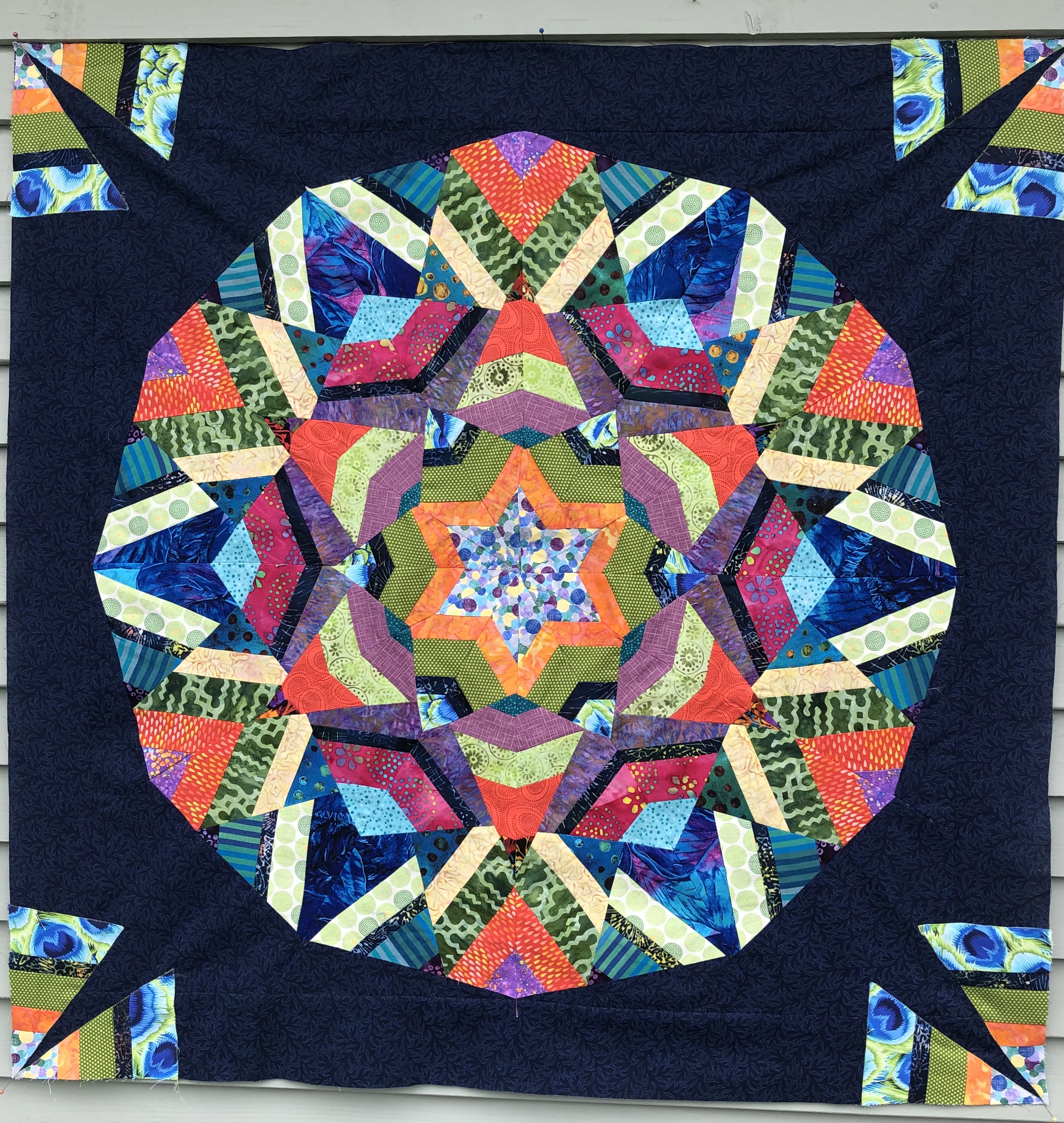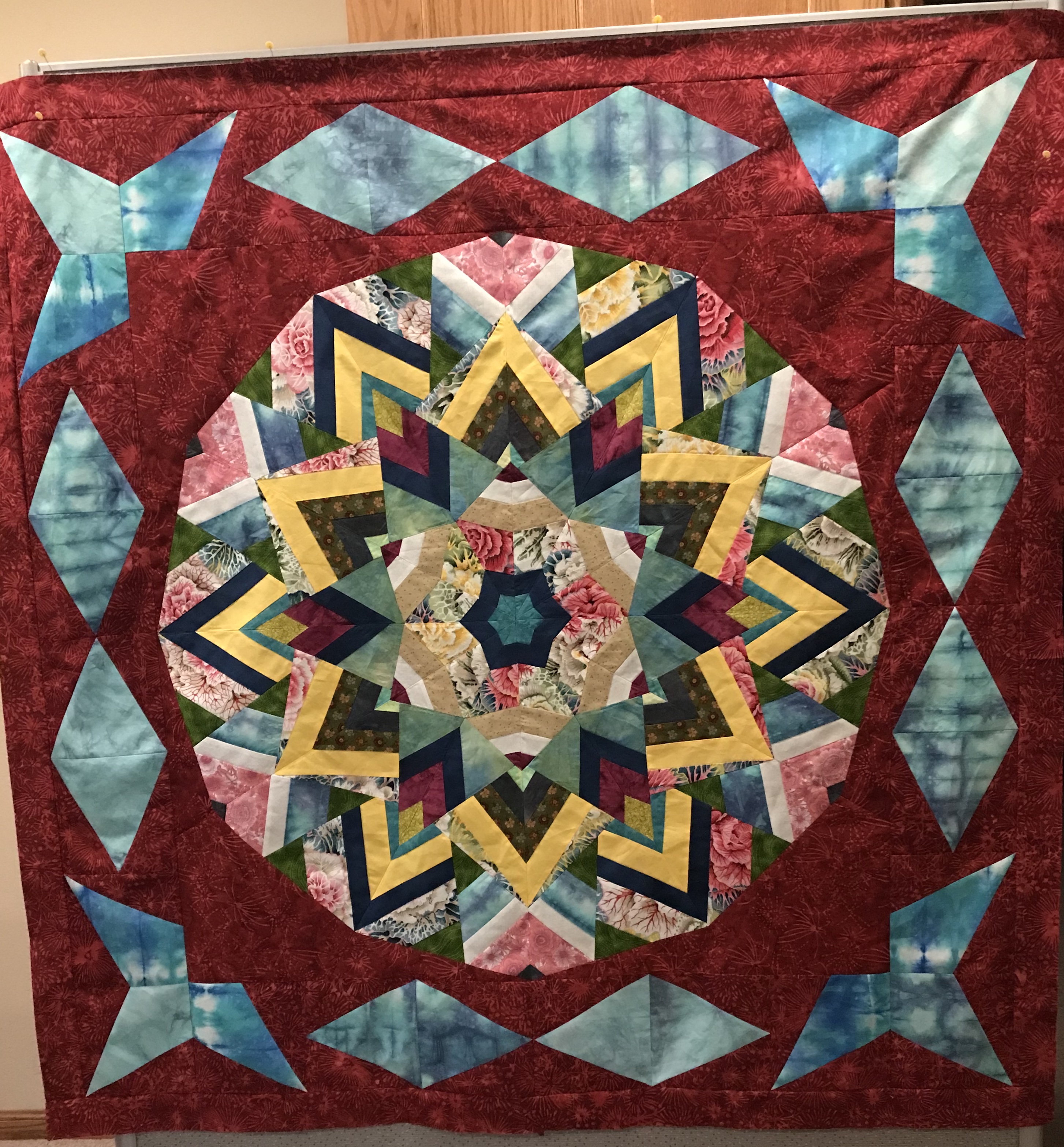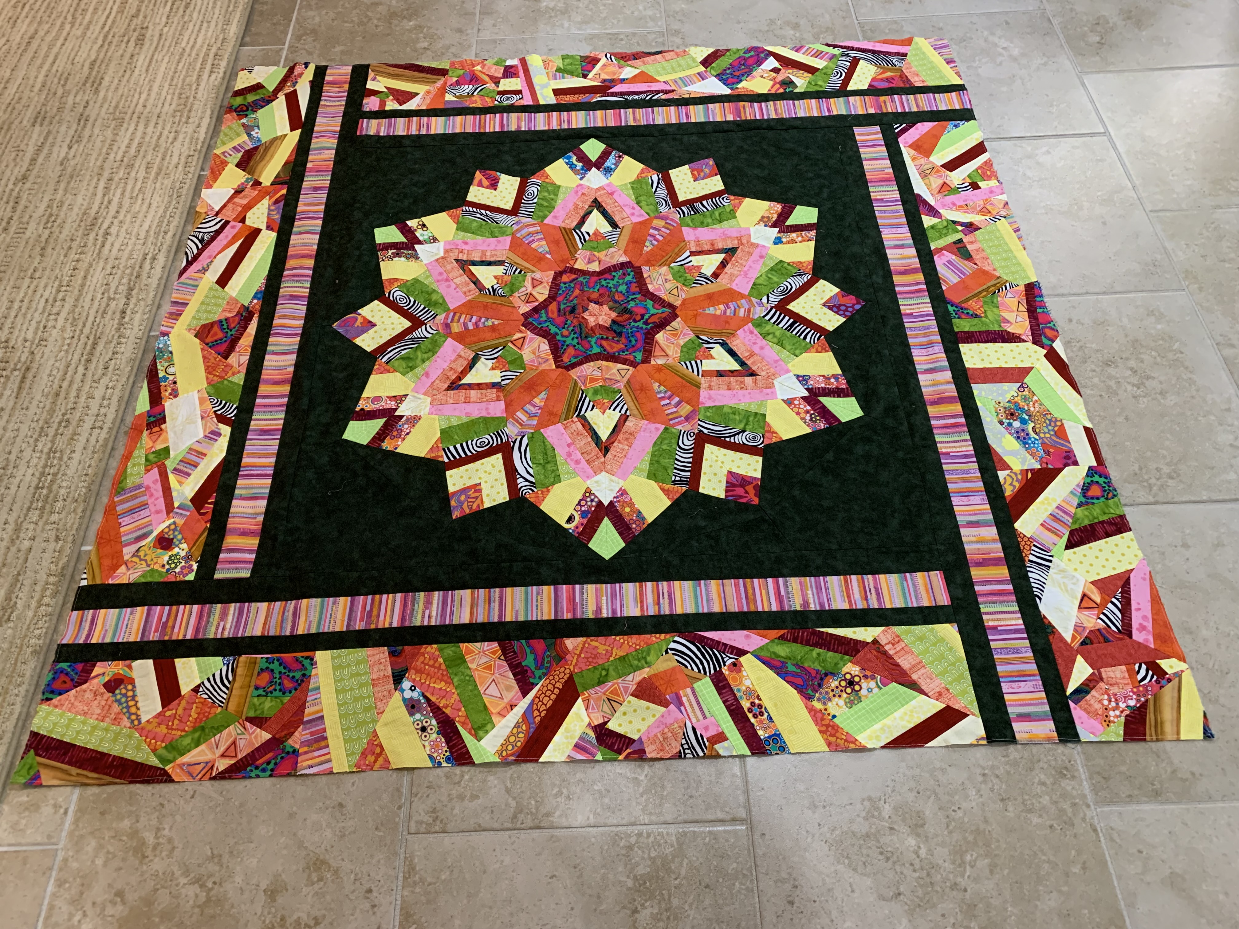 [QUOTE=AMiller;n887726]My Kaleidoscope quilt is finished! For the back I used scraps. I used Sharon Schamber's basting method of rolling the top and back onto trim boards. For basting, I used the herringbone stitch with Superior's Vanish water soluble thread. It disappeared immediately when I soaked the finished quilt in water. I still got a few puckers on the back when I quilted it but not serious. I quilted it with concentric circles for the center part and simple lines outward for parts of the outer border. [/QUOTE]