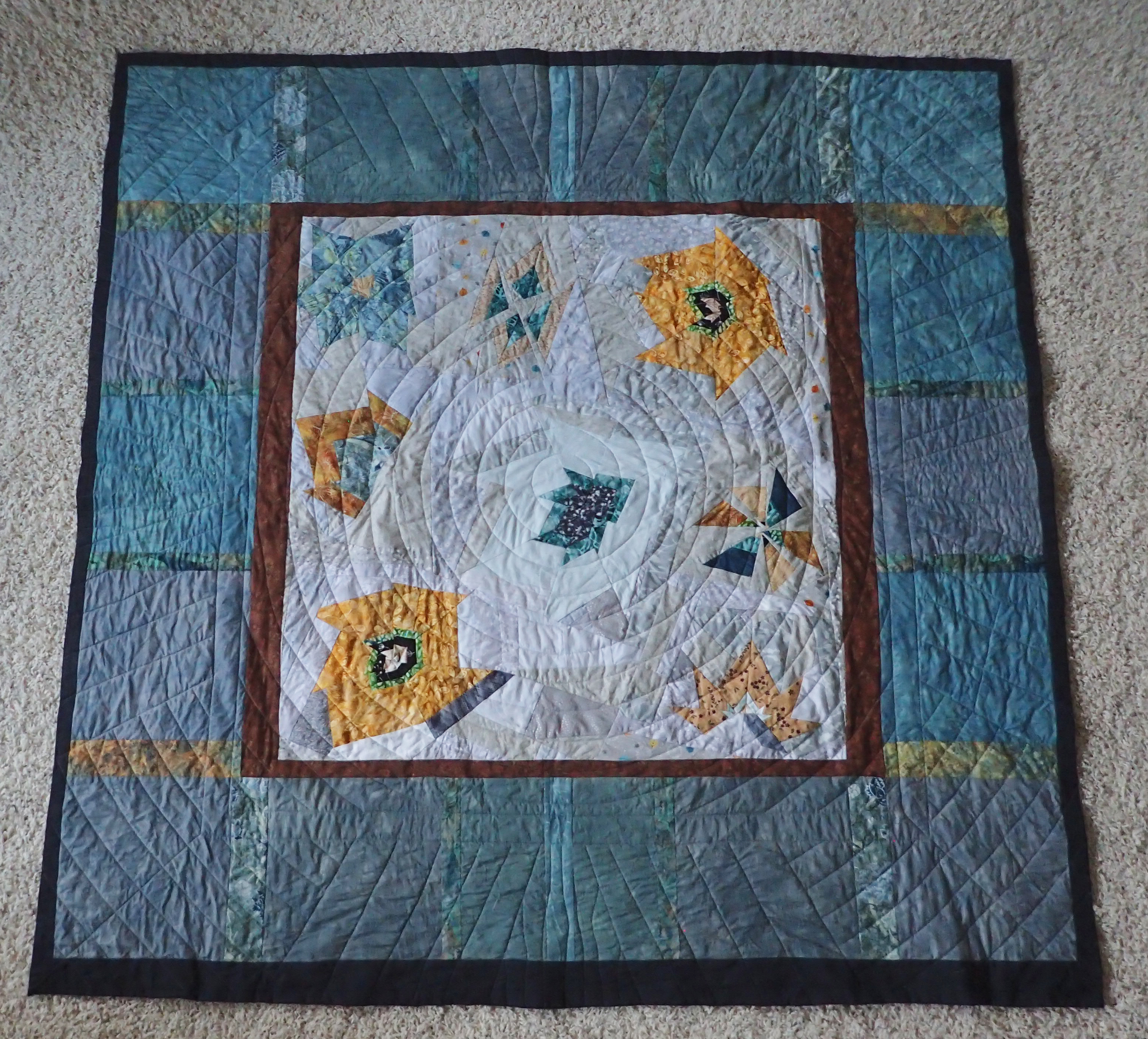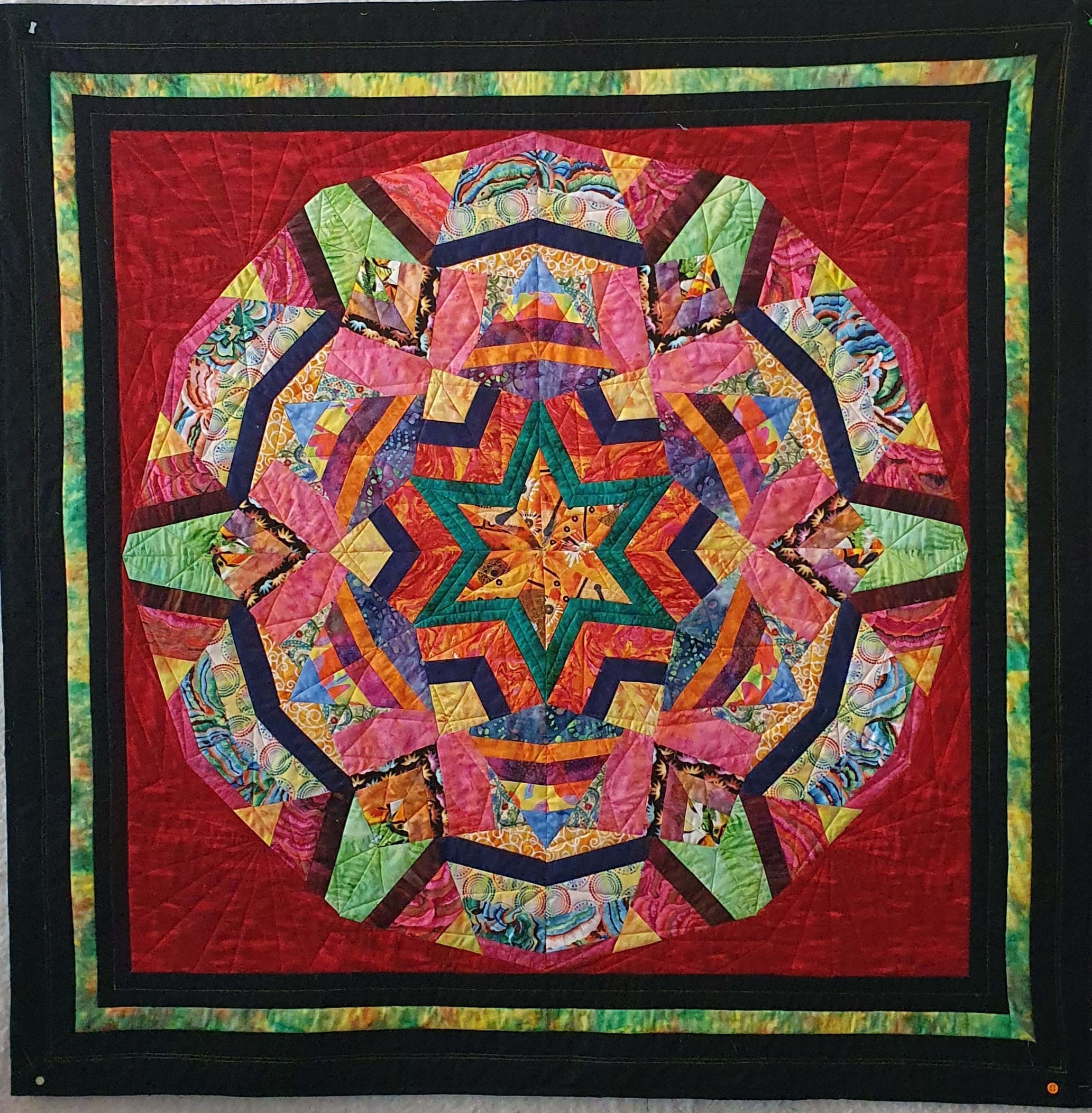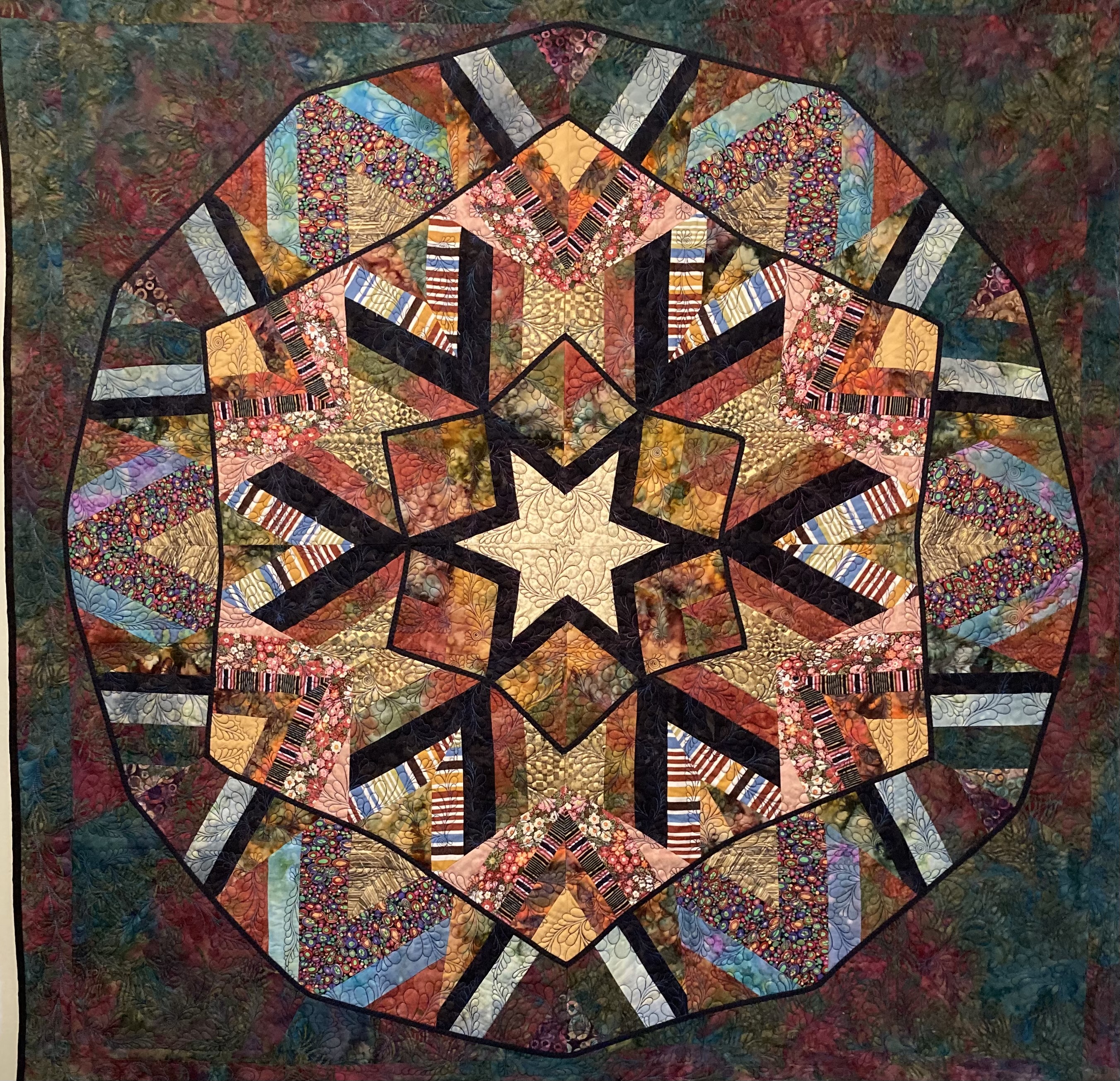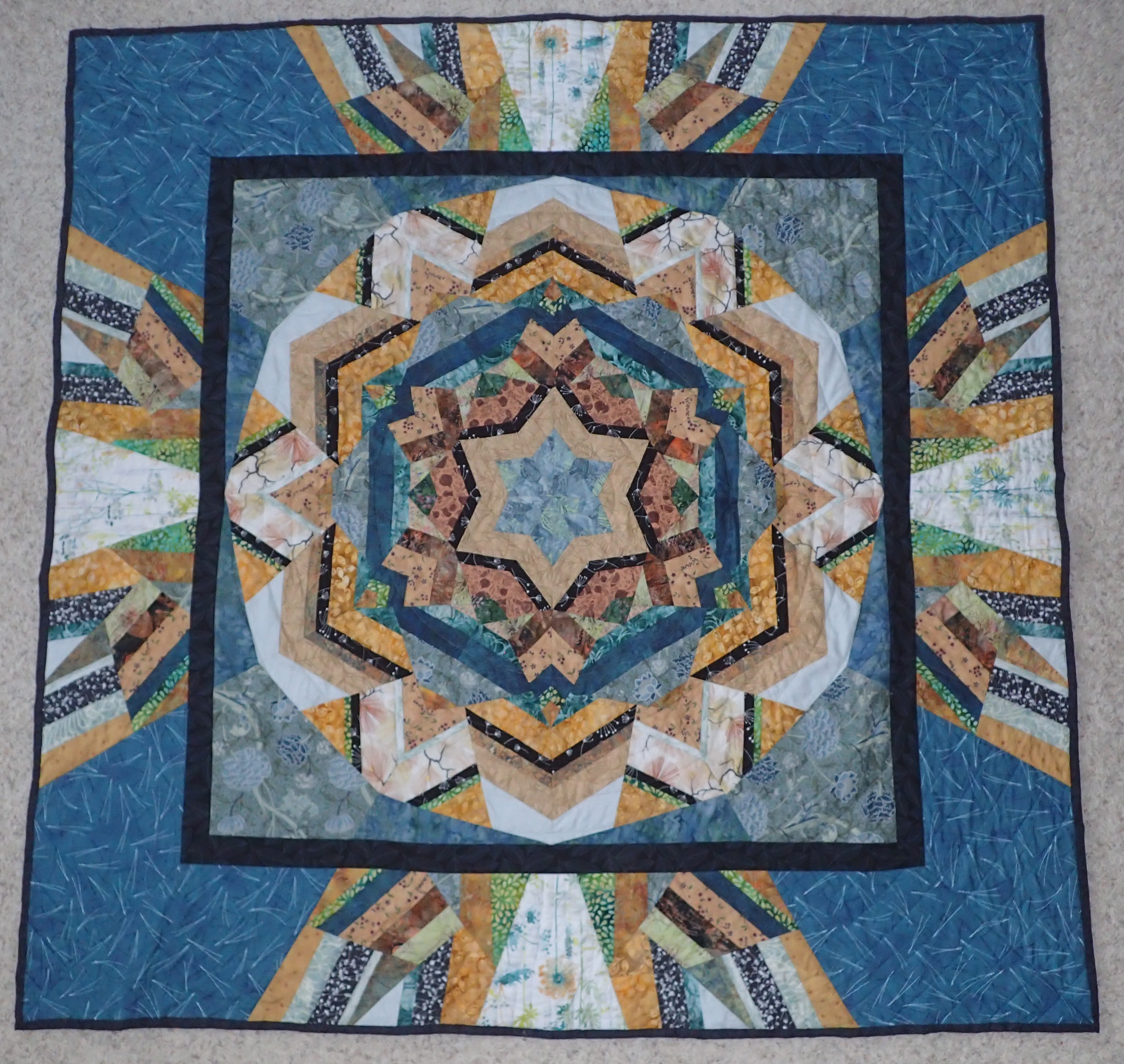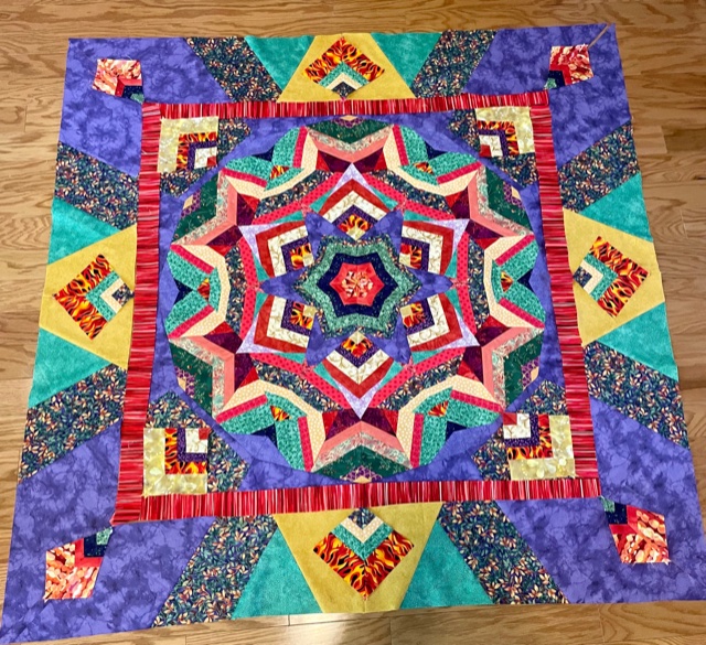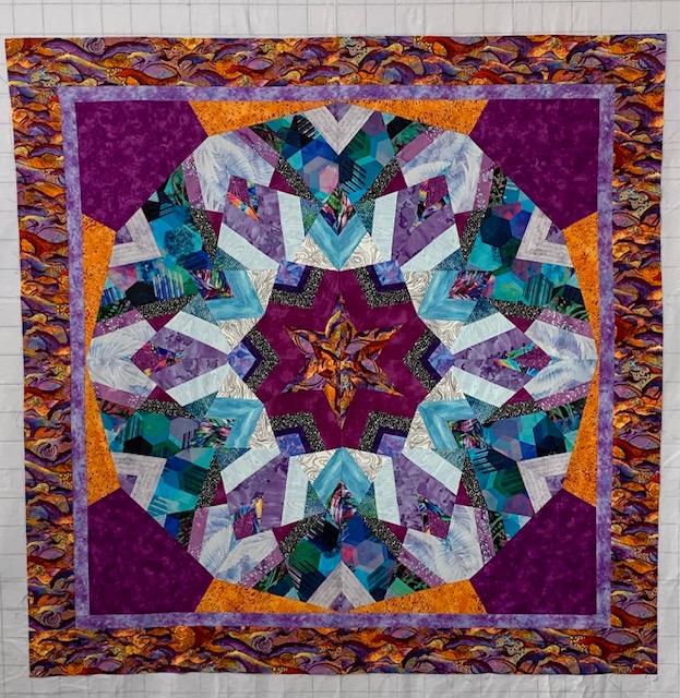 [QUOTE=AMiller;n887726]My Kaleidoscope quilt is finished! For the back I used scraps. I used Sharon Schamber's basting method of rolling the top and back onto trim boards. For basting, I used the herringbone stitch with Superior's Vanish water soluble thread. It disappeared immediately when I soaked the finished quilt in water. I still got a few puckers on the back when I quilted it but not serious. I quilted it with concentric circles for the center part and simple lines outward for parts of the outer border. [/QUOTE]