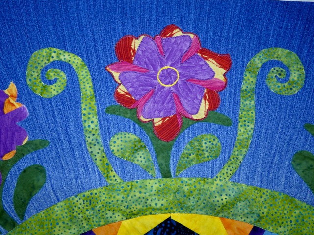 My Blooming Kaleidoscope with Ricky Tims couching on flowers. Progress on edge stitching the applique is taking way more
