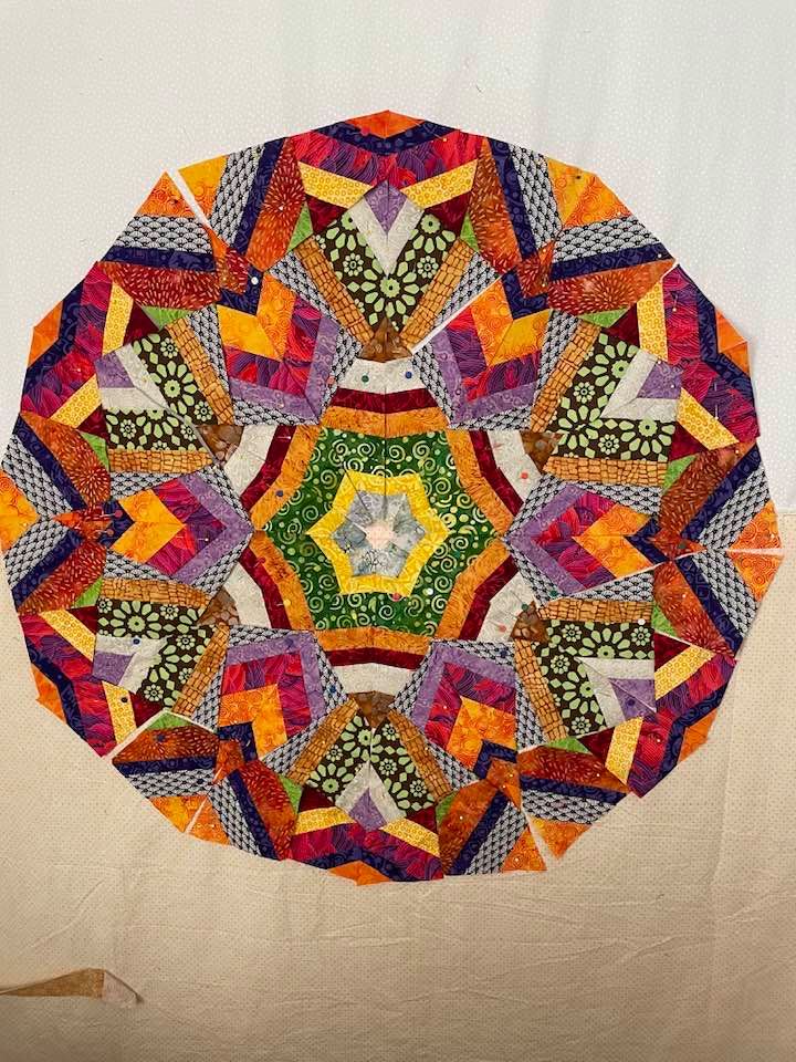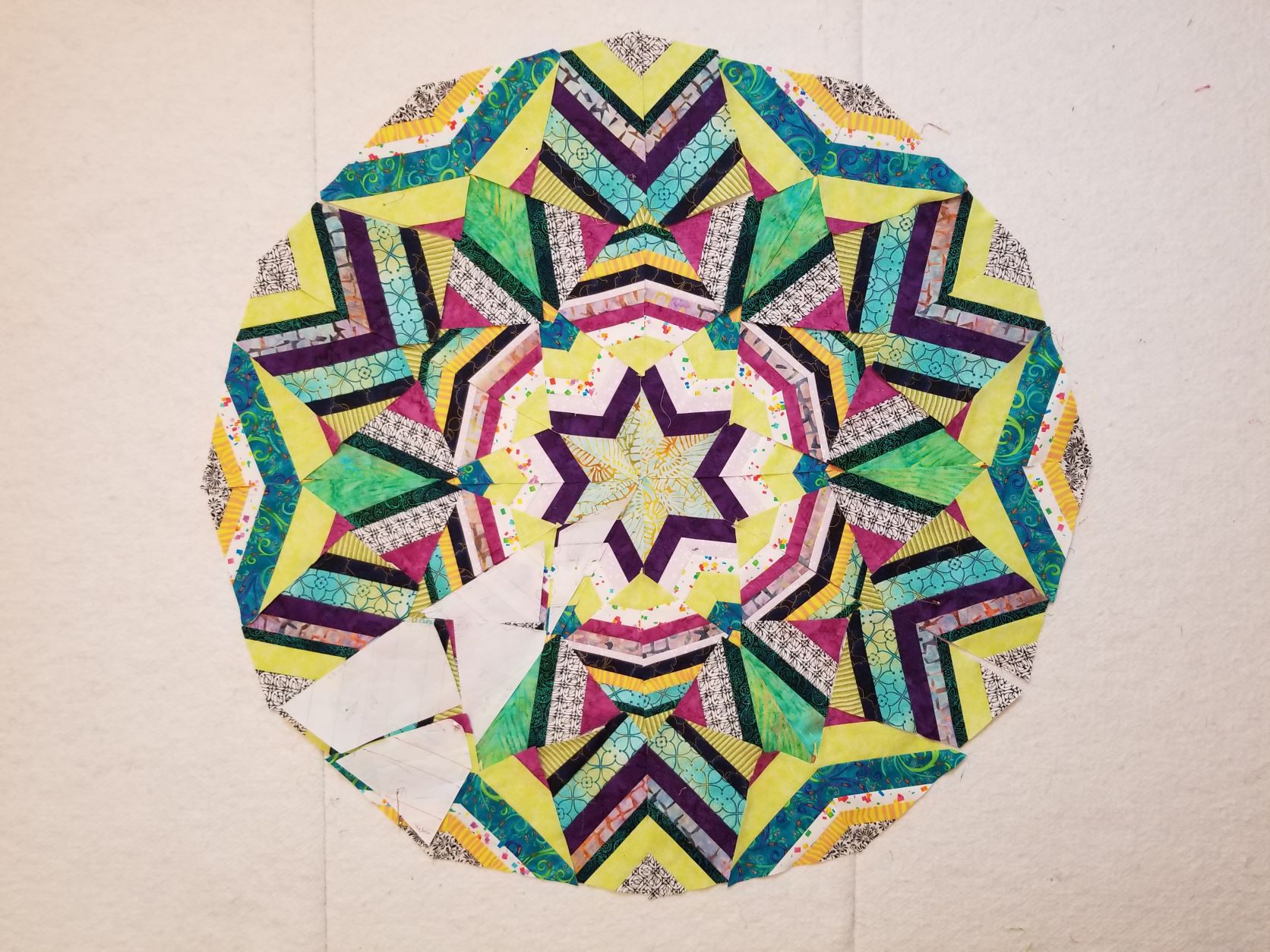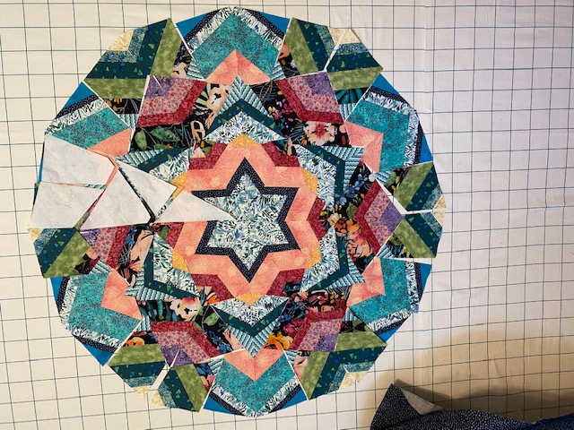 Just starting (had to finish my last project so I could change out the navy thread). So excited to see my first round. Ricky said to pick fabrics I liked. It’s bright for sure. We’ll see…,