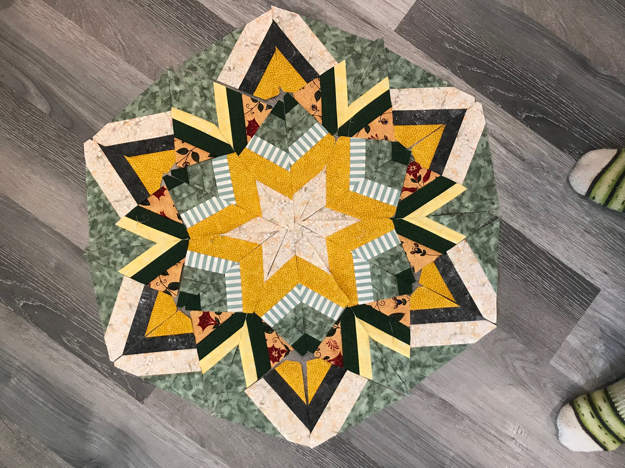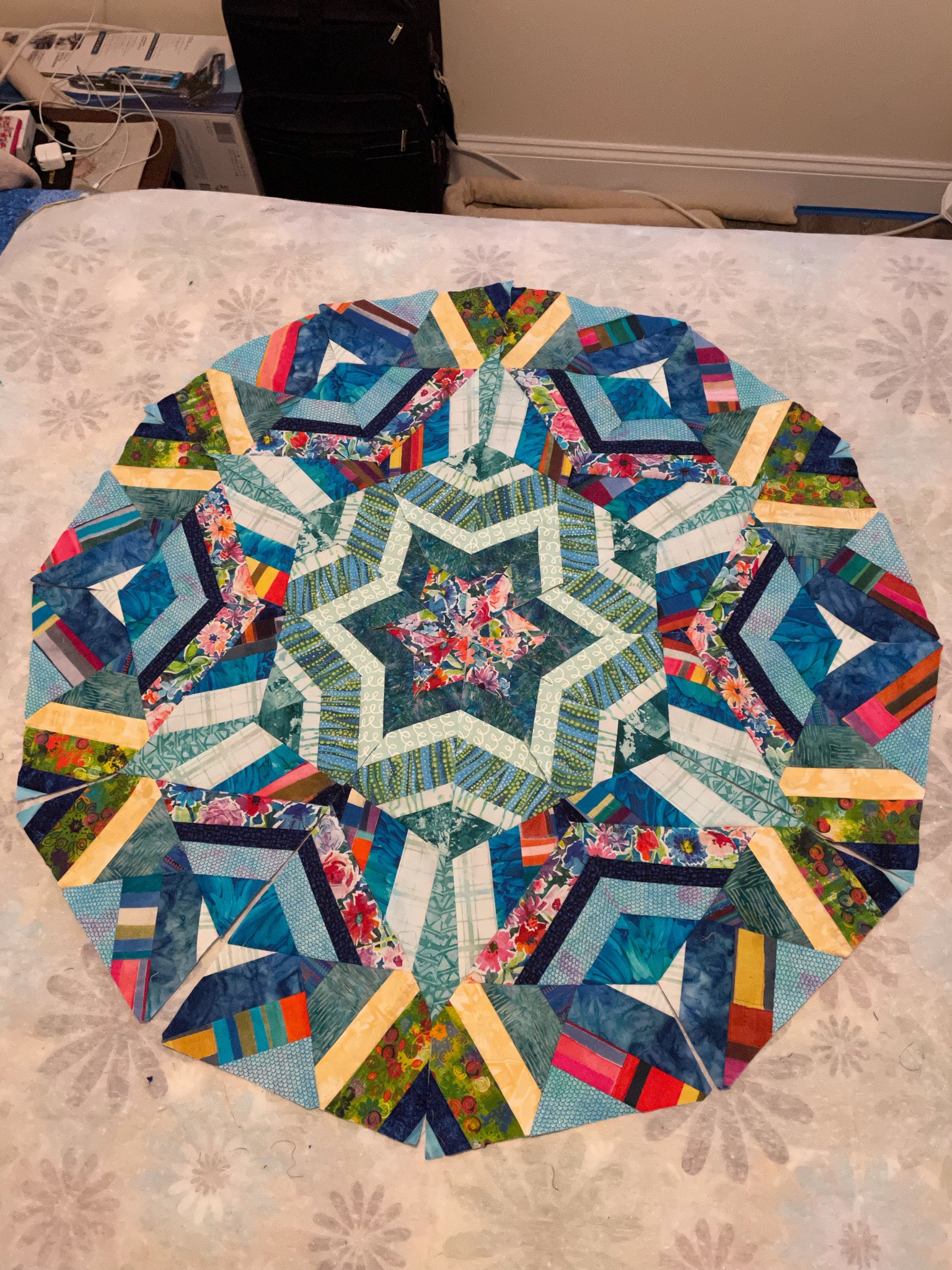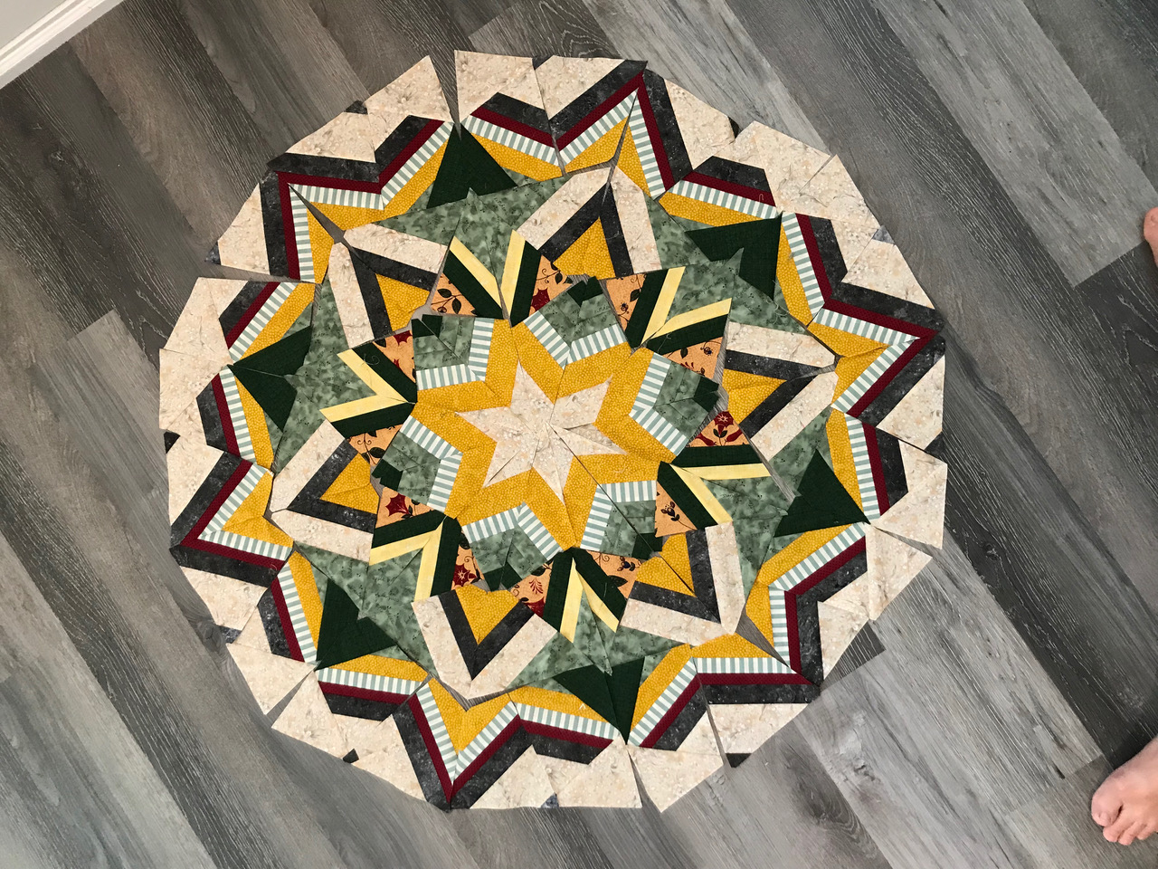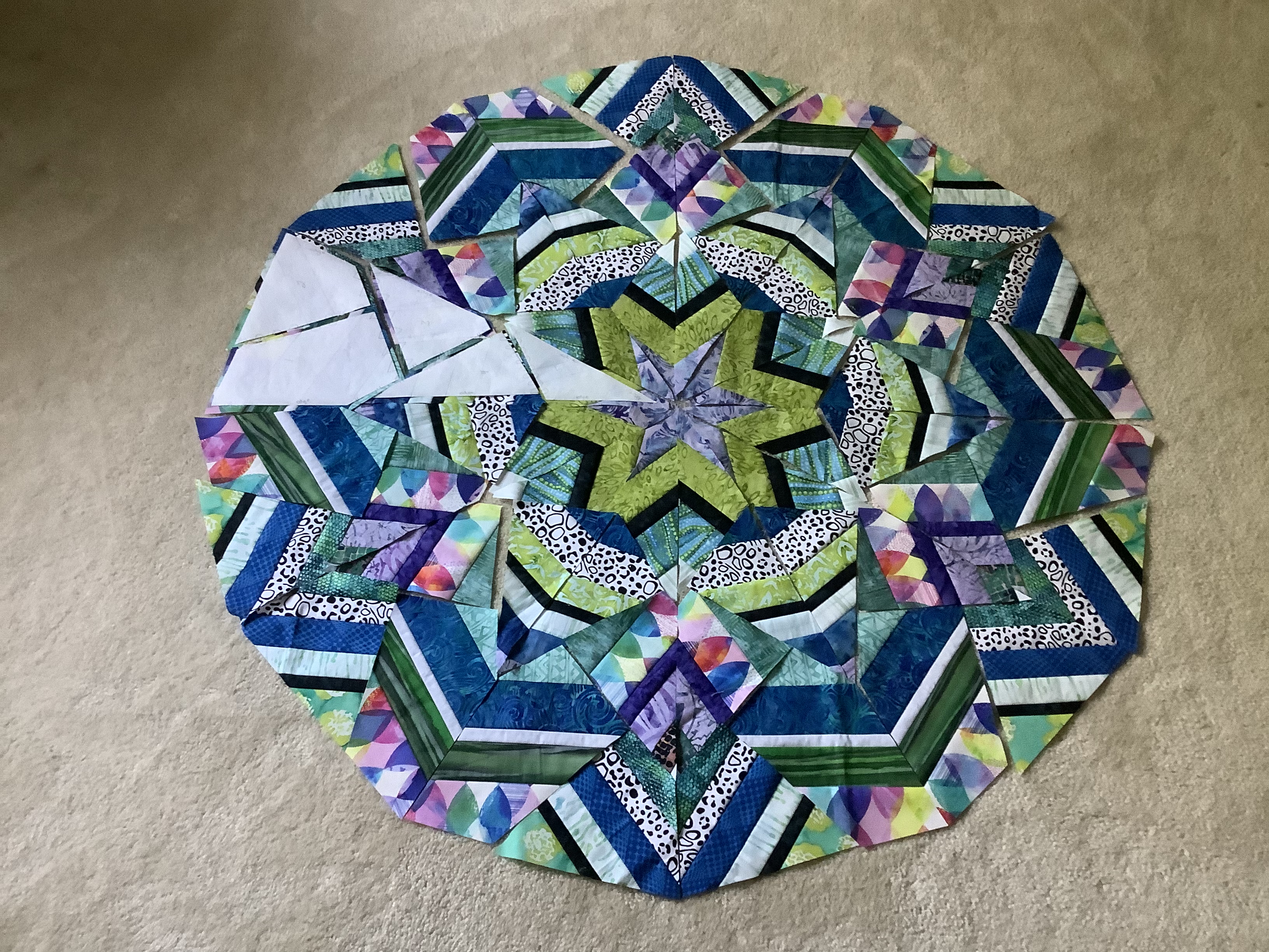The circle is complete. It's a full inch wider than it should be, 37.5" instead of 36.5". That's due to seam allowance--must have a few that are slightly too narrow. It's square so I'm OK with that.