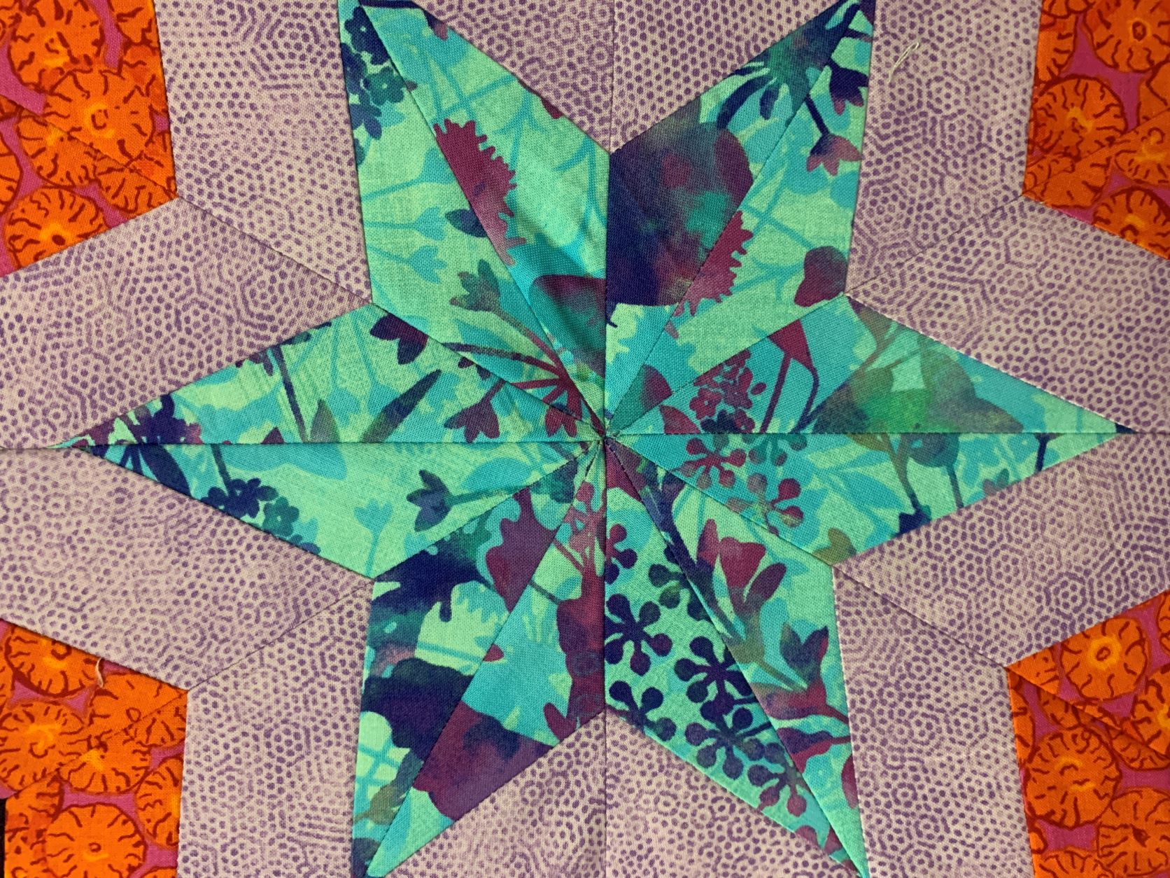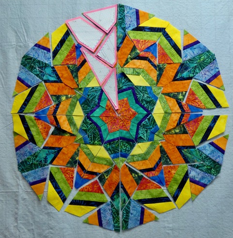 Ricky mentioned some might have tricks for getting the center to align. Whenever I have more than 6 seams coning together, and this one has 12, I pin the center then machine baste for about an inch--using a big stitch length--5.5. I check to see how it looks and can quickly pull out the basting and try again. This took two attempts. I leave the basting in place until the seam is completely sewn. If I can then remove the basting stitches, I do--it often takes tweezers. A lot easier to remove basting stitches than regular sewing stitches to get it as close to perfect as I can.