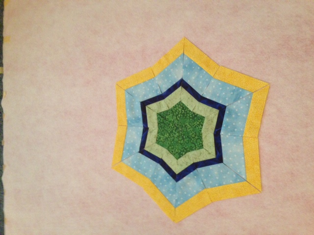 Linda R, Your center is beautiful. The process is not done in the way you are doing it. The center is template 5. You put the kaleidoscope together in reverse order. That means you add the template #1 to 2, then add 3. The last piece is number 5.