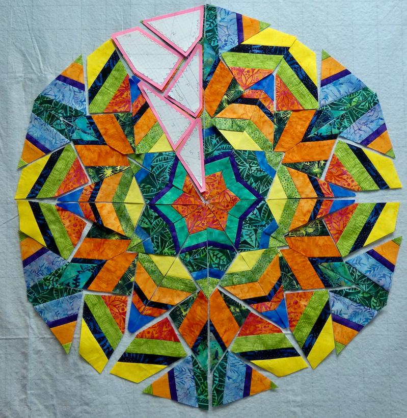 the outside of the edge working your way in to the center, template 5. The circle does not become a circle until the wedges are sewn into 4 square quadrants, then the squares are put together like a 4 patch, and the magic, is now there are circles for the kaleidoscope just appear. HelenW