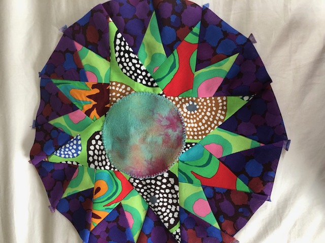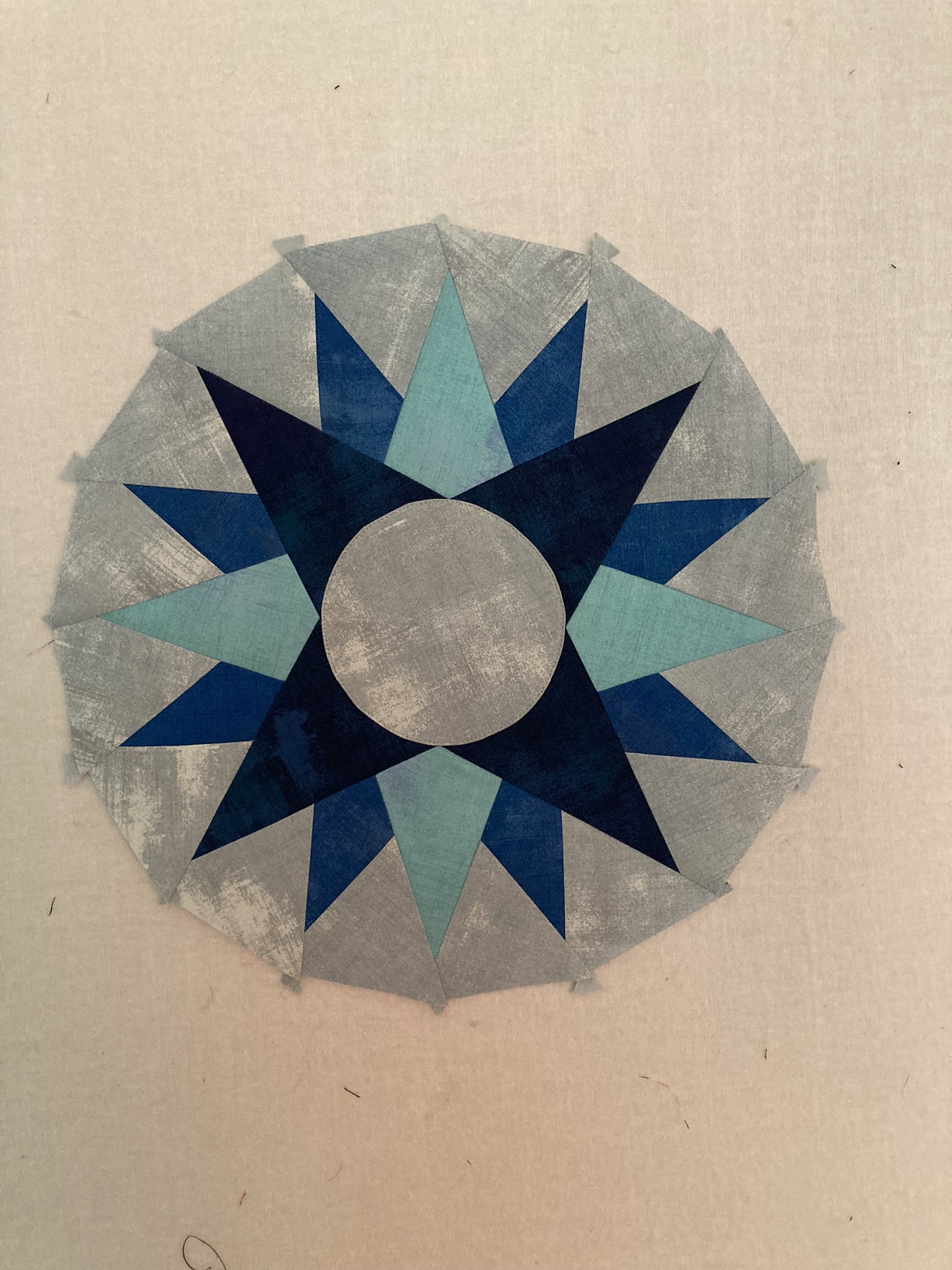I have finished with the compass. I used a bit of Ricky's hand dyed fabric for center and even used the double hem stitch to appliqué that he likes to use. As usual, I can not get my computer to co-operate with uploading the picture.