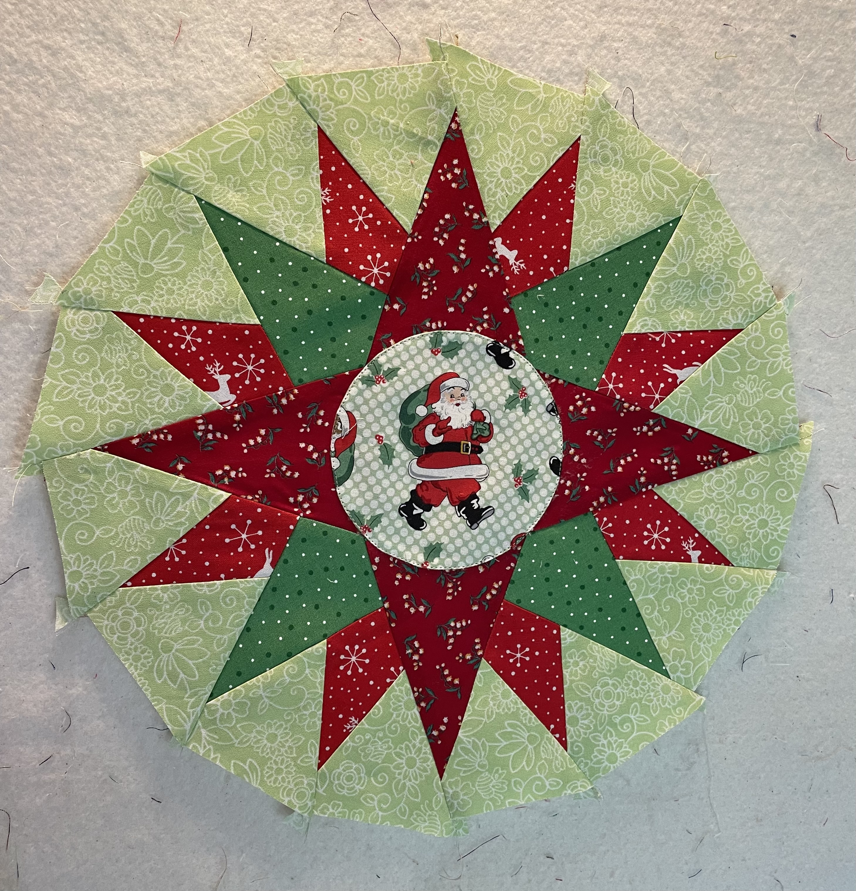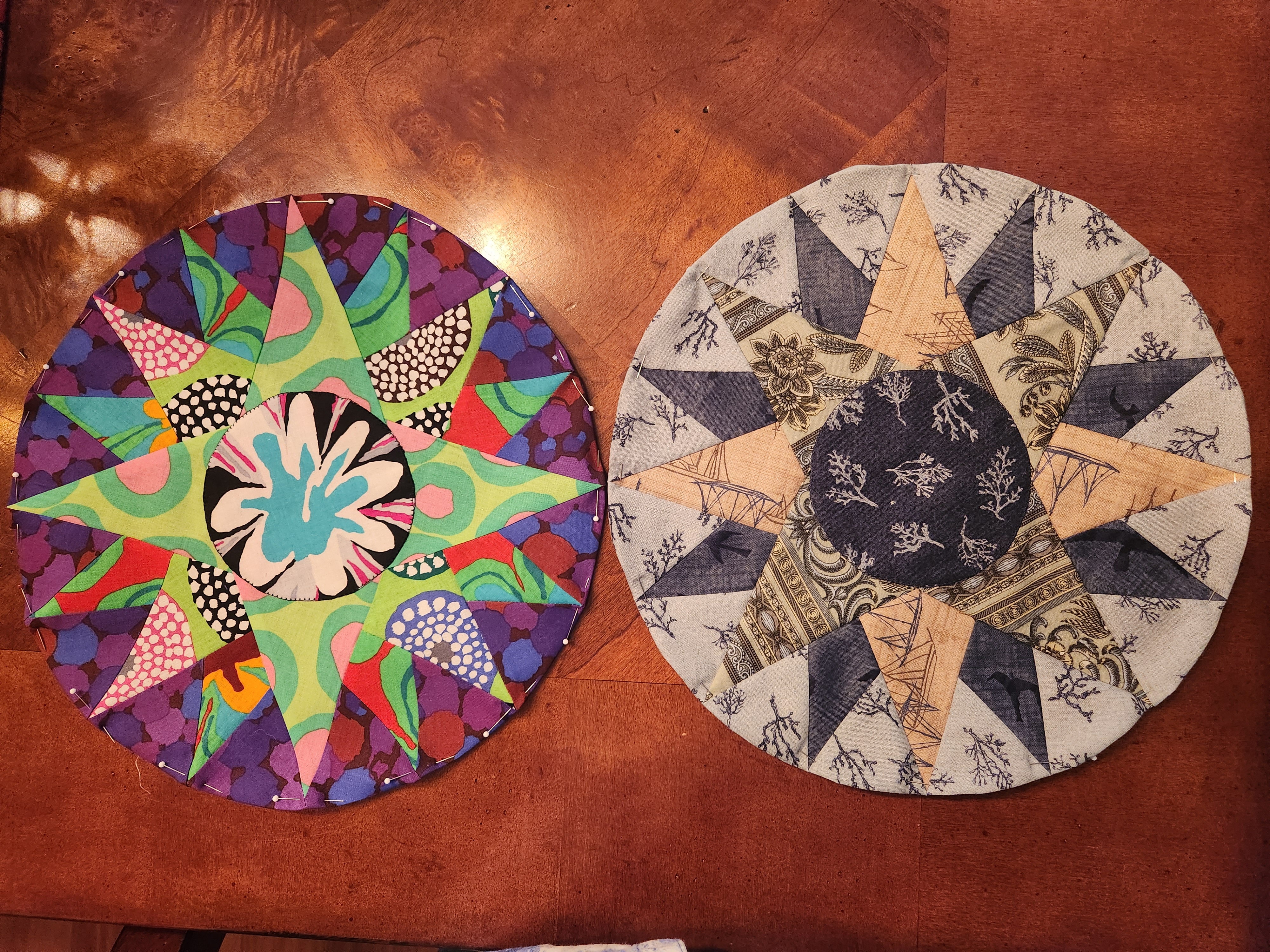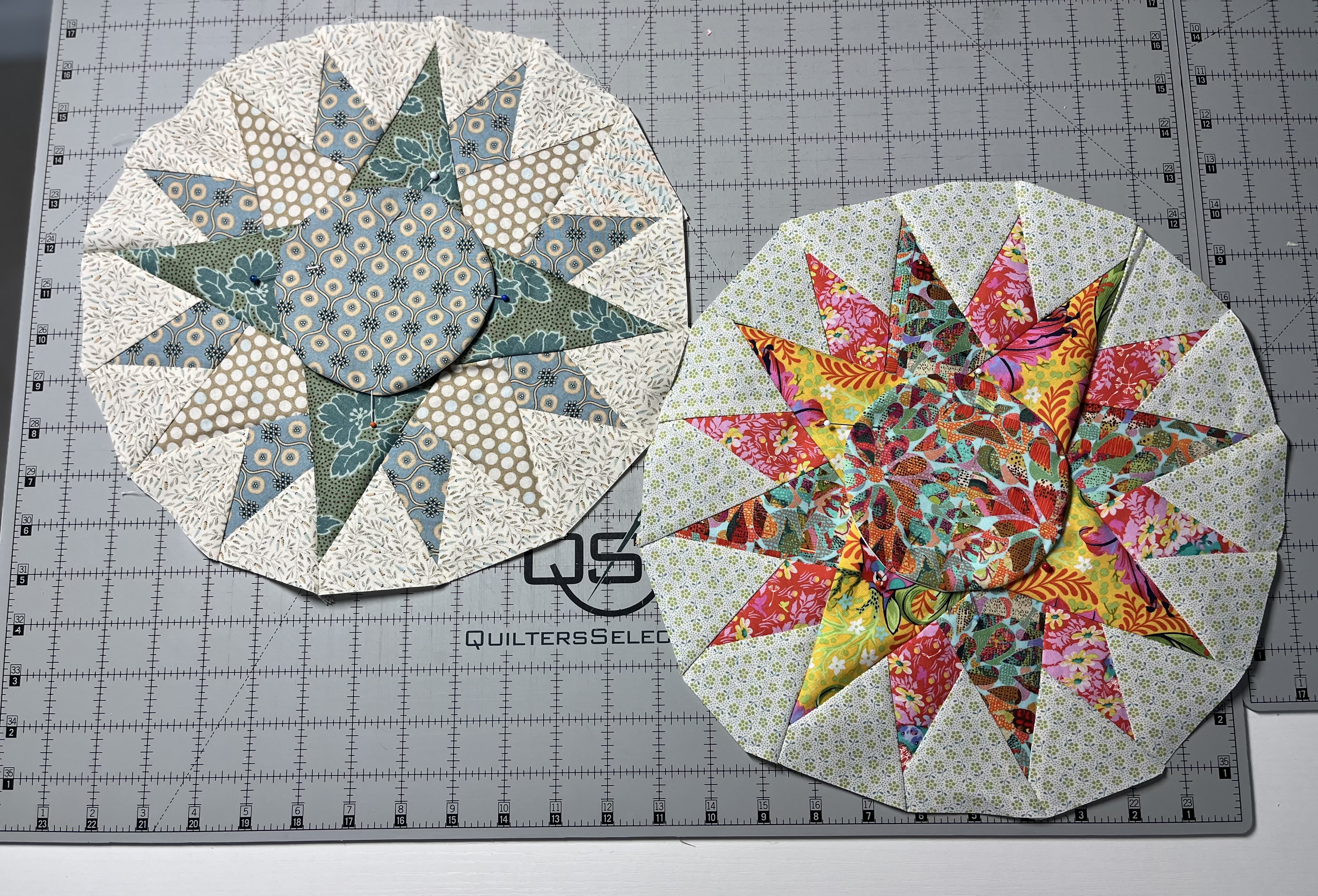 The one on the bottom was my practice block which I got carried away and used the 2nd piece for the 3rd piece (same fabric) so I said “Oh well”. The one on the top Was my second attempt but it’s hard to get the variety of color change, picking from my own stash of fabric. But I will keep rolling on it. Haven’t decided on the centers yet.