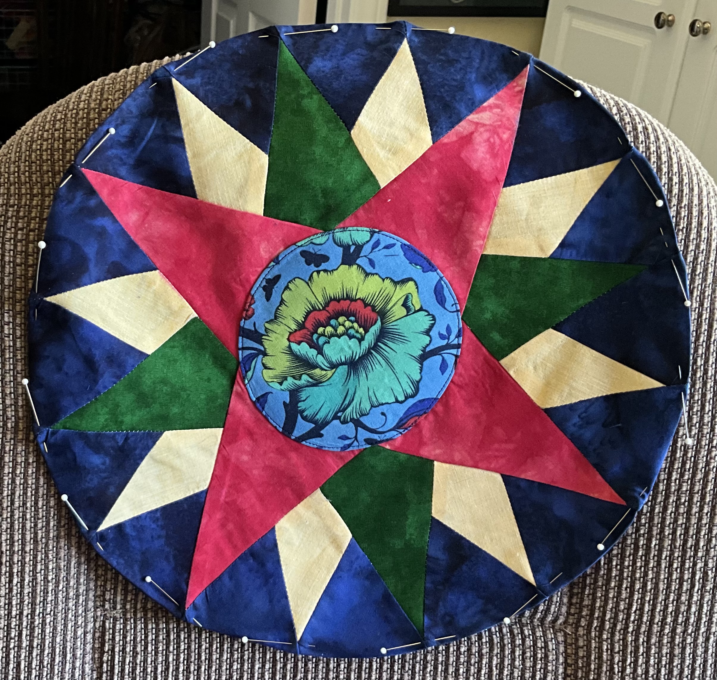 I made 2 practice blocks. The first one, with the pink center measured 11 1/2 inches, I tried again . The next one was slightly better. I sewed them back to back to make a pillow. Next I experimented with a 6 inch block. I'm thinking of making mug rugs to give out as gifts. I give up on showing the other pictures When I try to put the other picture in, it only shows the picture below and not the one I just resized, when I go to my file the picture is in there.