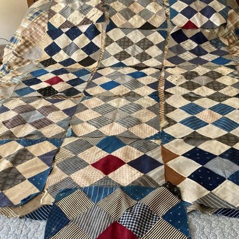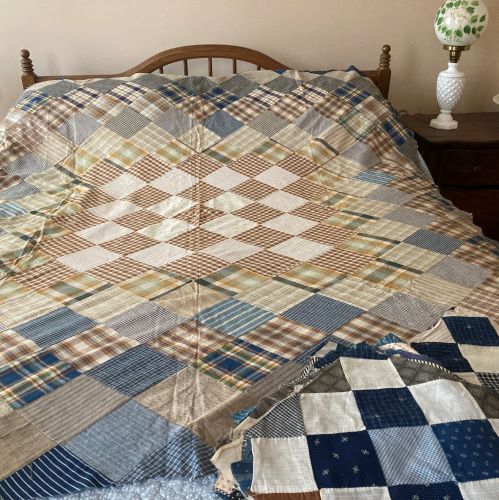 I have a quilt top and 16 quilt blocks that were hand pieced by my late husband’s Step-Grandmother. The fabric is from his Grandfather Claude’s shirts. Claude died in 1951 so I believe that is when the fabric dates from and the top and blocks would have been made before 1977 when Zoe passed away. I think the top was intended to be a ‘Trip Around The World’ quilt but as Zoe got farther from the center she didn’t have enough of the same fabric to go all the way around and had to add other fabrics. It is approximately 74” x 74”. My plan is to hand quilt and make the binding from my late husband’s shirts.