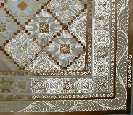 My quilt almost done. Binding in progress. The Edge to Edge pantograph my longarm quilter used is called Feather Flourish....
