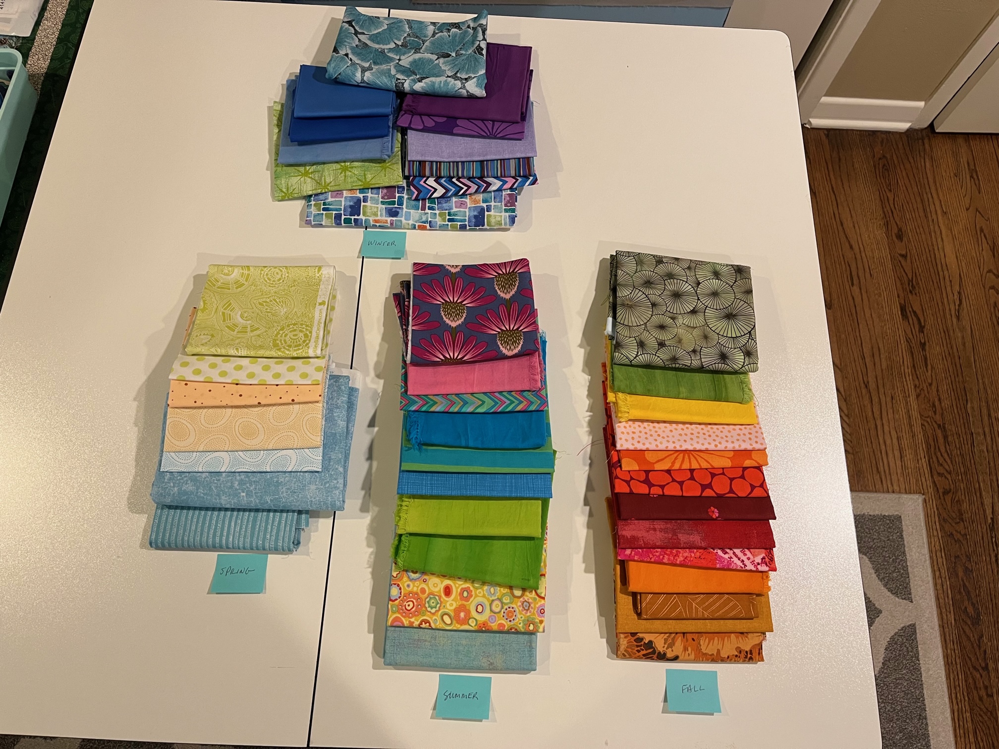 Here are my photos for warms/cools and then for the 4 seasons. I have a couple fabrics that could go either way and various seasons. Also I posted an alternate focus fabric that I just found. So I'm not sure what I'll use yet. I'll wait to see as we continue with the classes. I'm enjoying this exercise!