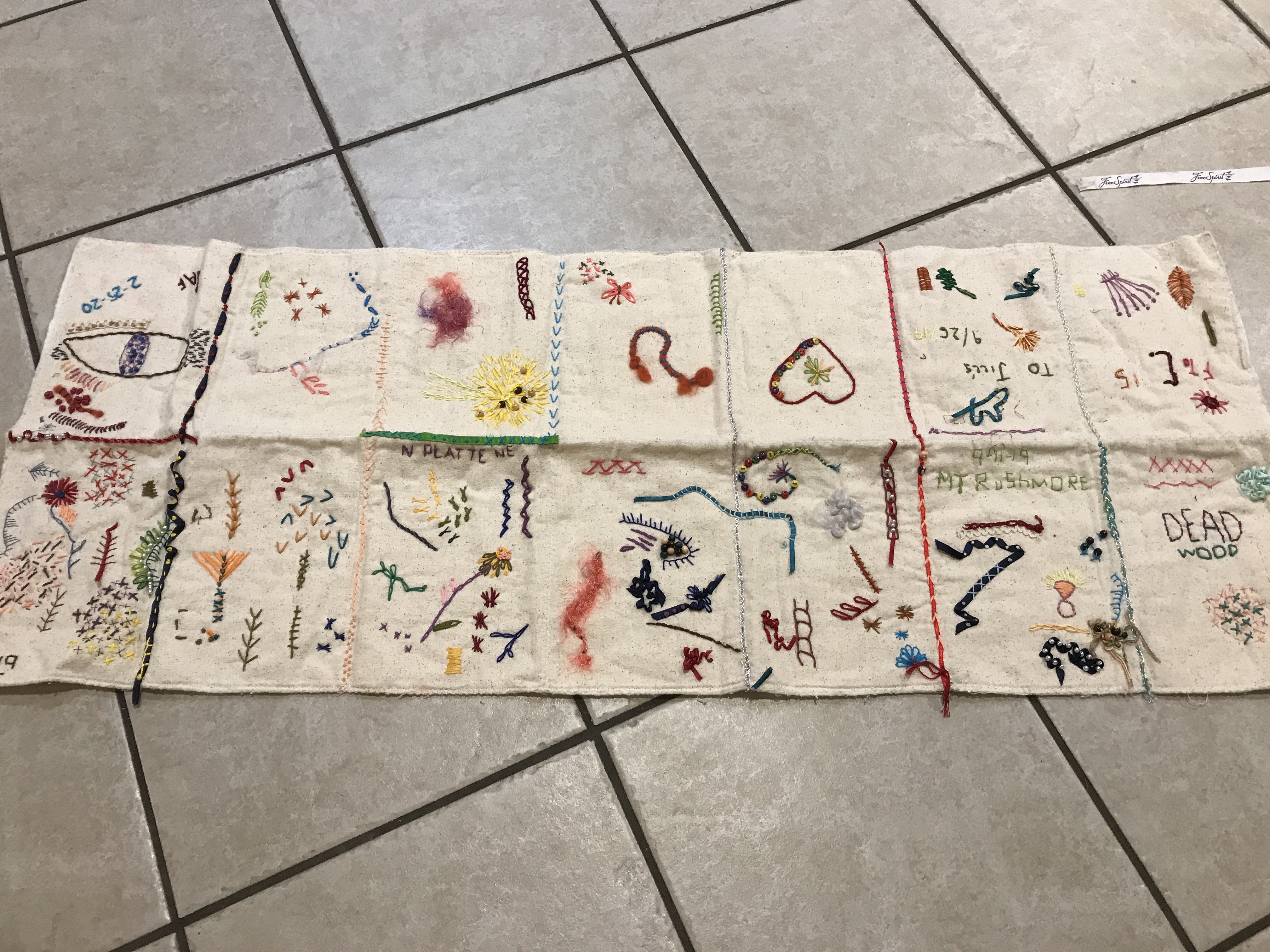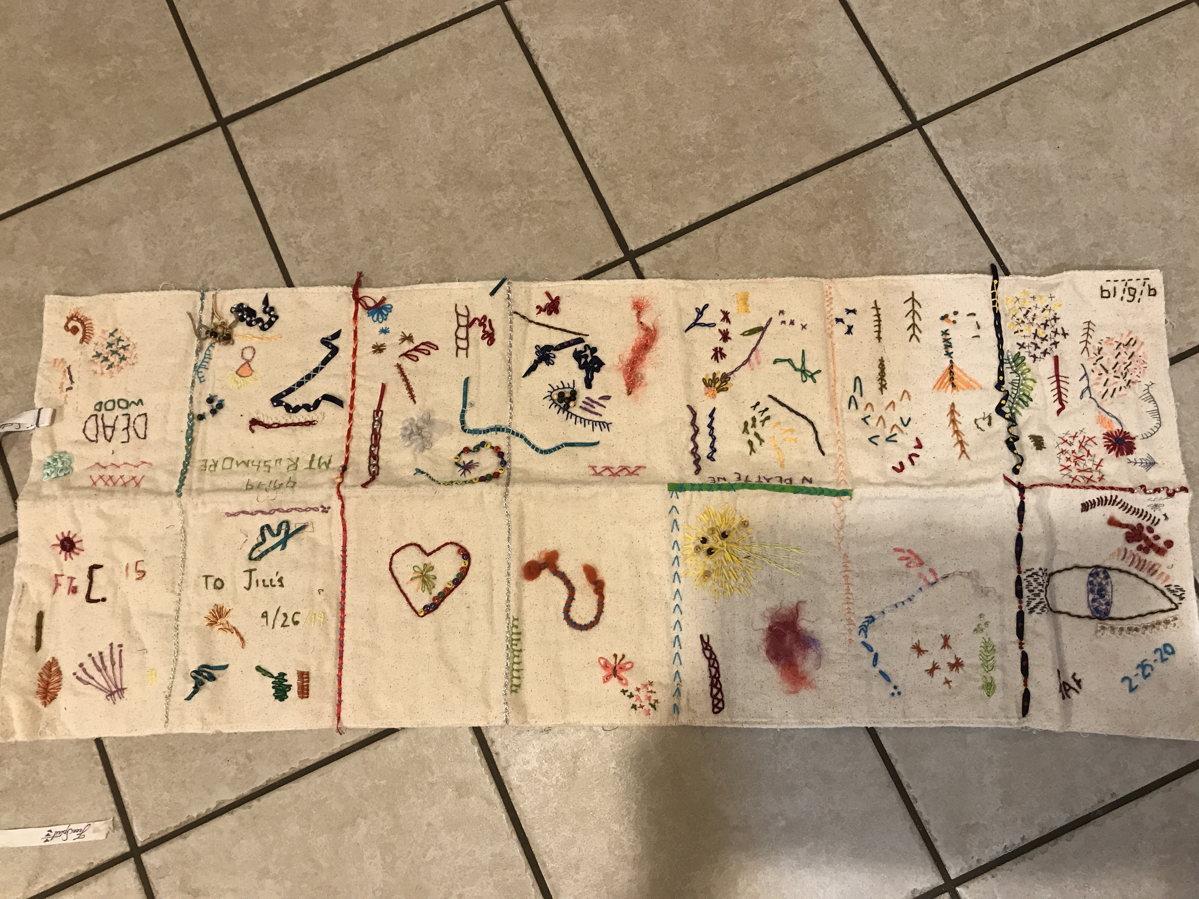 alex embroidery stitches sampler on folded linen-like fabric