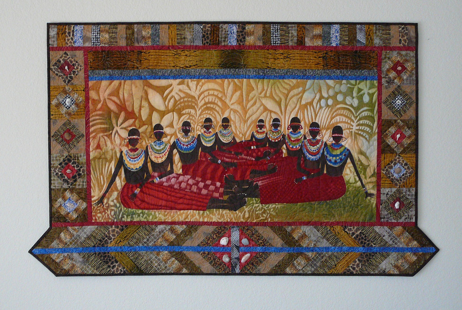 Tribal Affair - Art quilt made from a commercial panel which was surrounded by quilt blocks and embellished with shells.