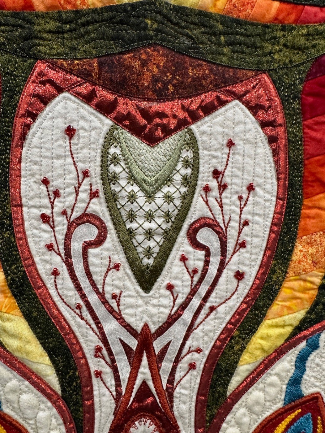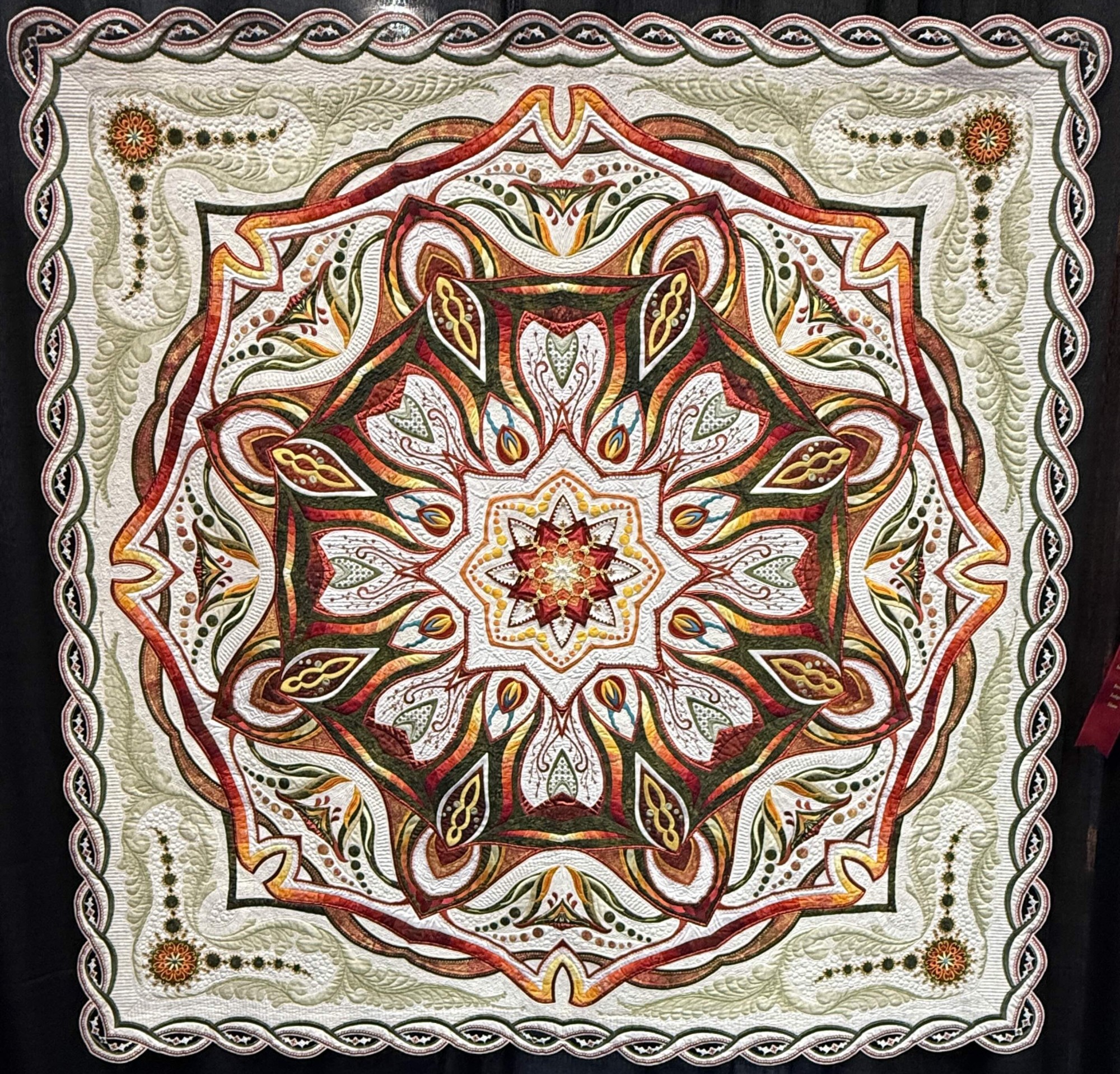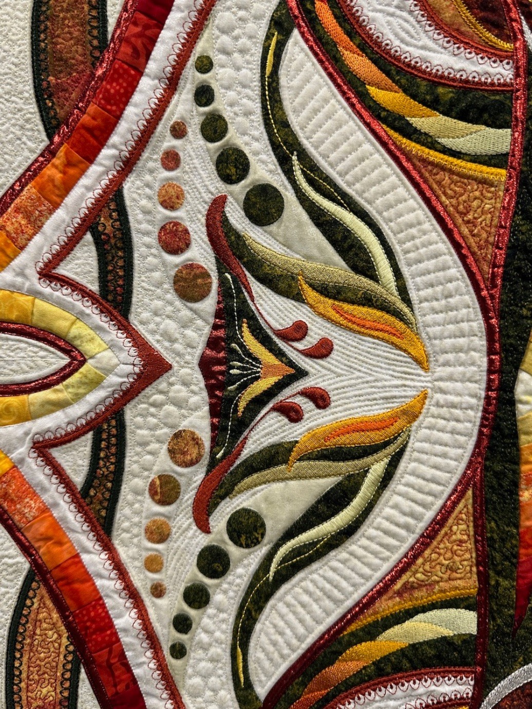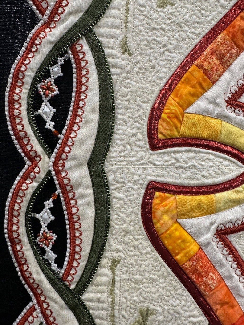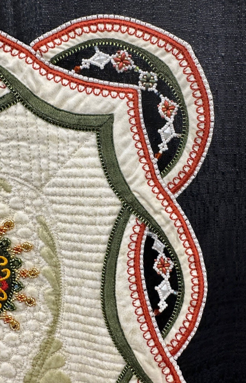 Automne is another of Colette's stunning, intricately planned, and masterfully put together quilts featuring beading and cut outs. She is known for and loves using thousands of seed beads and crystals in her quilts, and this one is certainly no exception. In addition to recently winning the Best Wall Quilt Award at 2024 AQS QuiltWeek - Branson, Automne also won Second Place in the Wall Quilts – Stationary Machine Quilted category at this year's AQS QuiltWeek in Daytona Beach.