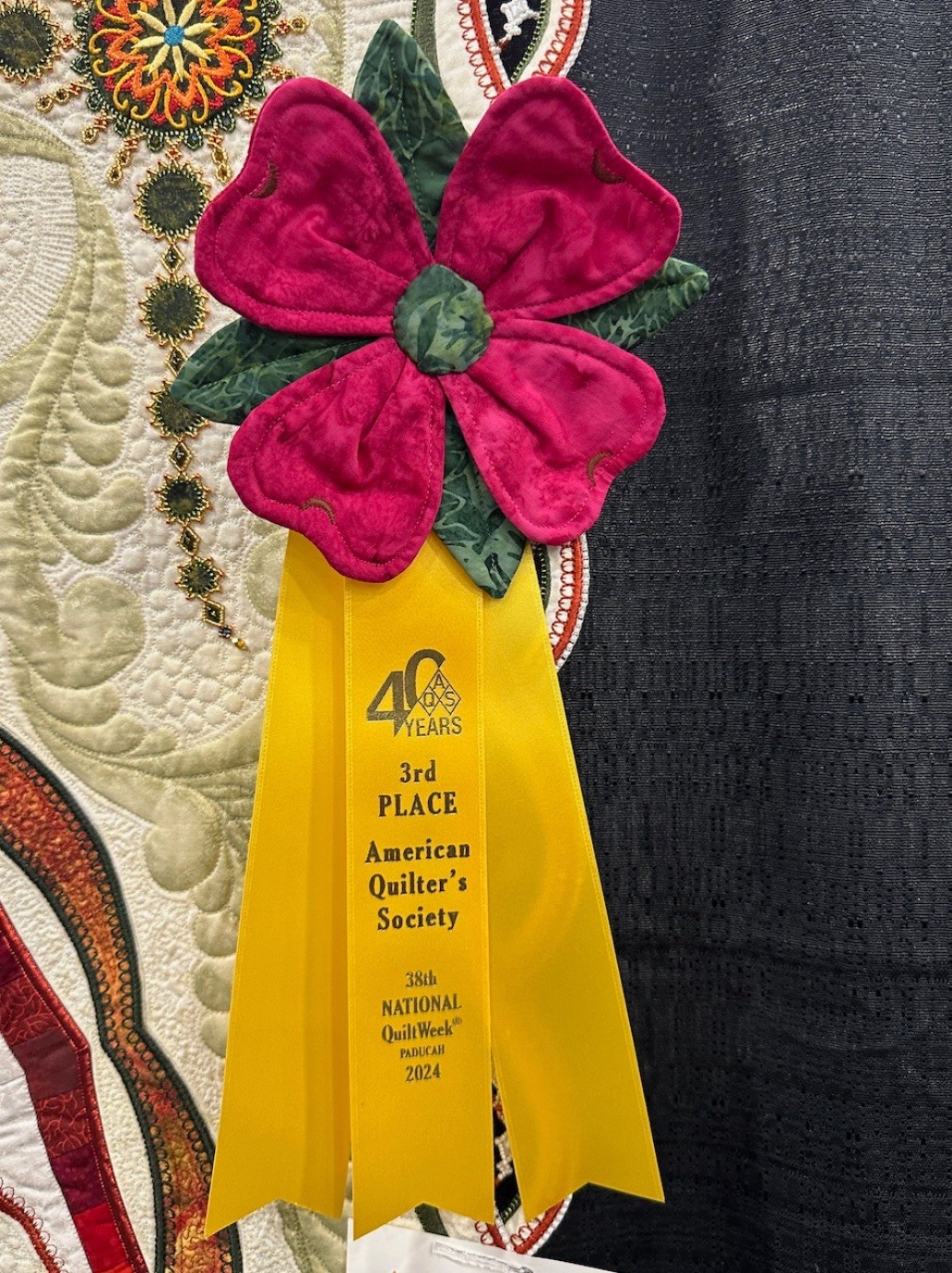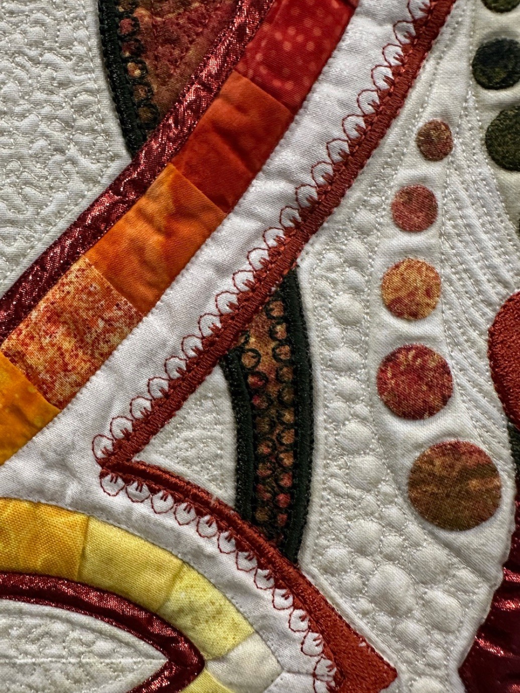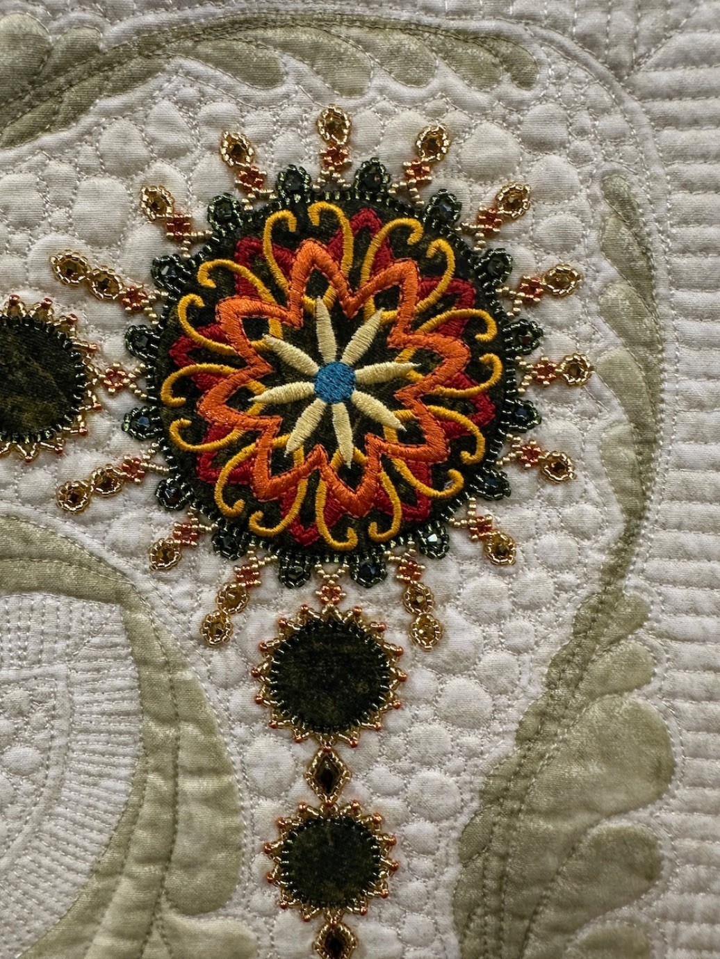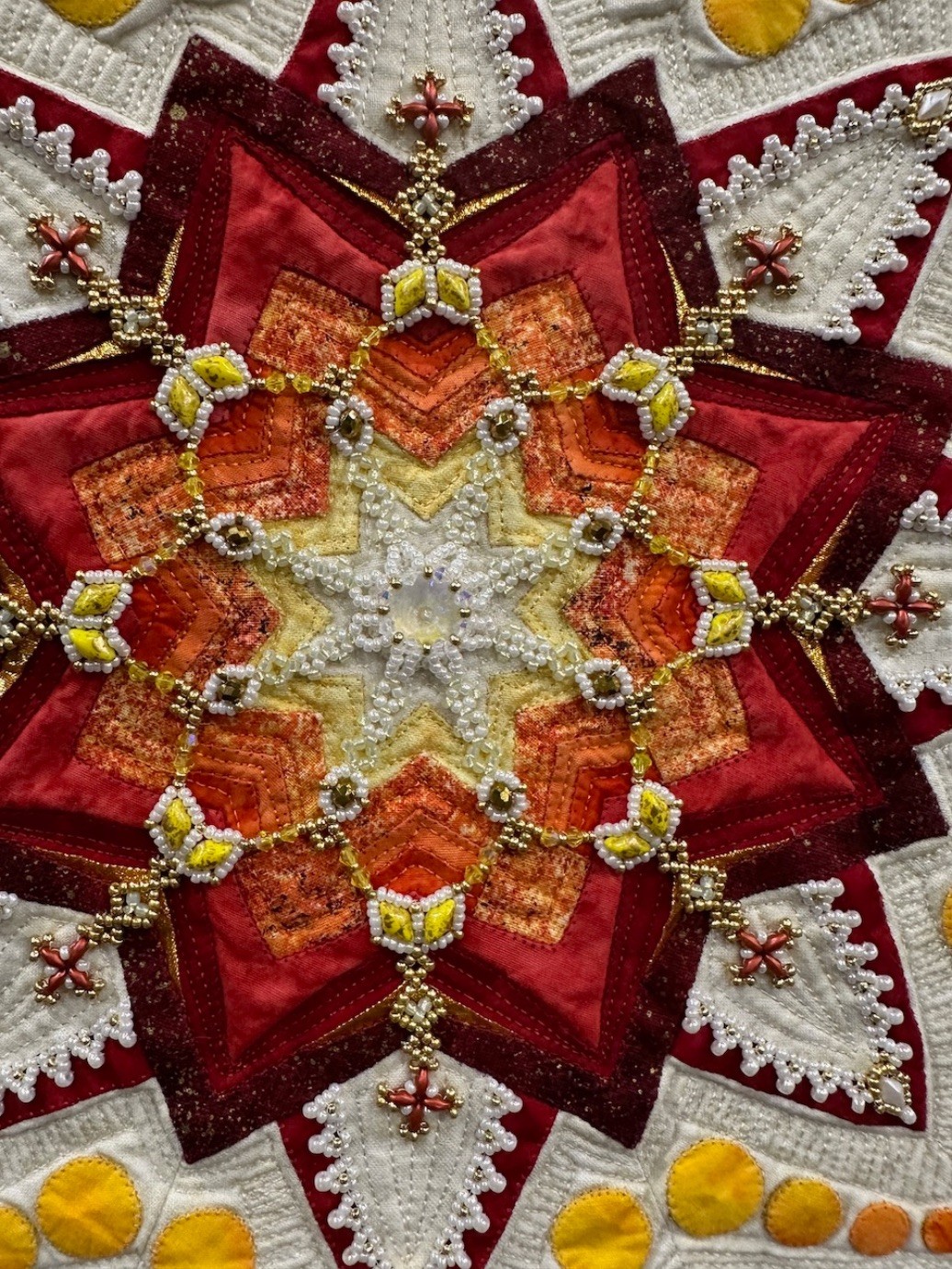 Automne is another of Colette's stunning, intricately planned, and masterfully put together quilts featuring beading and cut outs. She is known for and loves using thousands of seed beads and crystals in her quilts, and this one is certainly no exception. In addition to recently winning the Best Wall Quilt Award at 2024 AQS QuiltWeek - Branson, Automne also won Second Place in the Wall Quilts – Stationary Machine Quilted category at this year's AQS QuiltWeek in Daytona Beach.