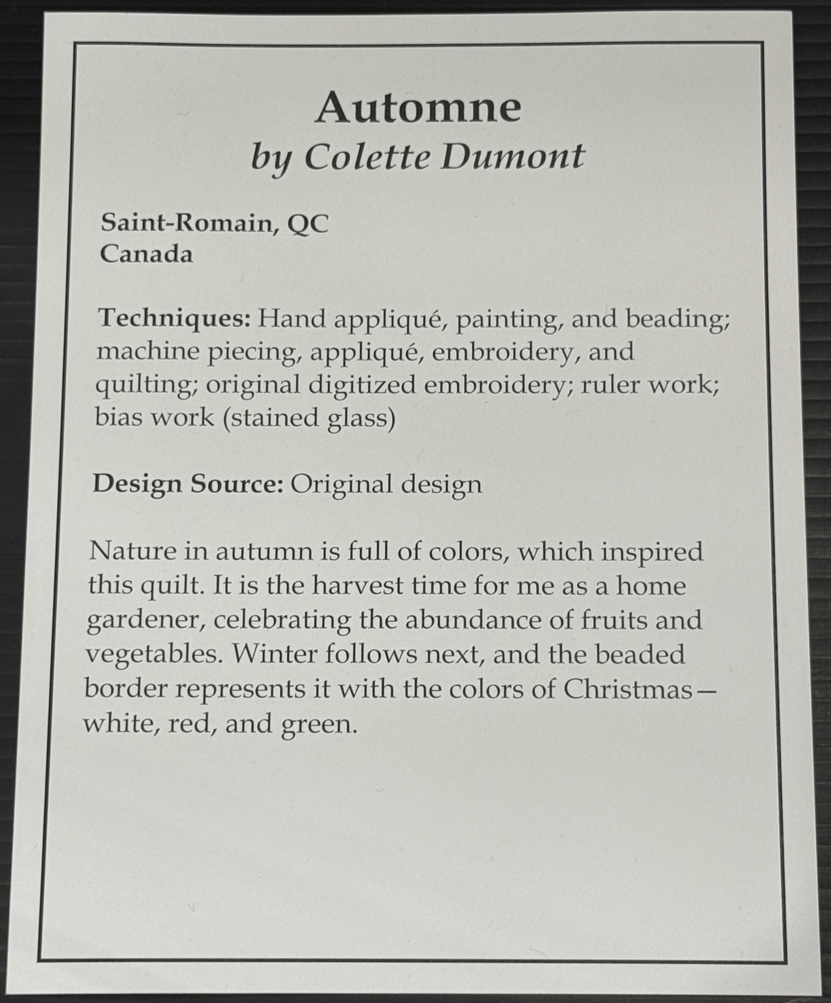 Artist Statement (Houston 2025): "Nature in autumn is full of colors, which inspired this quilt. It is the harvest time for me as a home gardener, celebrating the abundance of fruits and vegetables. Winter follows next, and the beaded border represents it with the colors of Christmas—white, red, and green."