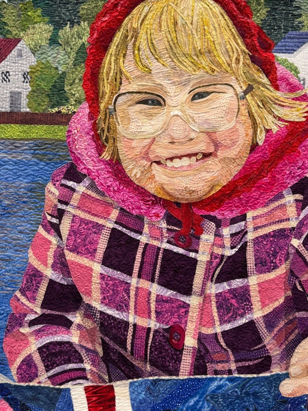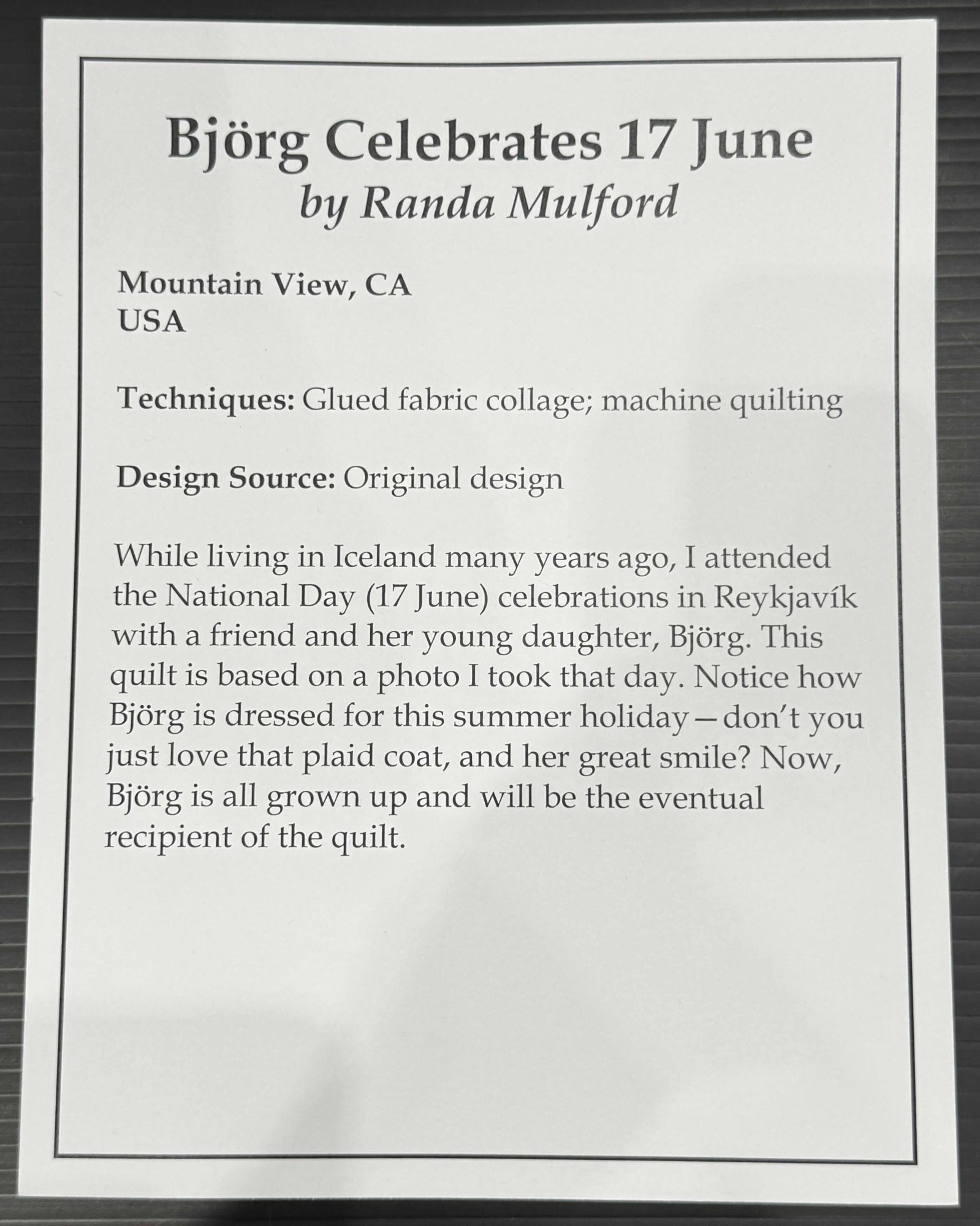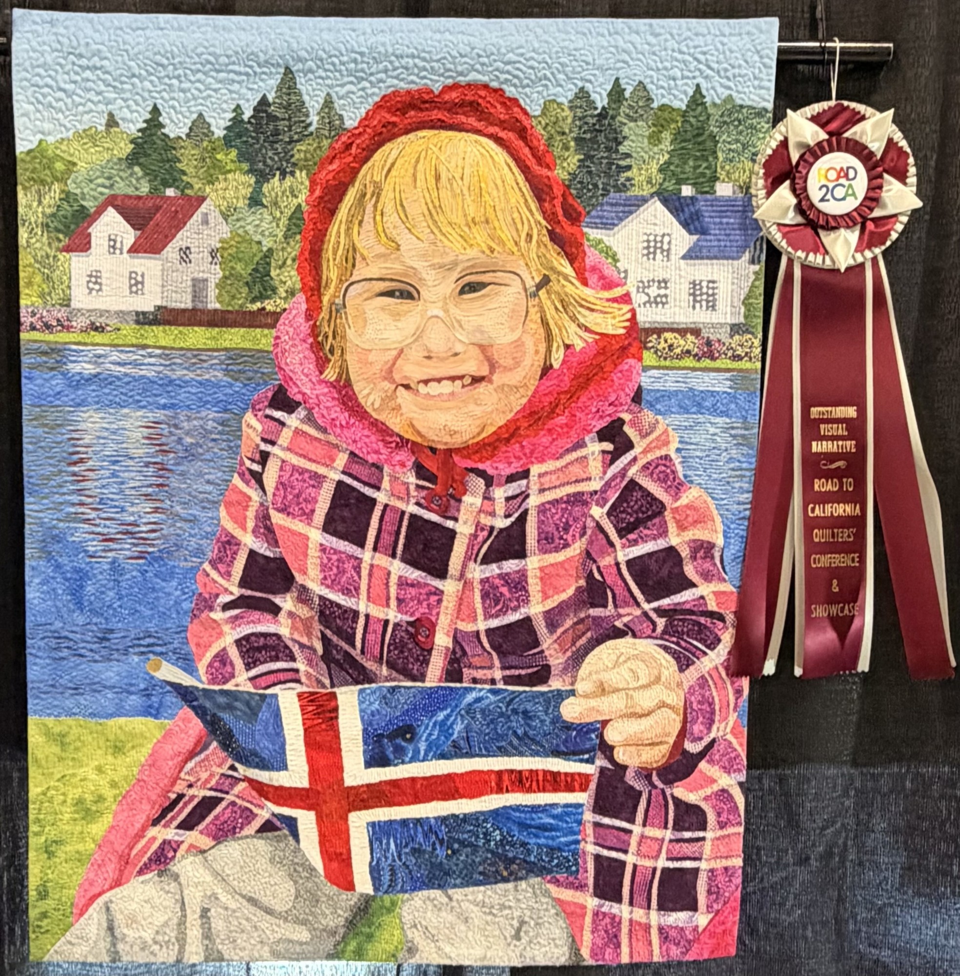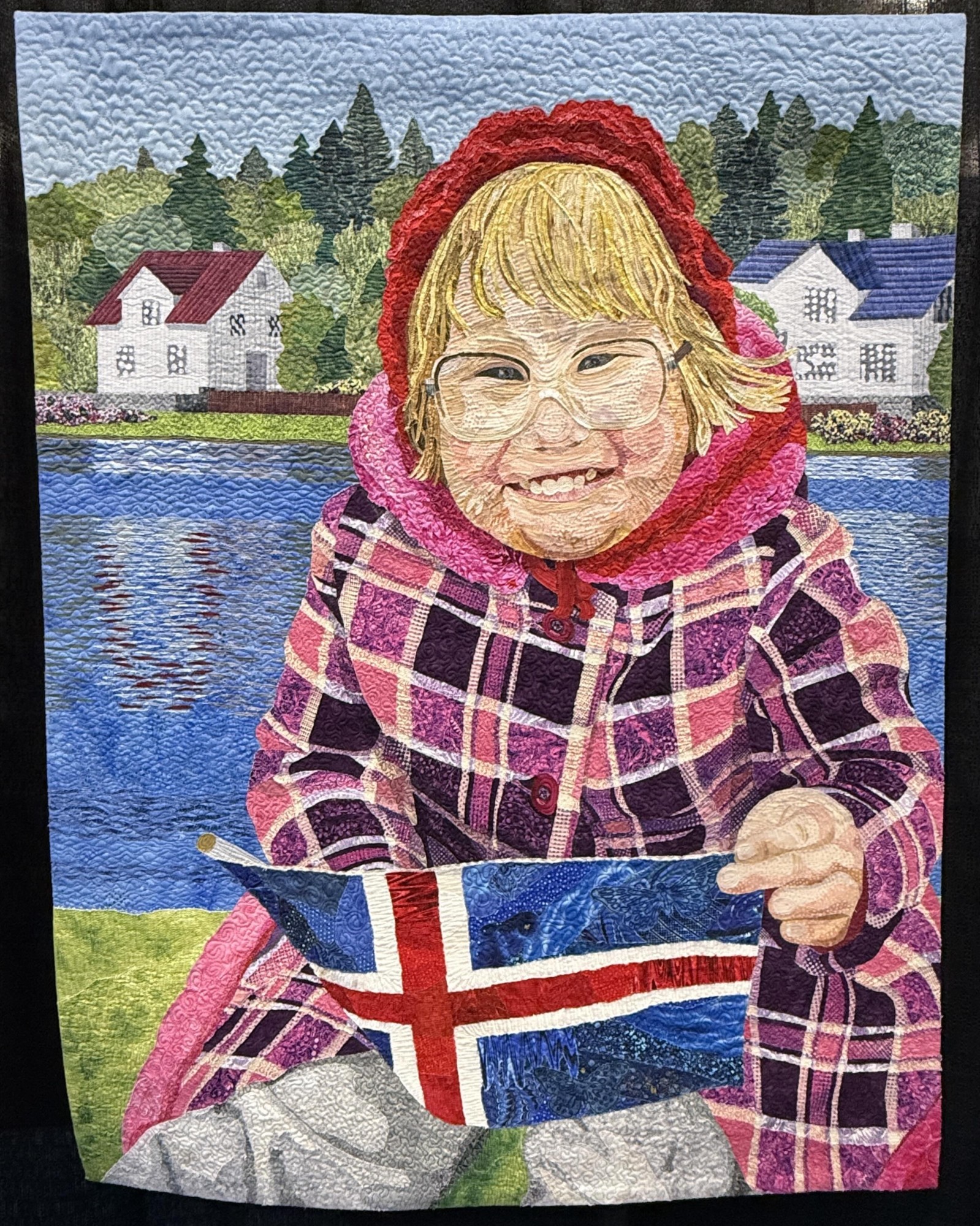Artist Statement: "While living in Iceland many years ago, I attended the National Day (17 June) celebration in Reykjavík with a friend and her young daughter, Björg. This quilt is based on a photo I took that day. Notice how Björg is dressed for this summer holiday - don't you just love that plaid coat, and her great smile? Now Björg is all grown up and will be the eventual recipient of the quilt."