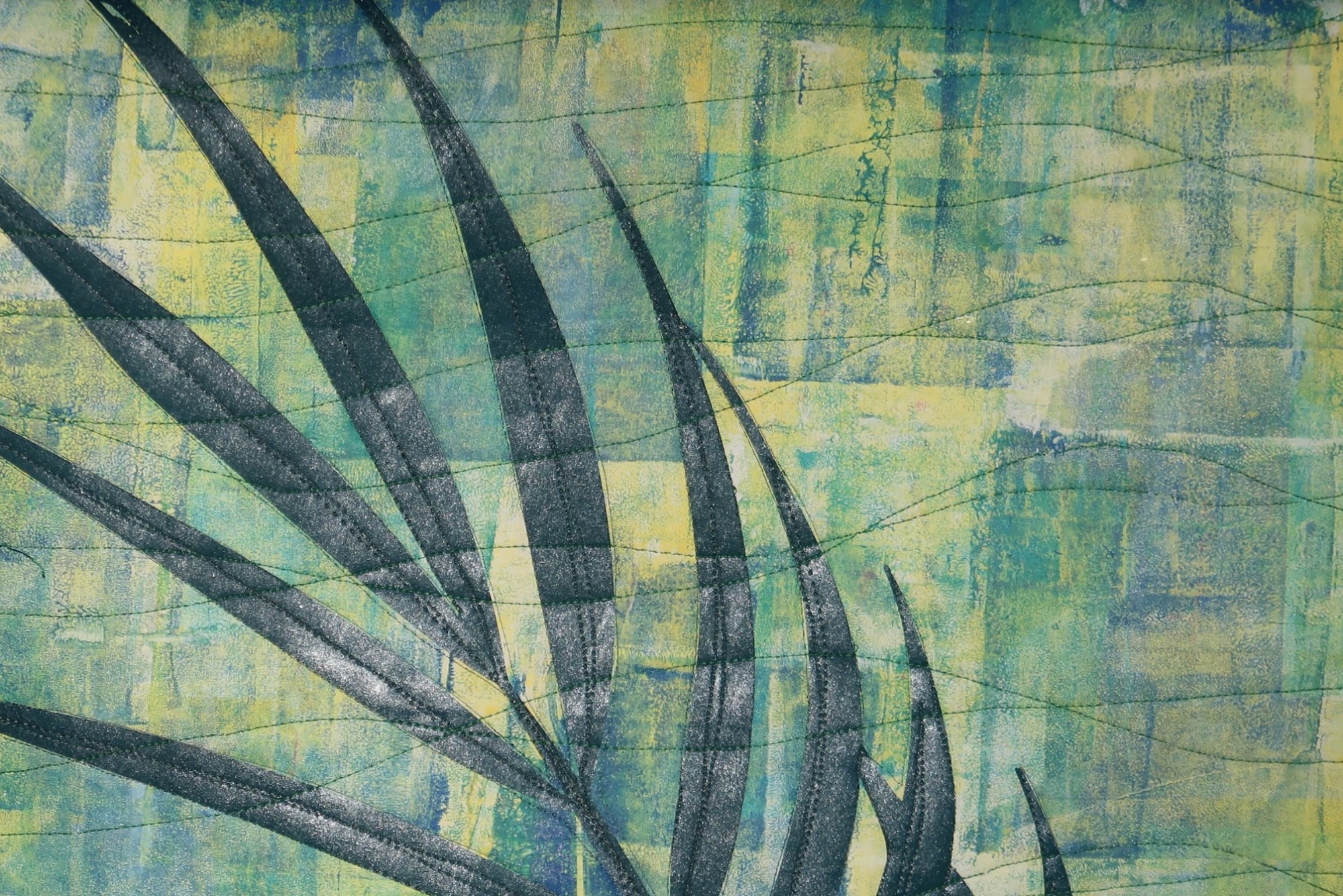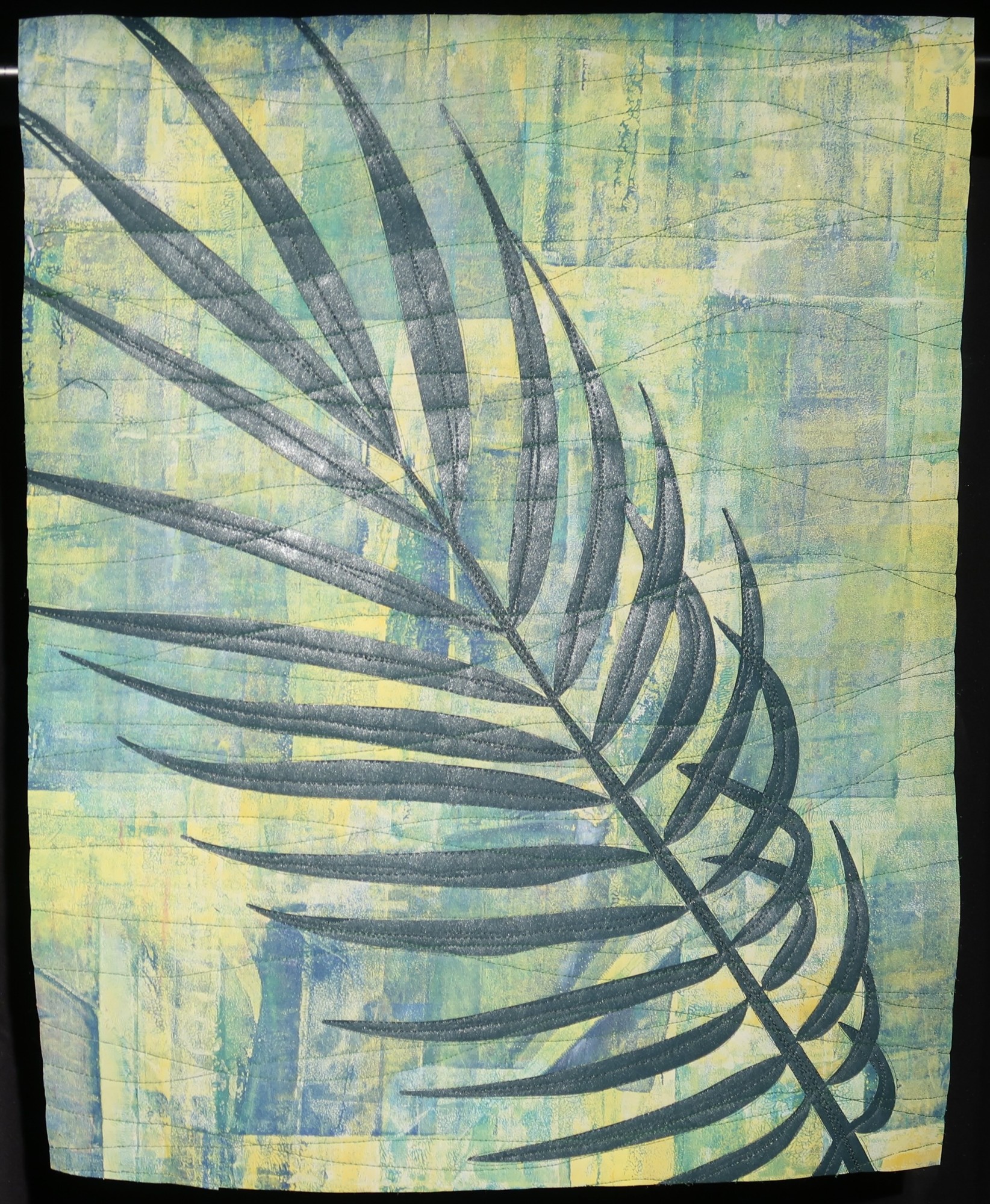 Breezy takes its inspiration from Florida, its palm trees, and Angie's neighbor's great big palm, which was always blowing in the wind. It was created using fused appliqué, with the appliqué cut by Angie using her cutting machine.