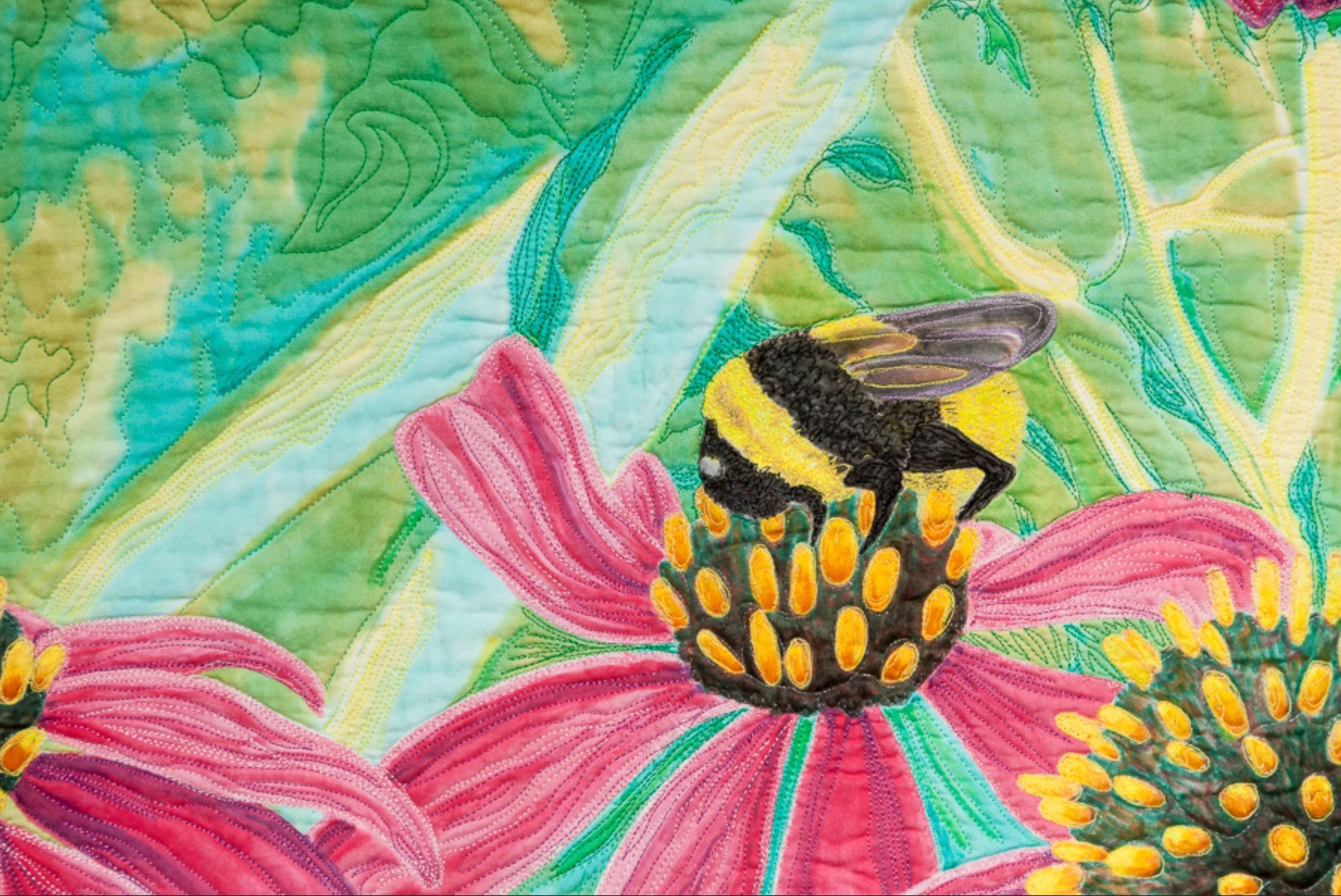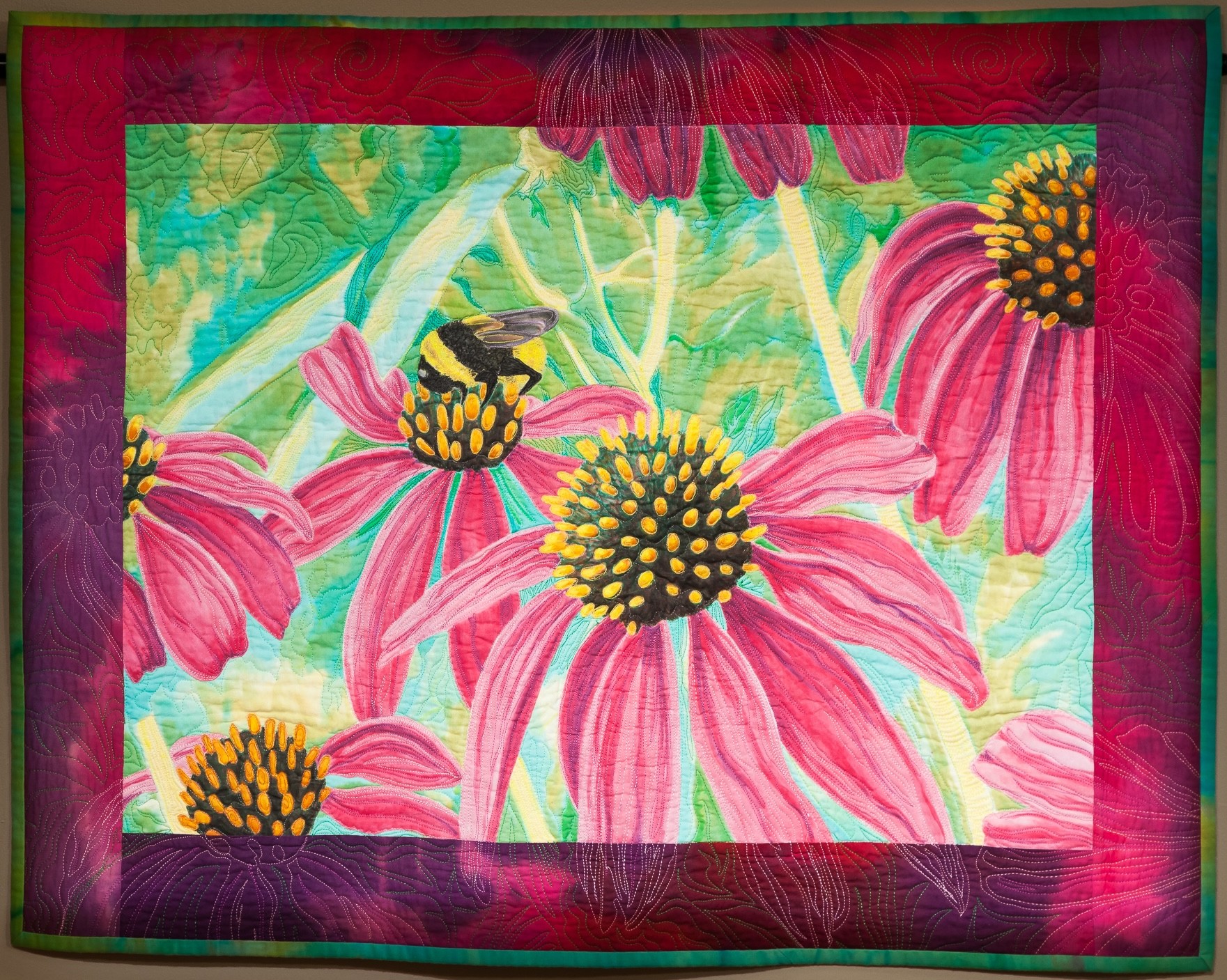 "Bumblebee and Coneflowers" by Carol Morrissey was created using an assortment of both dyed and painted fabrics.
