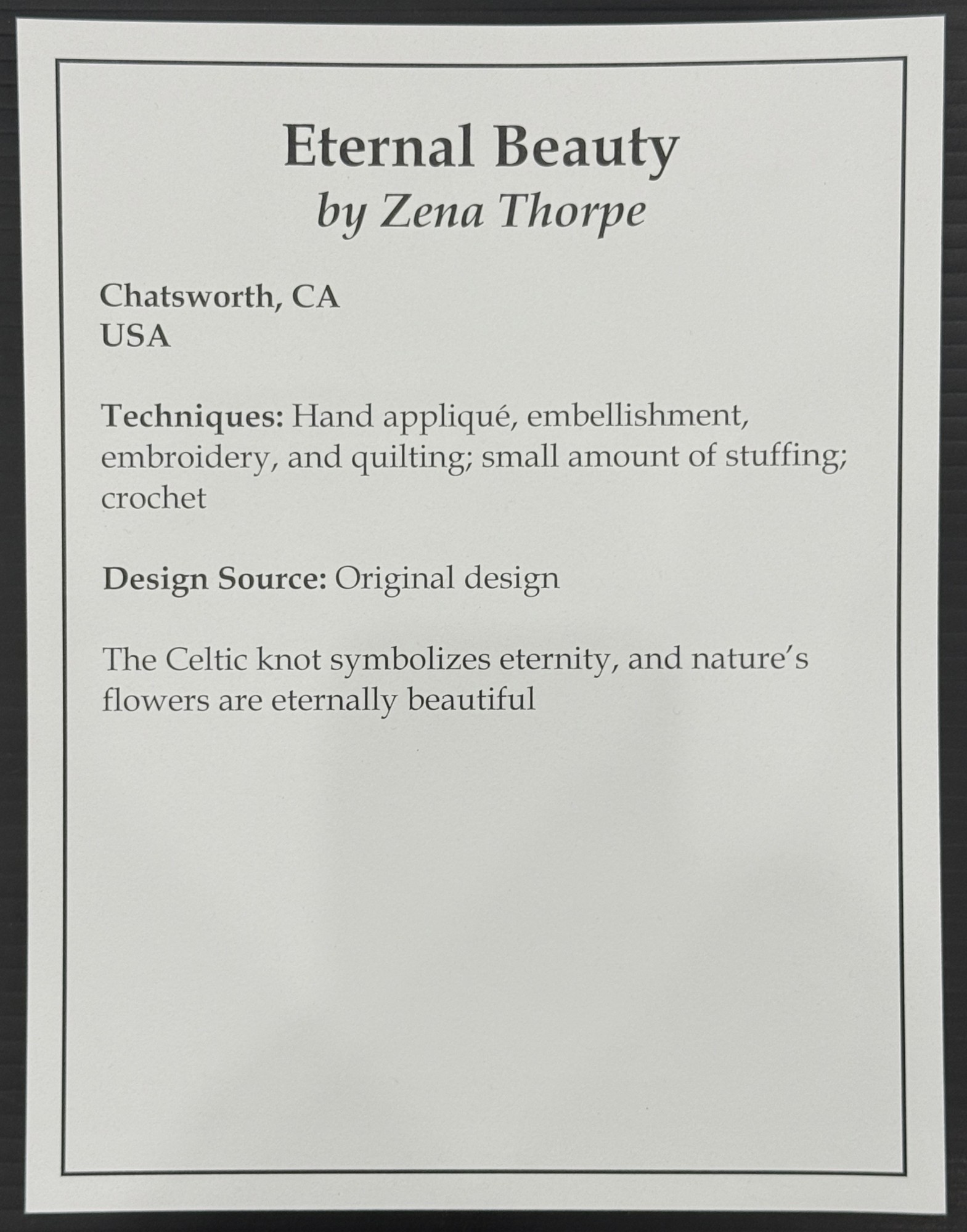 Artist Statement: "The Celtic knot symbolizes eternity, and nature's flowers are eternally beautiful."