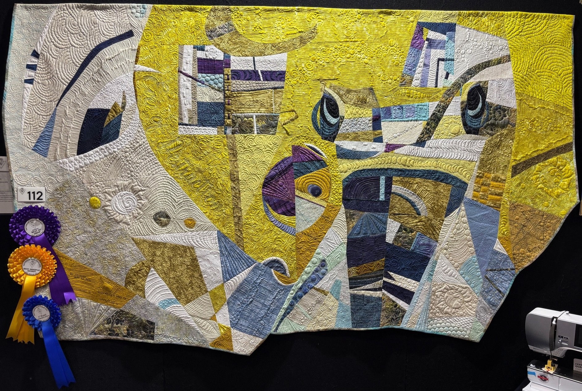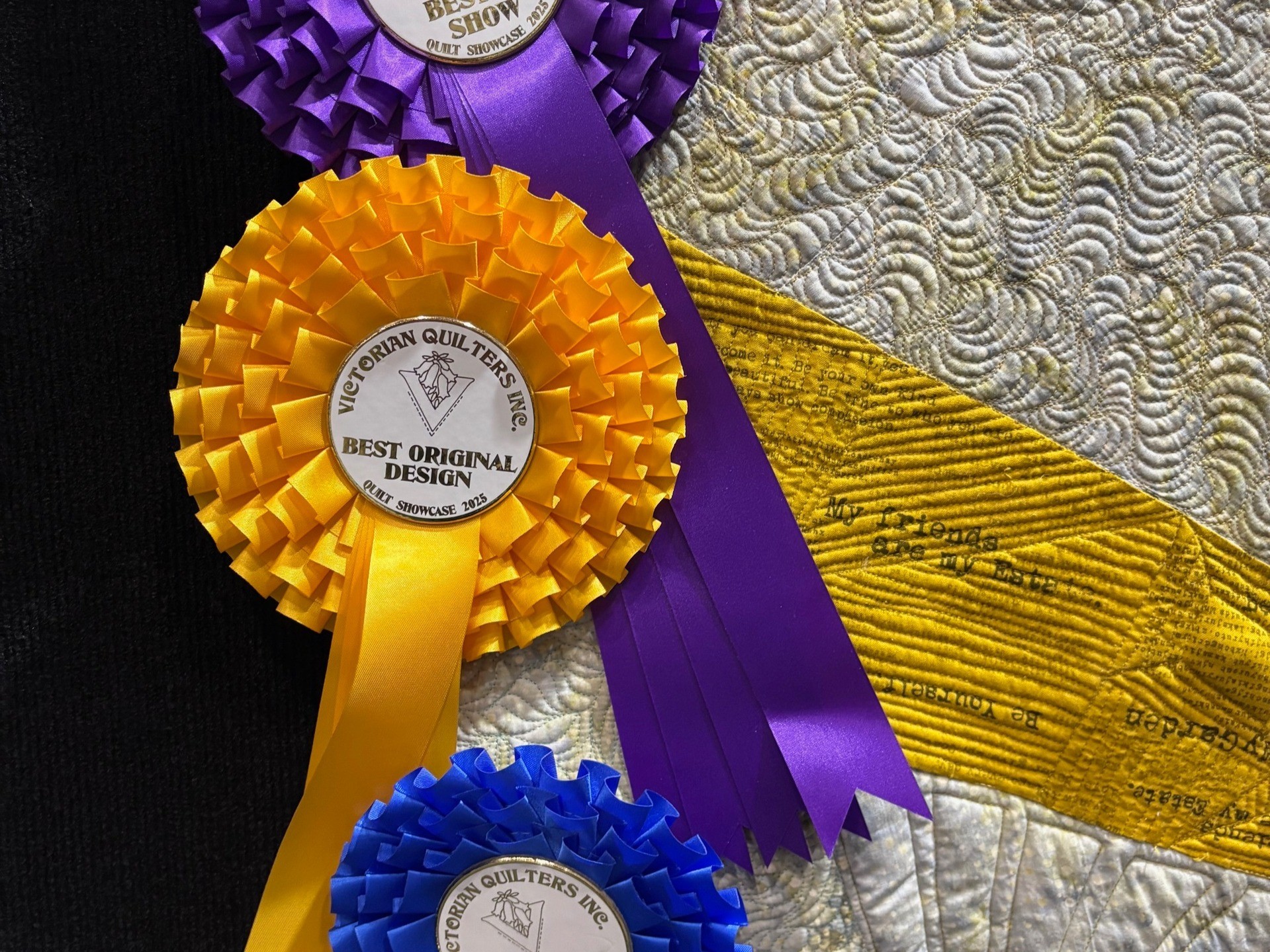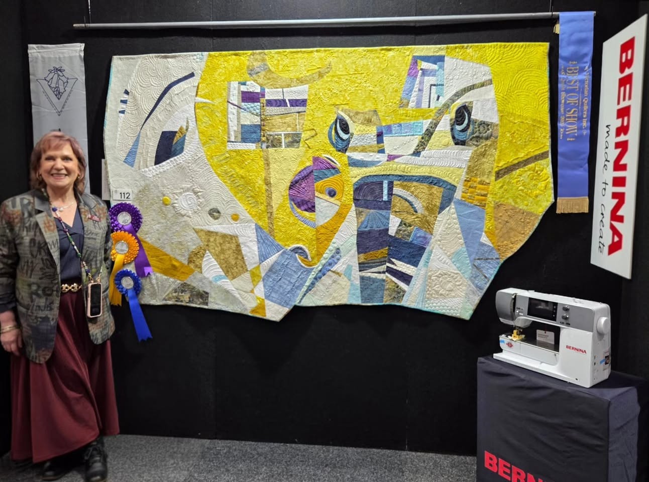 (Main Quilt Photo, Viewed from a Distance Photo, Sue and Friends with Quilt Photo, and Ribbons Photo from victorianquiltersaus Instagram; Detail Photo, sign Photo, and Sue alone with Quilt Photo from Craft.Events Facebook Page)