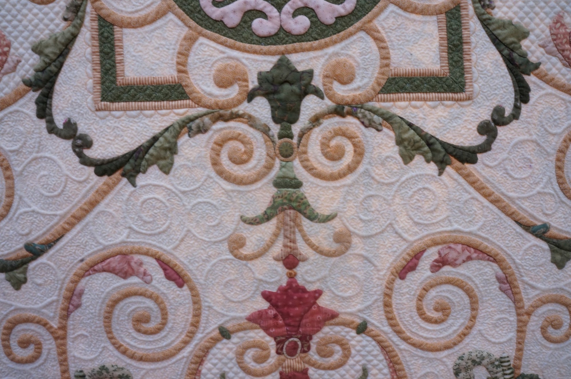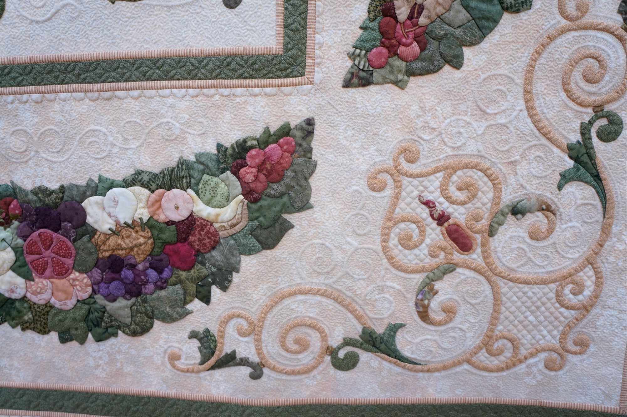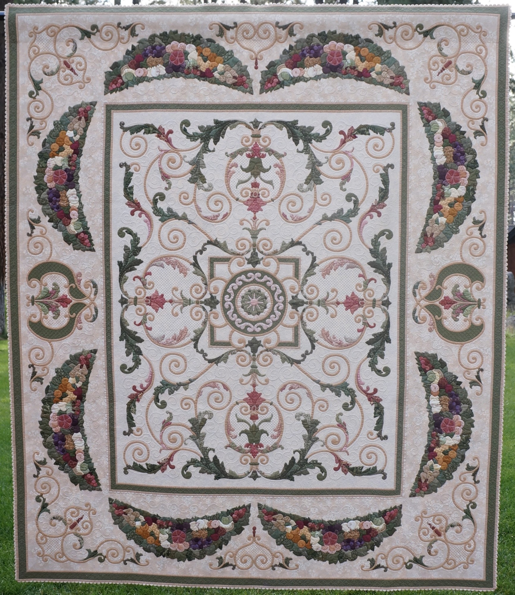 Flourish on the Vine is Kathy's favorite quilt. She loves the colors, the shapes, and the wrought iron design elements she created in her layout. She says, "For this heirloom-quality quilt, the vines and branches were inspired by wrought ironwork, and the bordering swags were imagined from festoons of fruit, as seen in Roman Empire temples." Kathy's quilt has won many awards, including the IQA Founders Award at the 2011 Quilts: A World of Beauty show and 1st Place, Wall Quilts - Home Machine Quilted at AQS QuiltWeek - Lancaster in 2013.