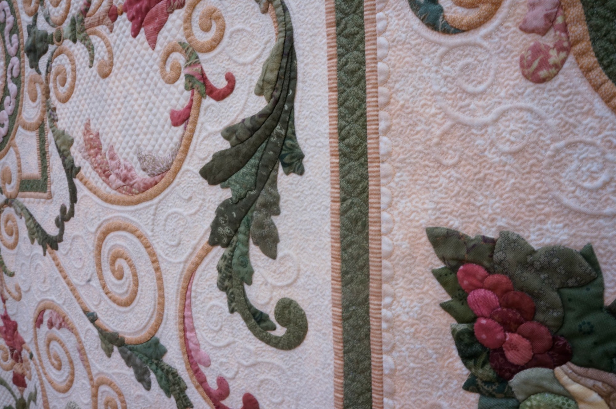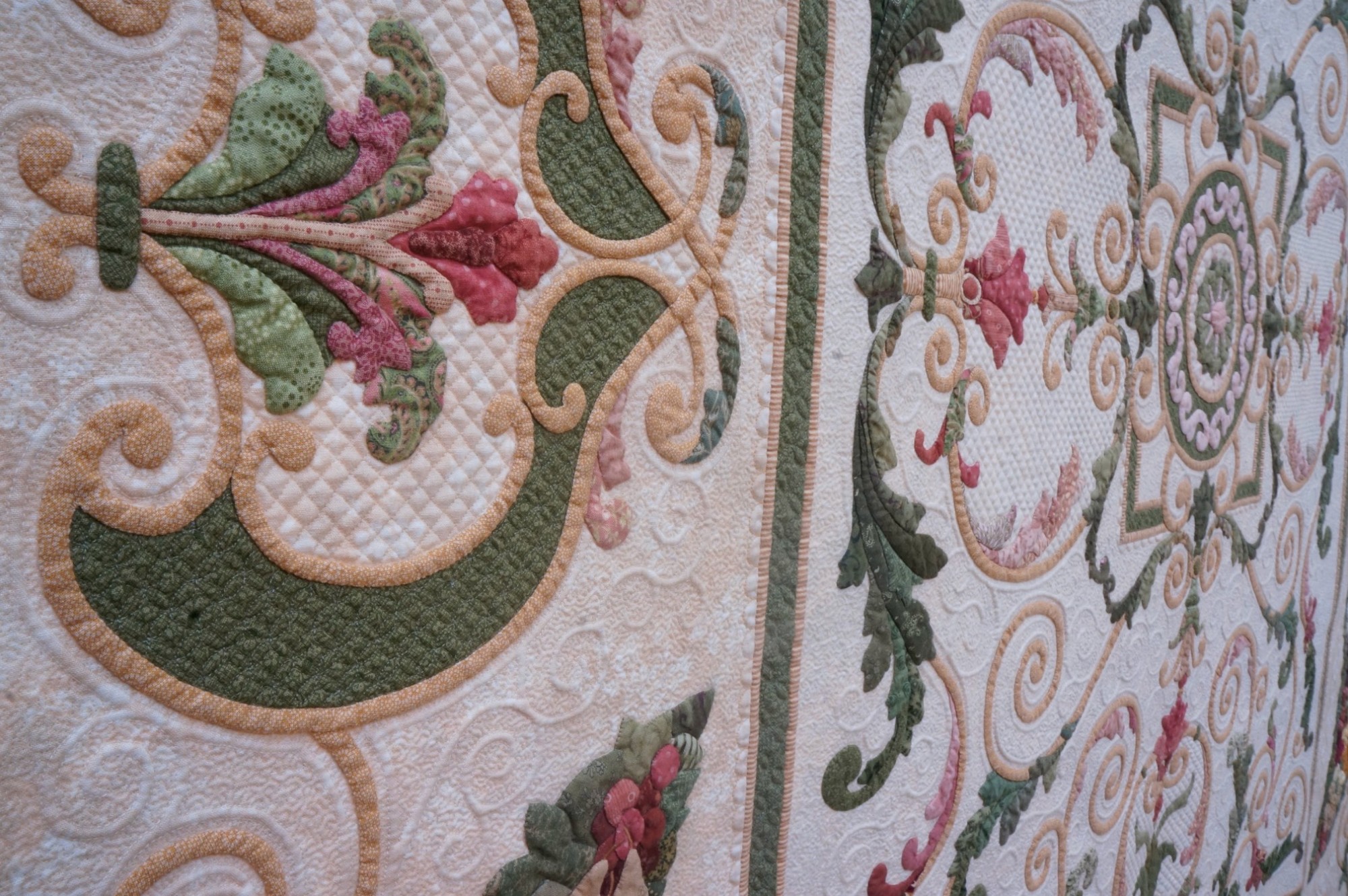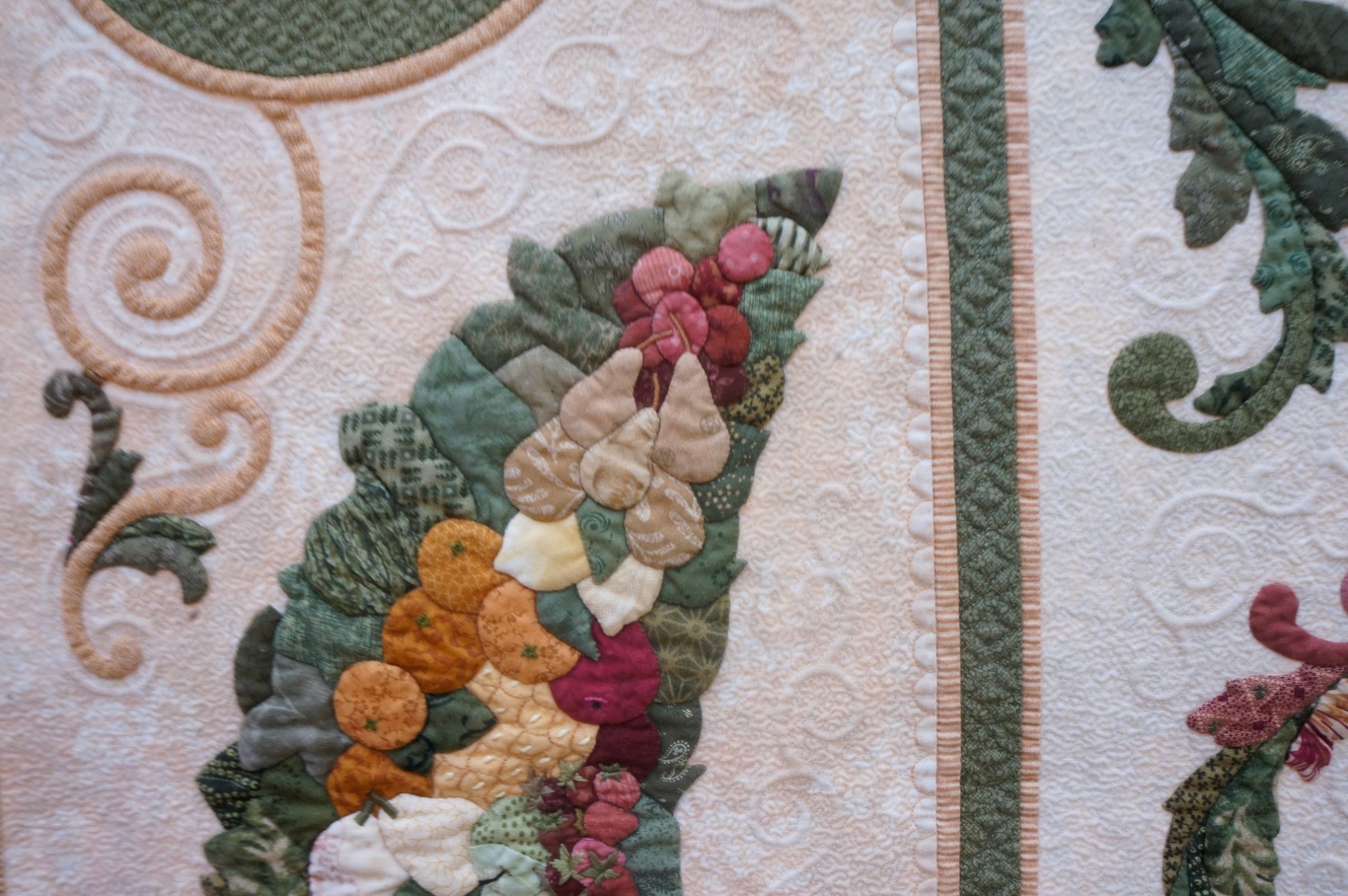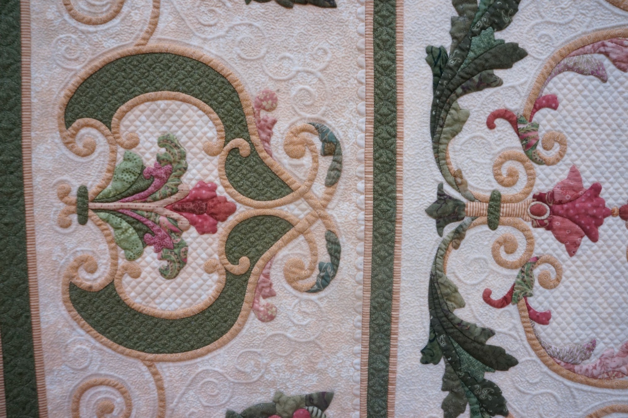Flourish on the Vine is Kathy's favorite quilt. She loves the colors, the shapes, and the wrought iron design elements she created in her layout. She says, "For this heirloom-quality quilt, the vines and branches were inspired by wrought ironwork, and the bordering swags were imagined from festoons of fruit, as seen in Roman Empire temples." Kathy's quilt has won many awards, including the IQA Founders Award at the 2011 Quilts: A World of Beauty show and 1st Place, Wall Quilts - Home Machine Quilted at AQS QuiltWeek - Lancaster in 2013.