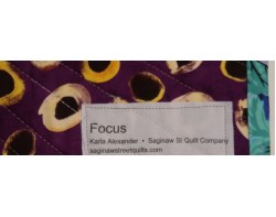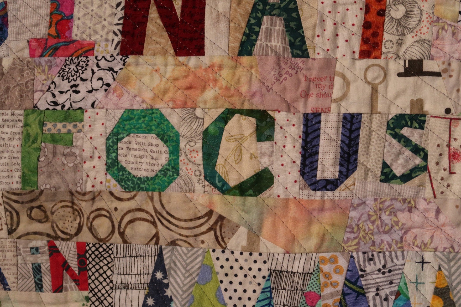 The words featured on Karla's quilt, Focus, state, "You cannot depend on your eyes when your imagination is out of focus," which is a quote by Mark Twain. Playing off the idea of not being able to depend on your eyes, Karla structured the words as if you were to read them off of an eye chart, with the letters at the top being larger and then getting smaller as you go down the quilt.