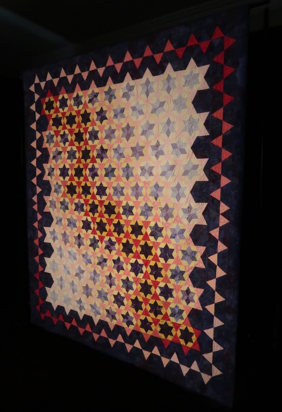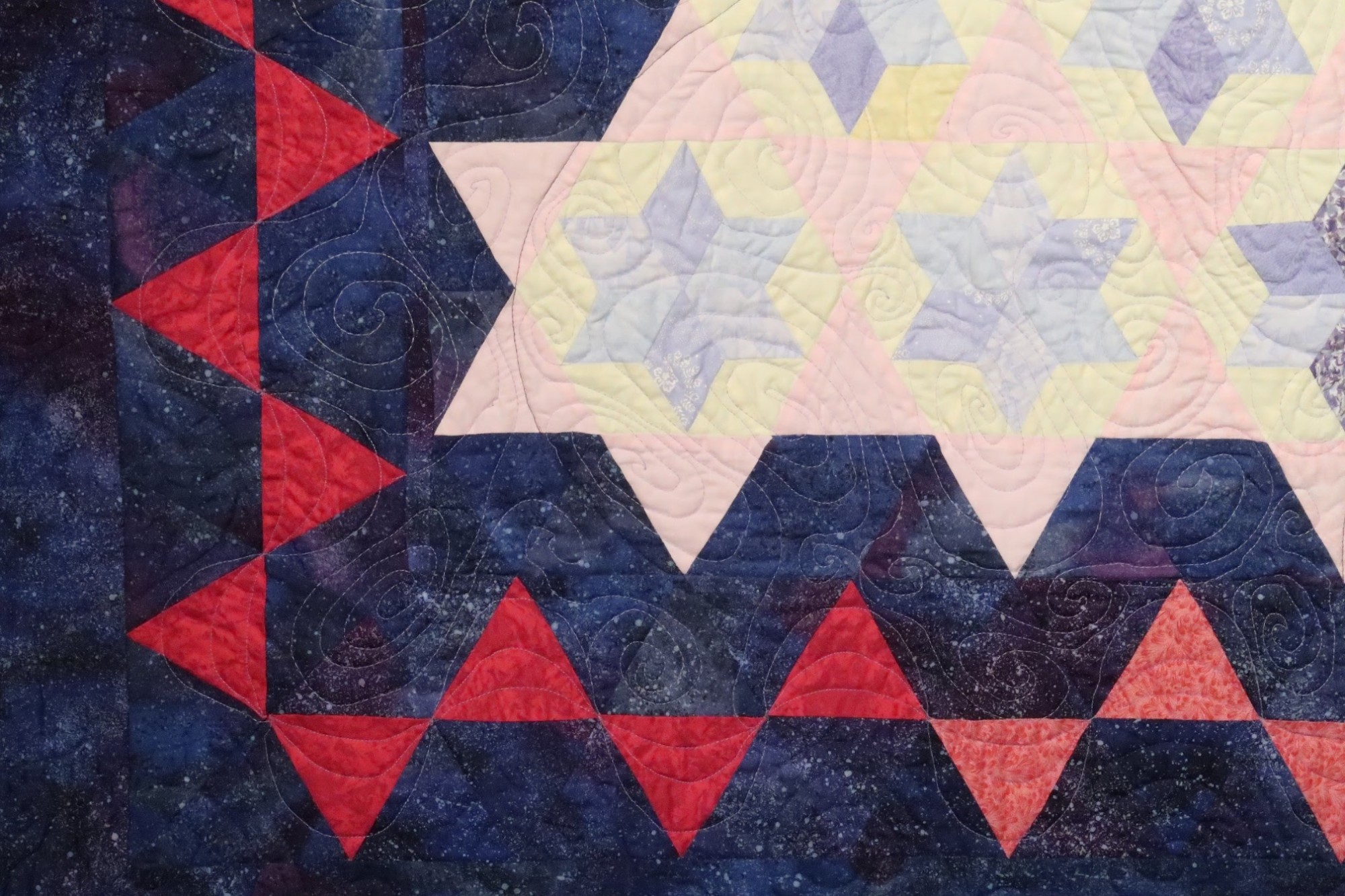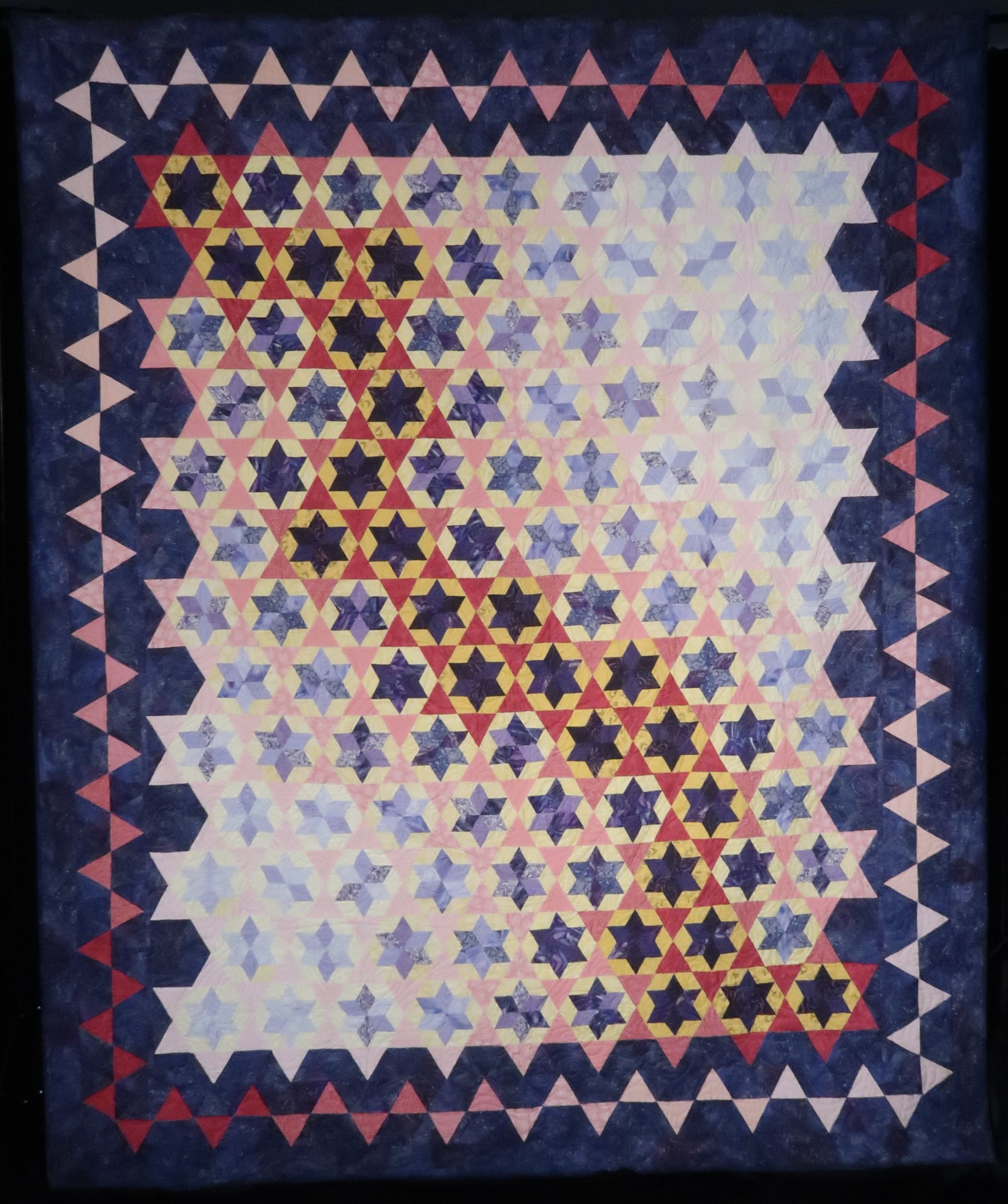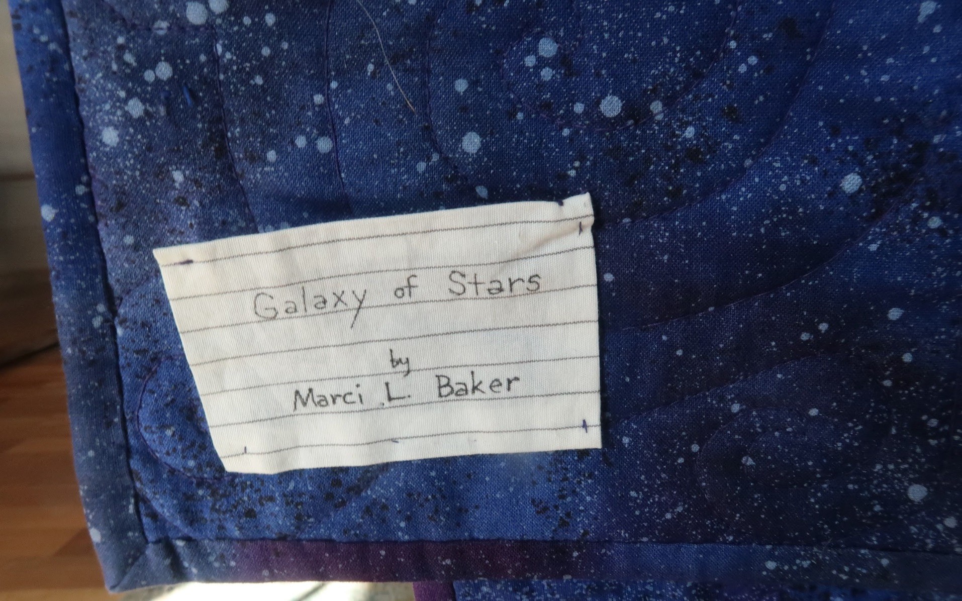 Galaxy of Stars features Marci's first use of quilting that she did on a large quilt on her home machine. It was photographed for a magazine and several other places, including Joen Wolfrom's color book. Galaxy of Stars ended up being Marci's son's wedding present, whose saying for his wedding was, "written in the stars."