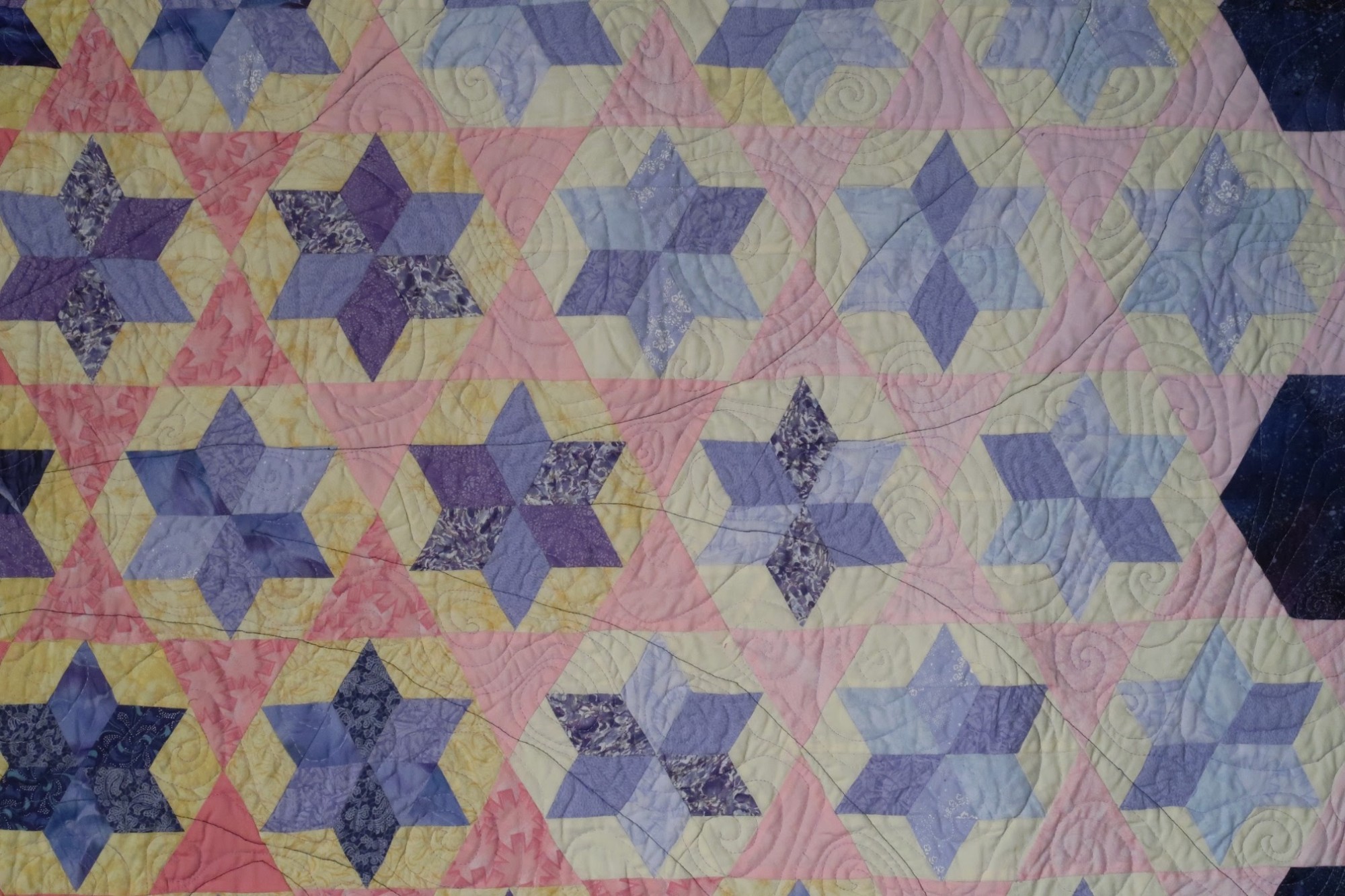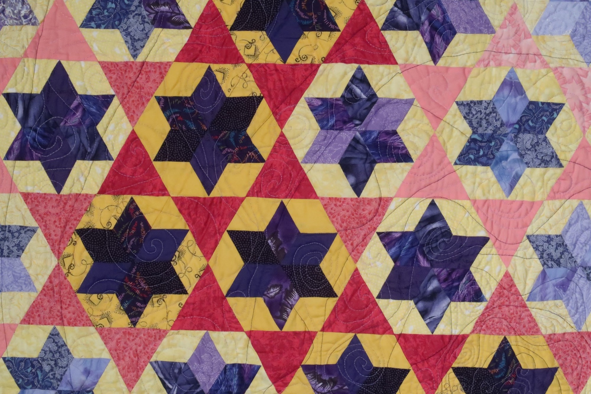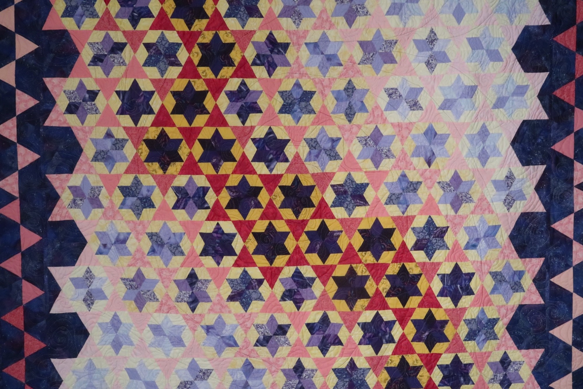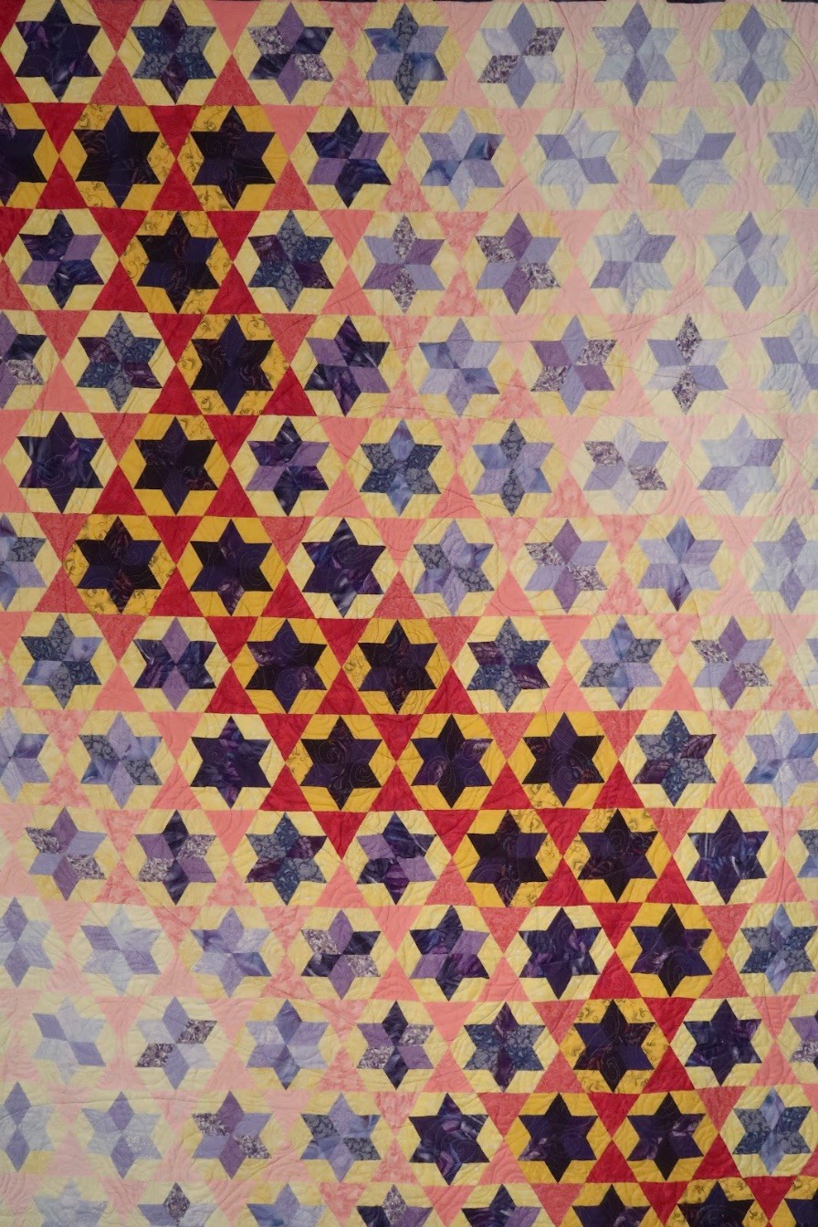 Galaxy of Stars features Marci's first use of quilting that she did on a large quilt on her home machine. It was photographed for a magazine and several other places, including Joen Wolfrom's color book. Galaxy of Stars ended up being Marci's son's wedding present, whose saying for his wedding was, "written in the stars."